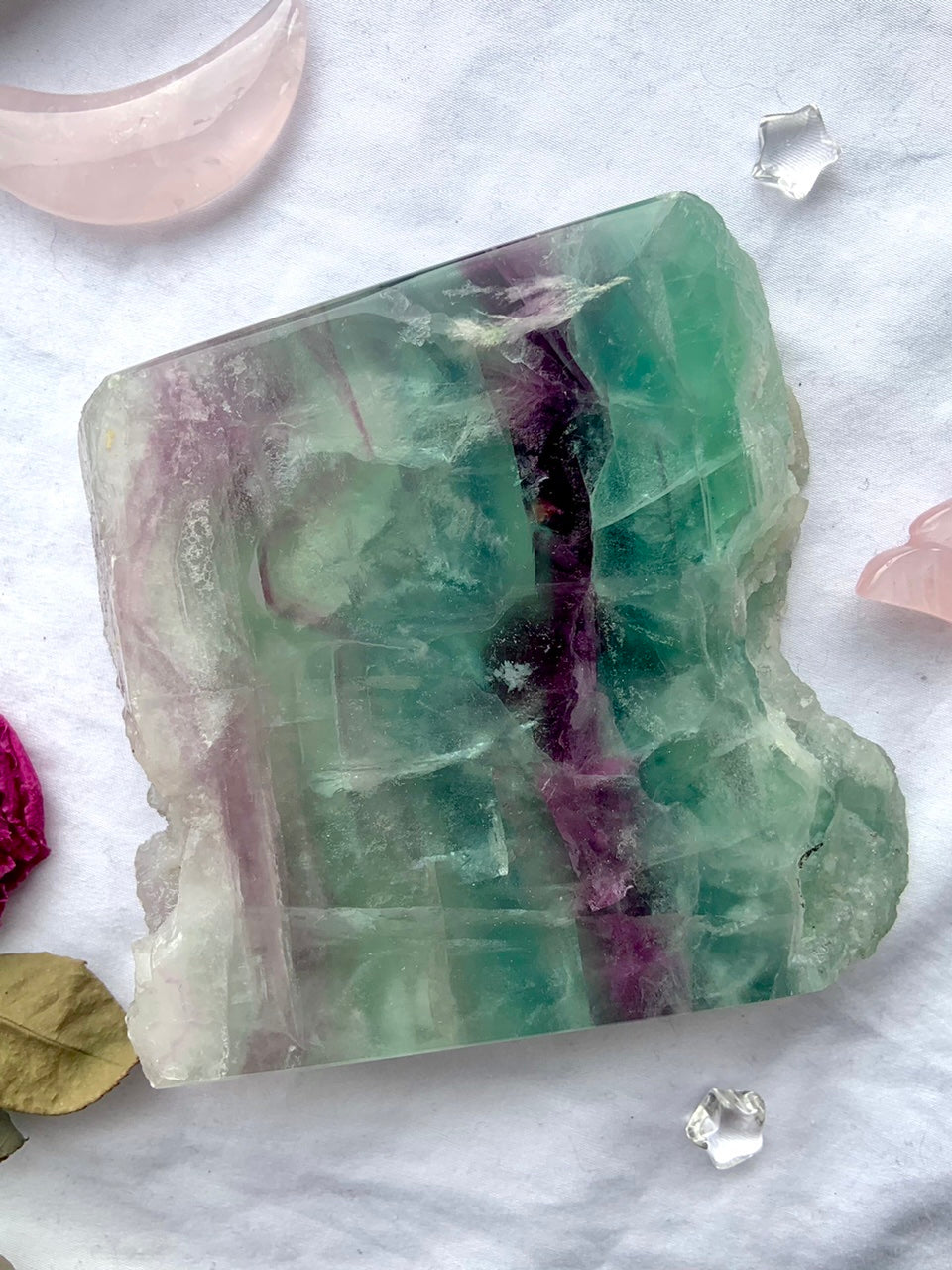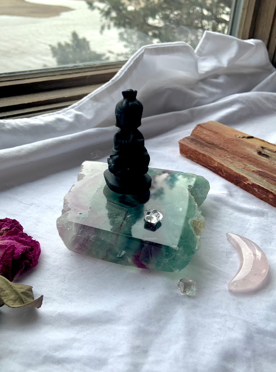 Fluorite has a grounding + harmonizing spiritual energy. Feel the grounding energy come through the natural stone edges + the glossy polished sides.