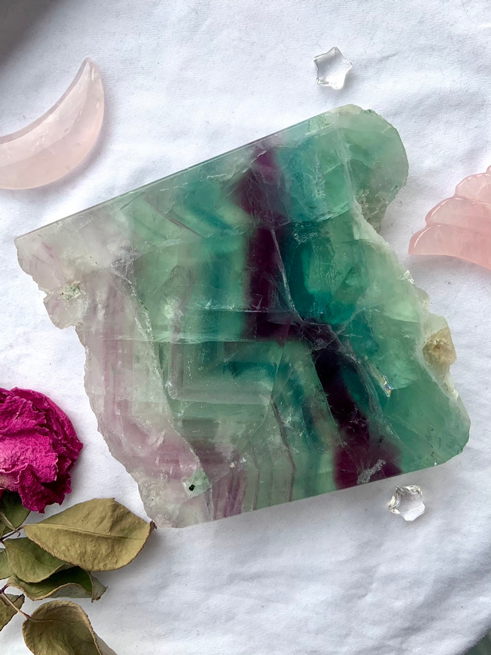 Natural stones may have inherent marks, mineral inclusions, or slight imperfections. Weights + measures are approximate. You will receive the exact crystal slab that you see in the pictures. Weights + measures are approximate.