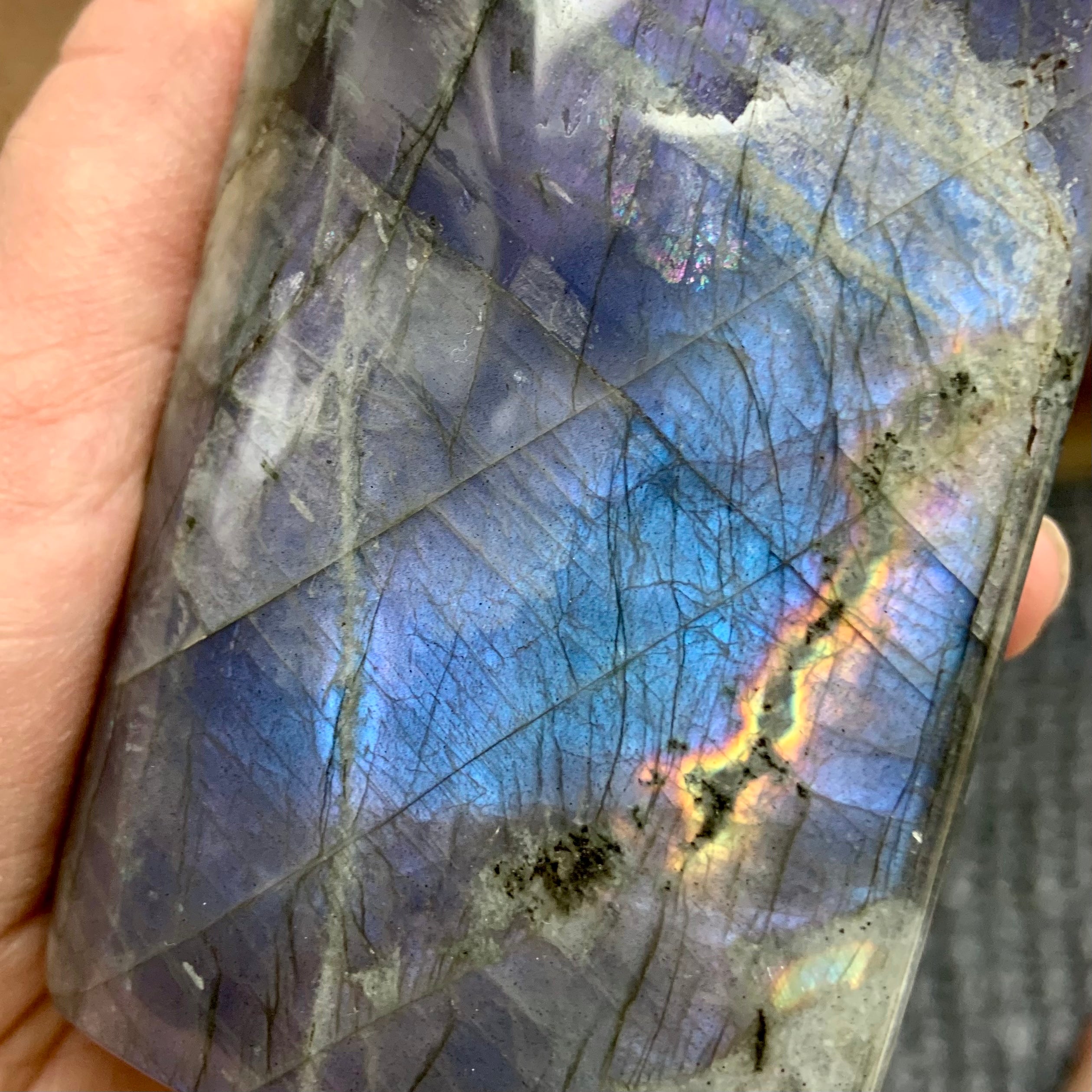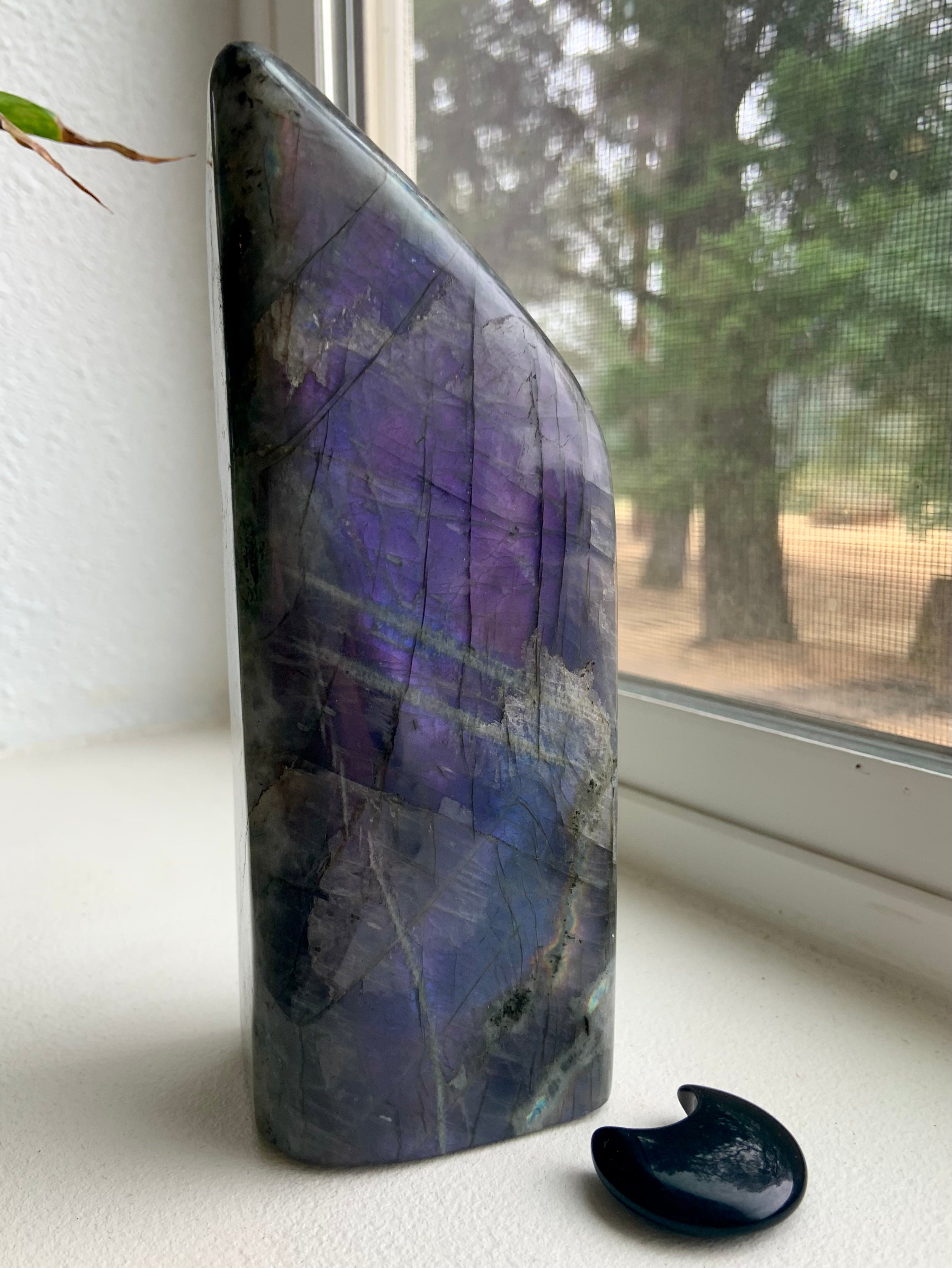 Natural crystals may have inherent marks, mineral inclusion, or slight imperfections. Weights + measures are approximate. You will receive the exact labradorite specimen that you see in the pictures.