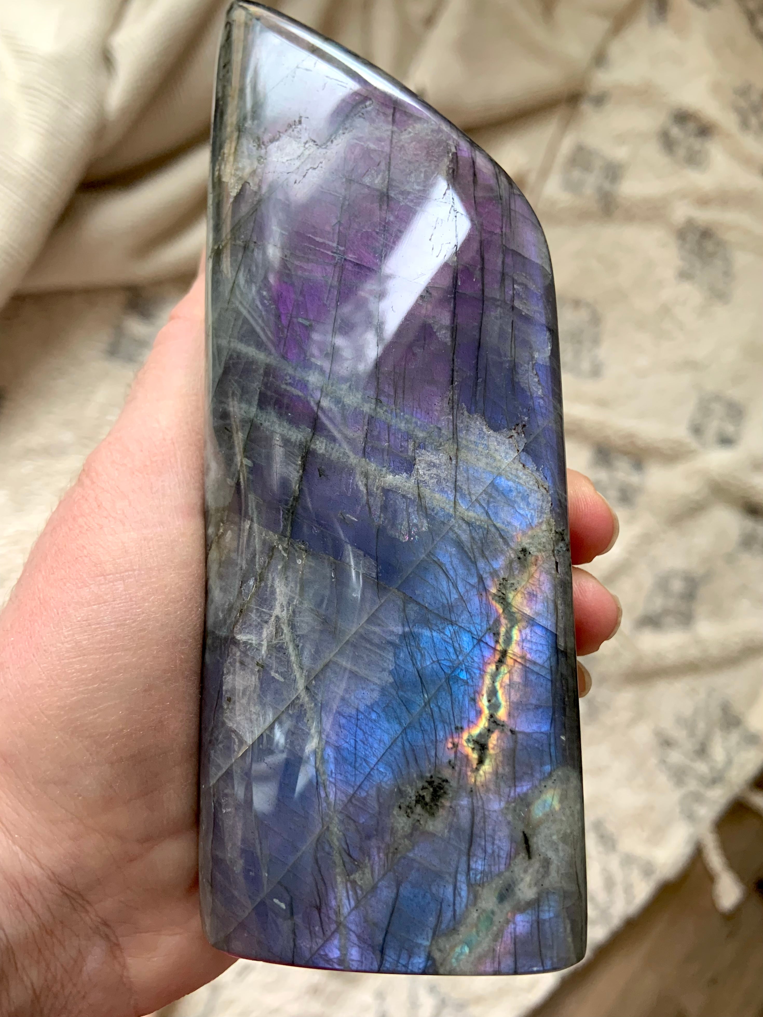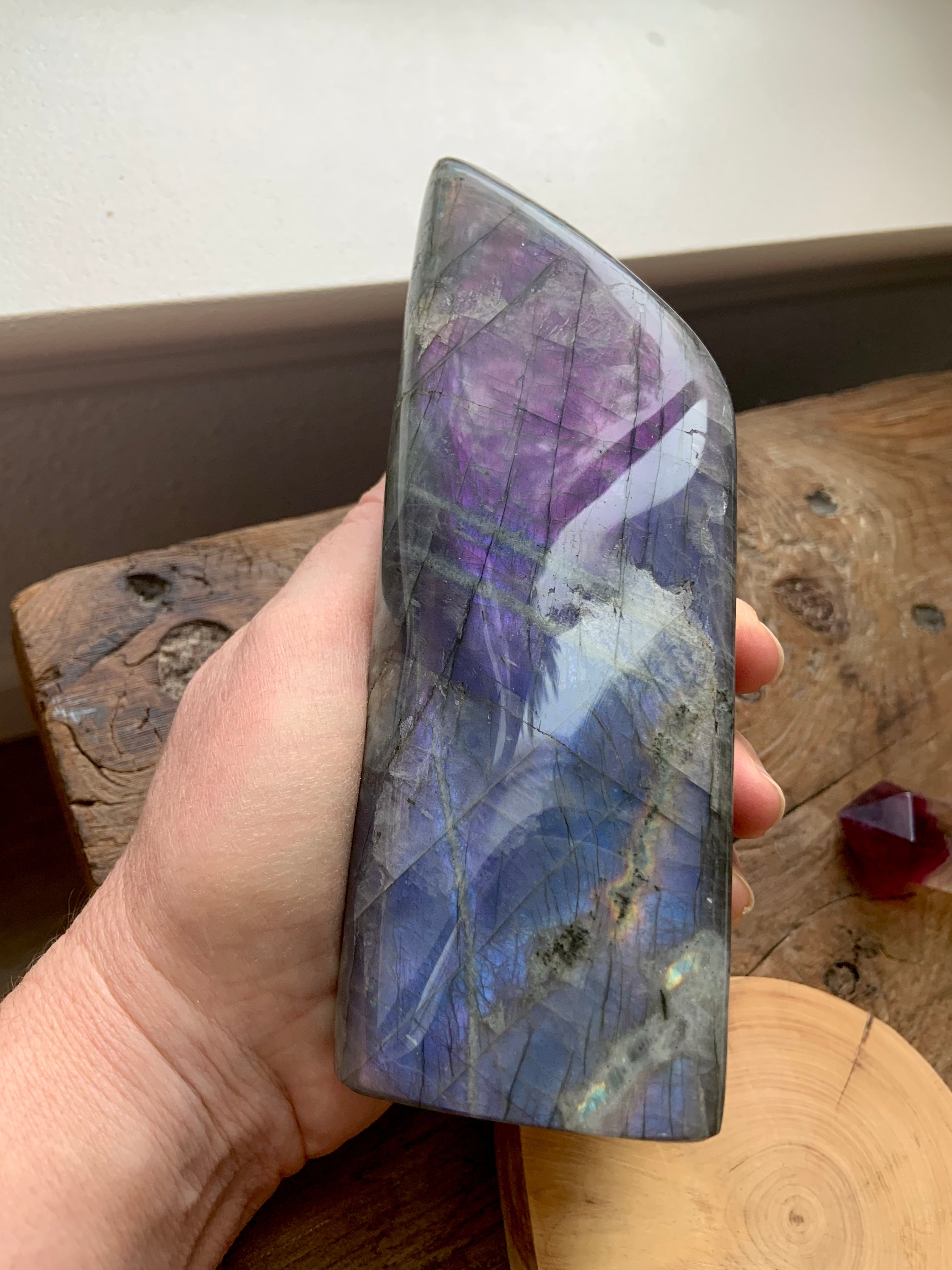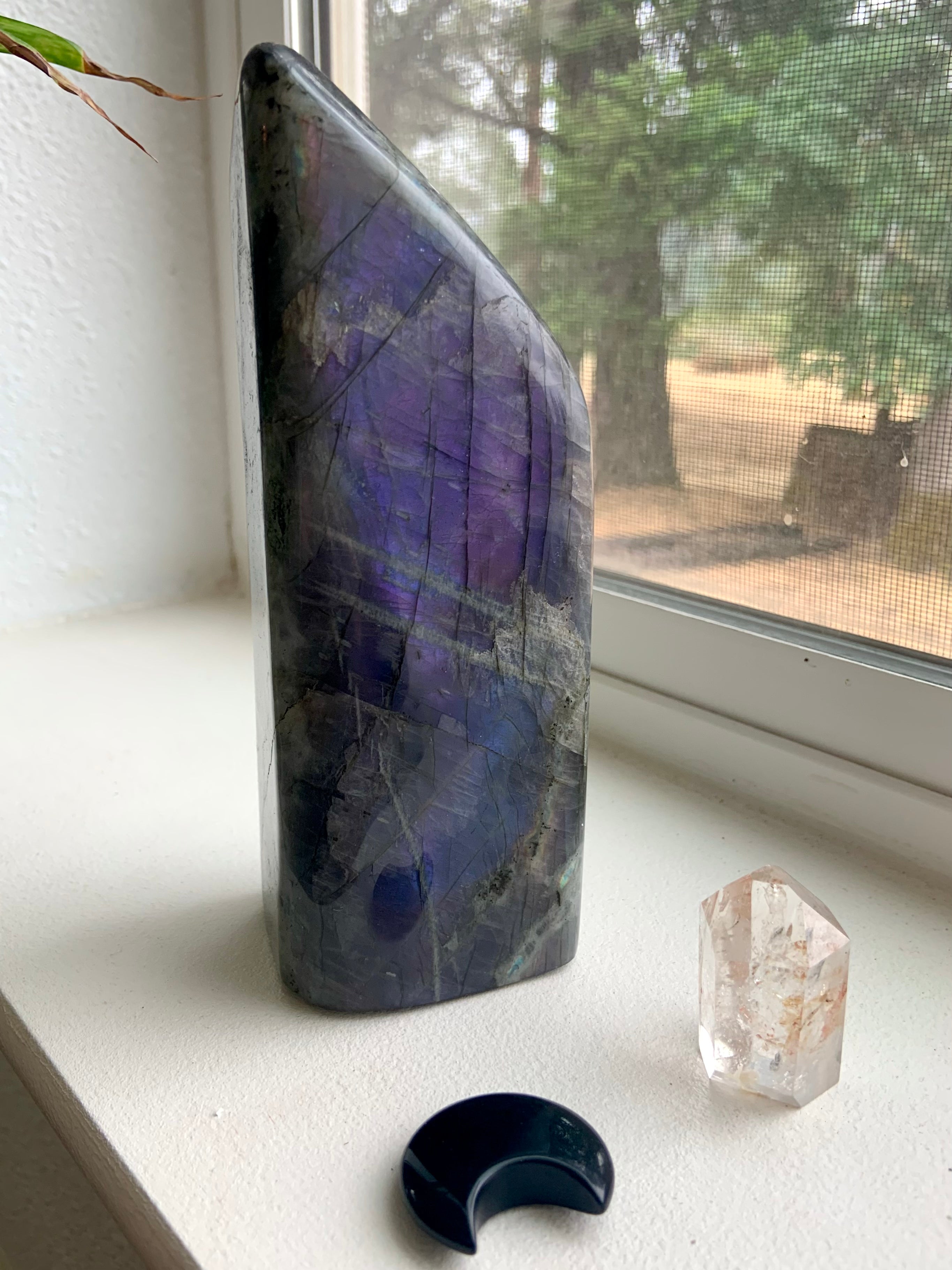 This is a large, rare labradorite crystal specimen with a stunning presence will make a gorgeous addition to your crystal collection + elevate your sacred space. A lovely statement piece for your mantle, bedside table, meditation space, treatment room, or as a focal piece in your crystal decor.