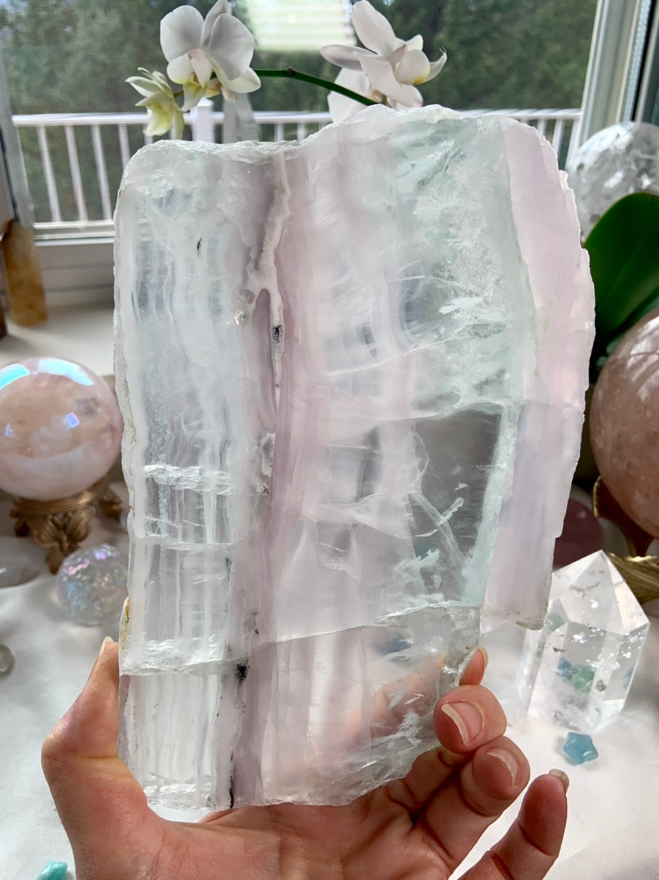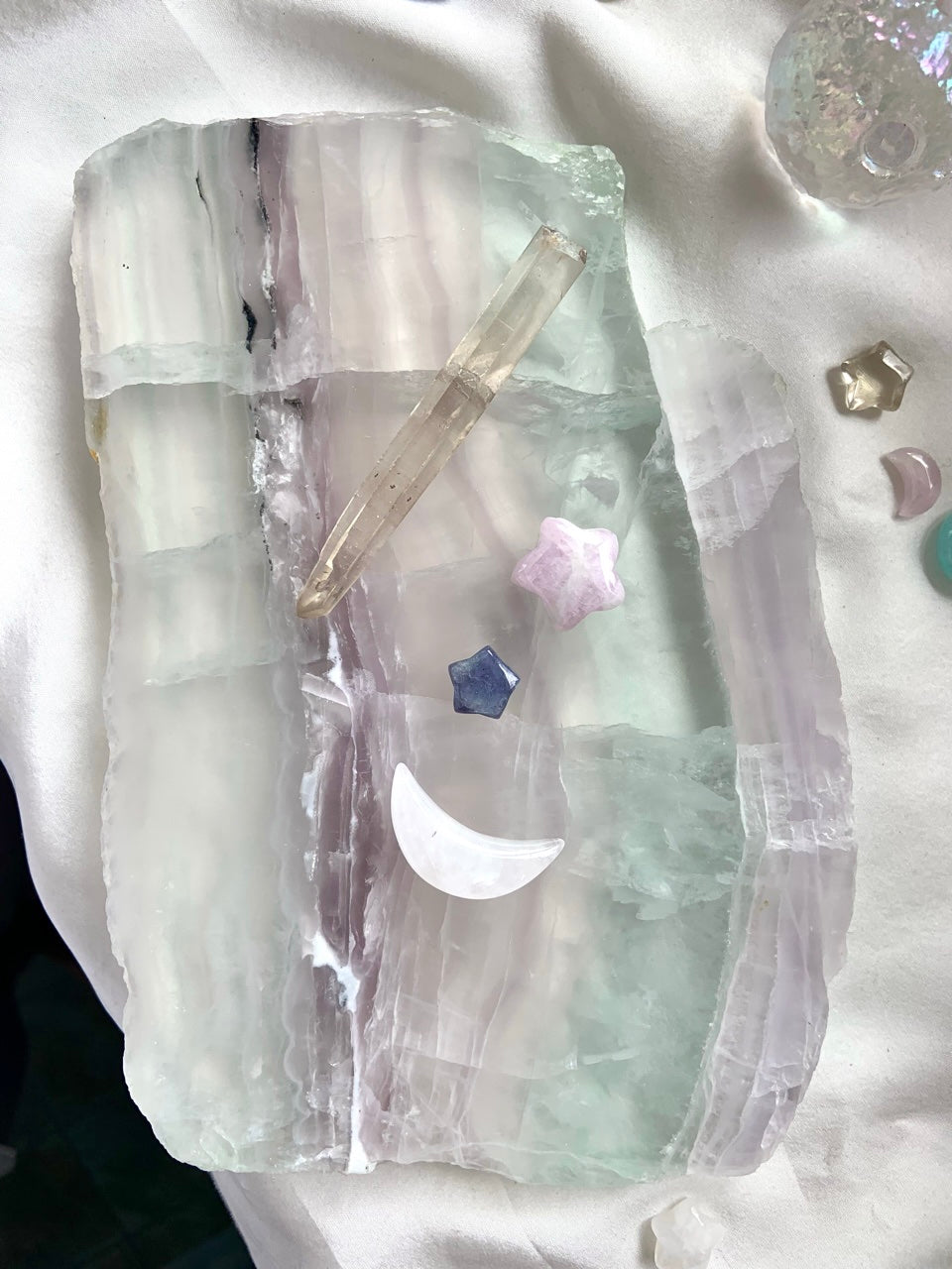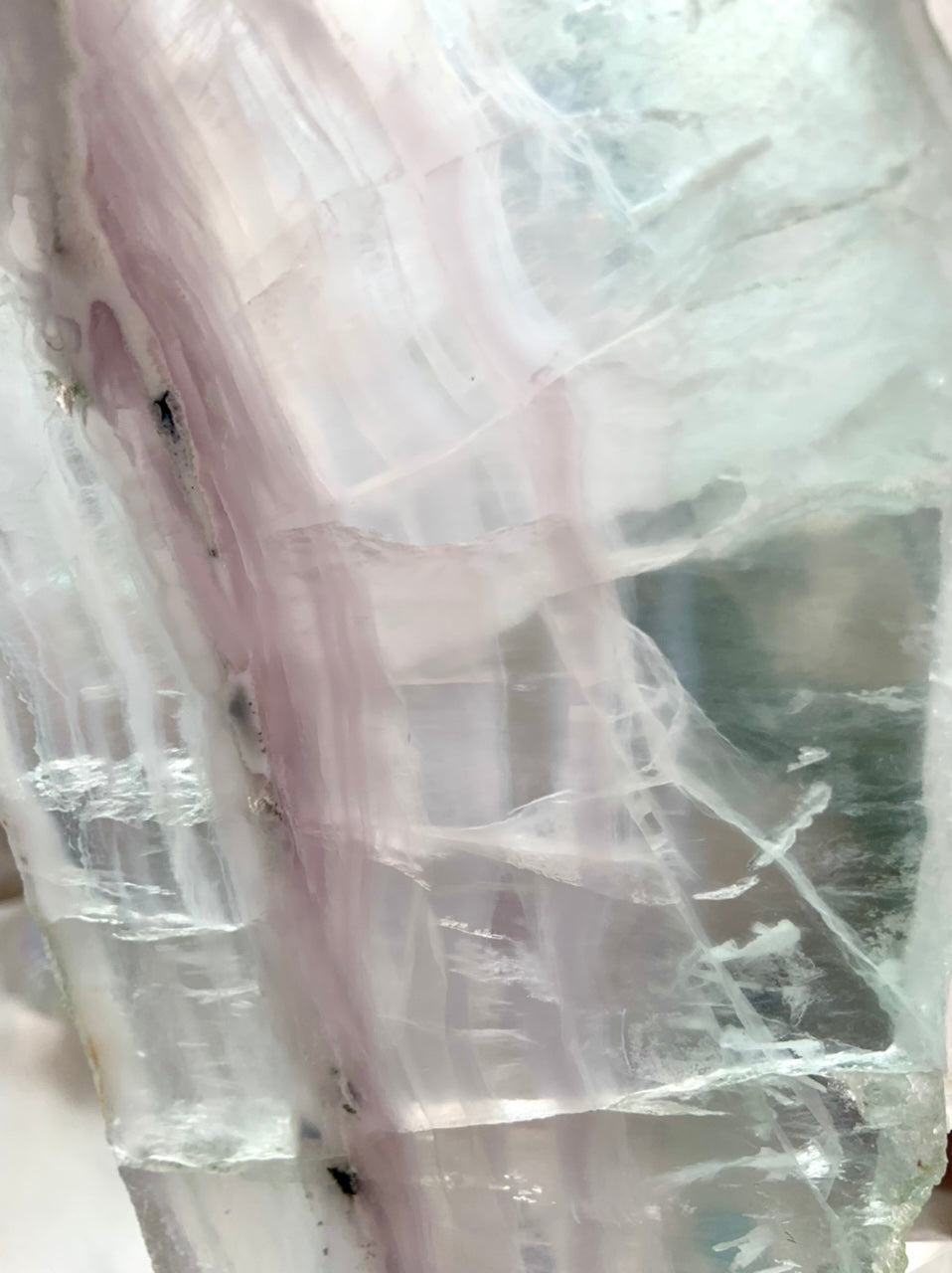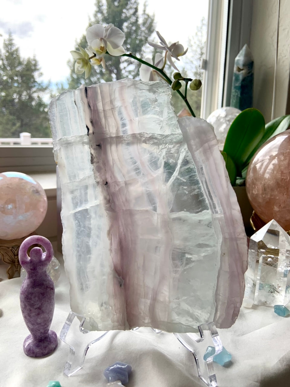 Use the large polished Yttrium Fluorite crystal slab as a beautiful high vibe surface to display special pieces in your crystal collection, your jewelry, heirlooms + treasures. Or display it on a stand + allow the light to pass through the dreamy pastel layers of this rare variety of fluorite.