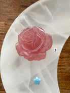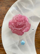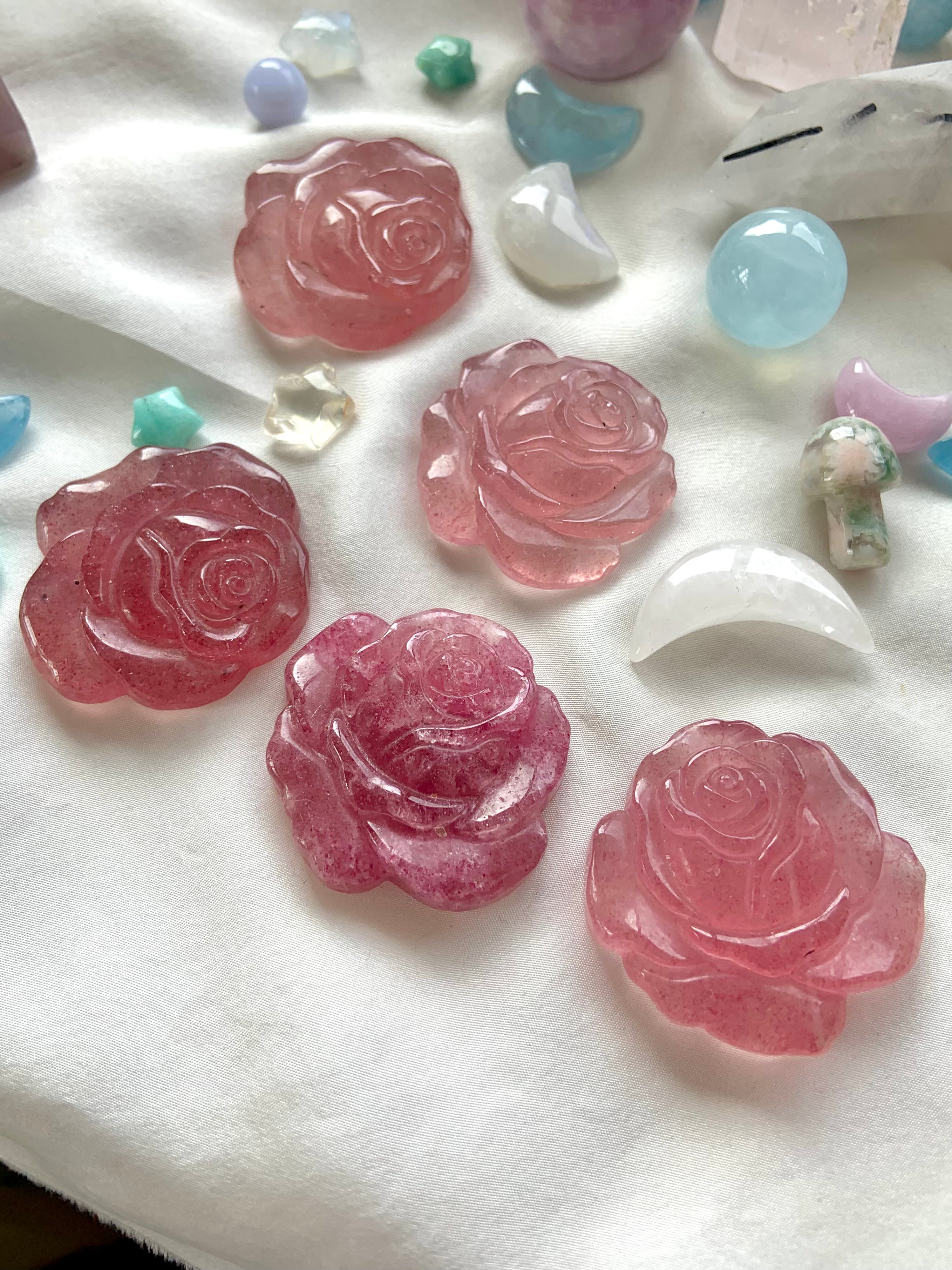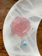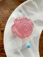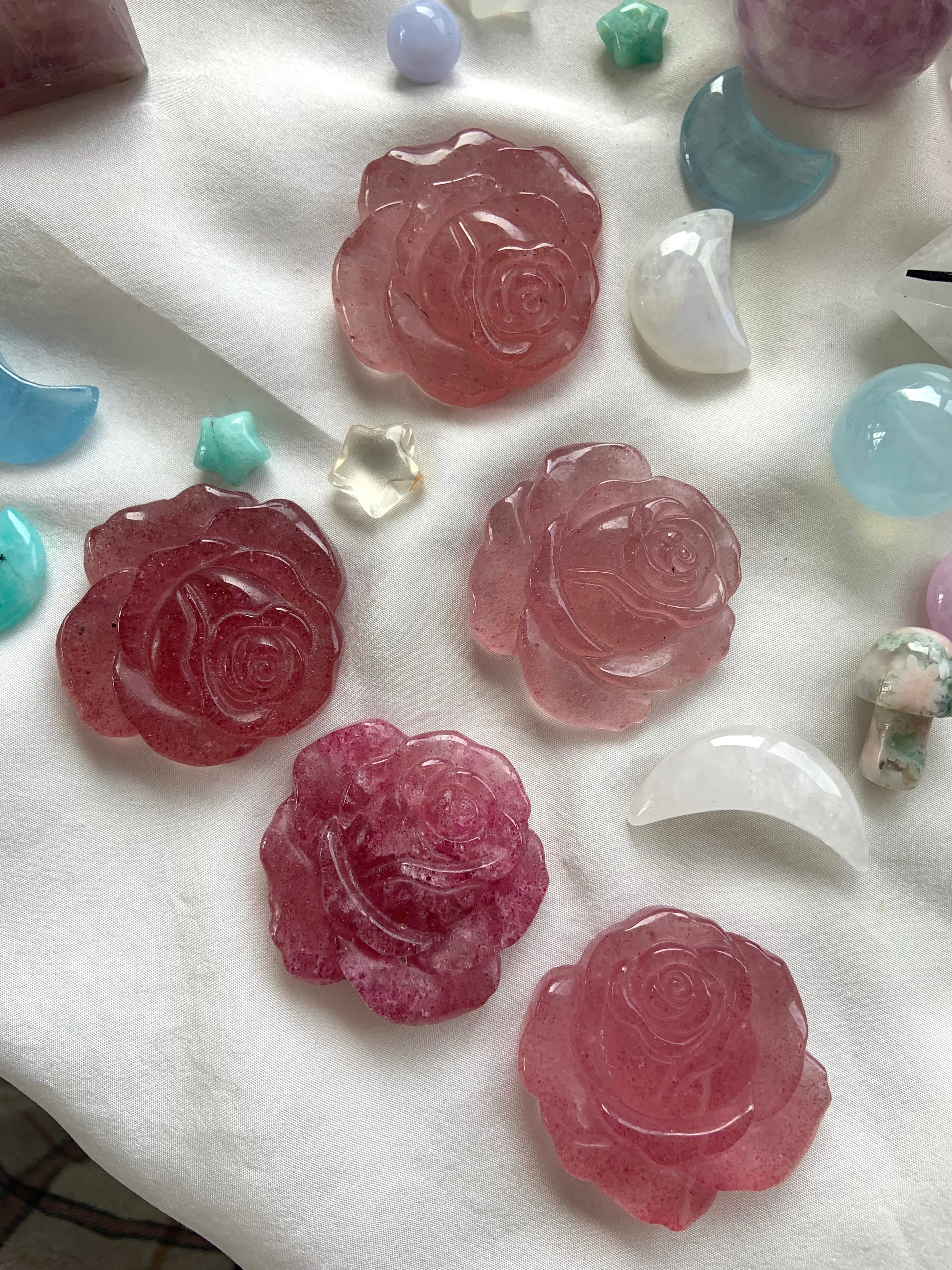 Hand carved from a pretty pink crystal called Strawberry Quartz with lovely details, these crystal roses would fit well as the centerpiece in your crystal grid designs + be a treasured + thoughtful gift for any crystal collector or plant lover.