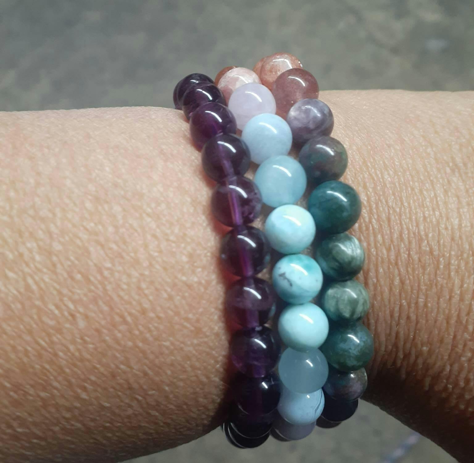 You will receive 1 stackable stretchy bracelet in the size you select from the drop down menu made from the beads you see in the pictures. These bracelets are made of natural stones with unique variances in shape, size, interior patterns + color.