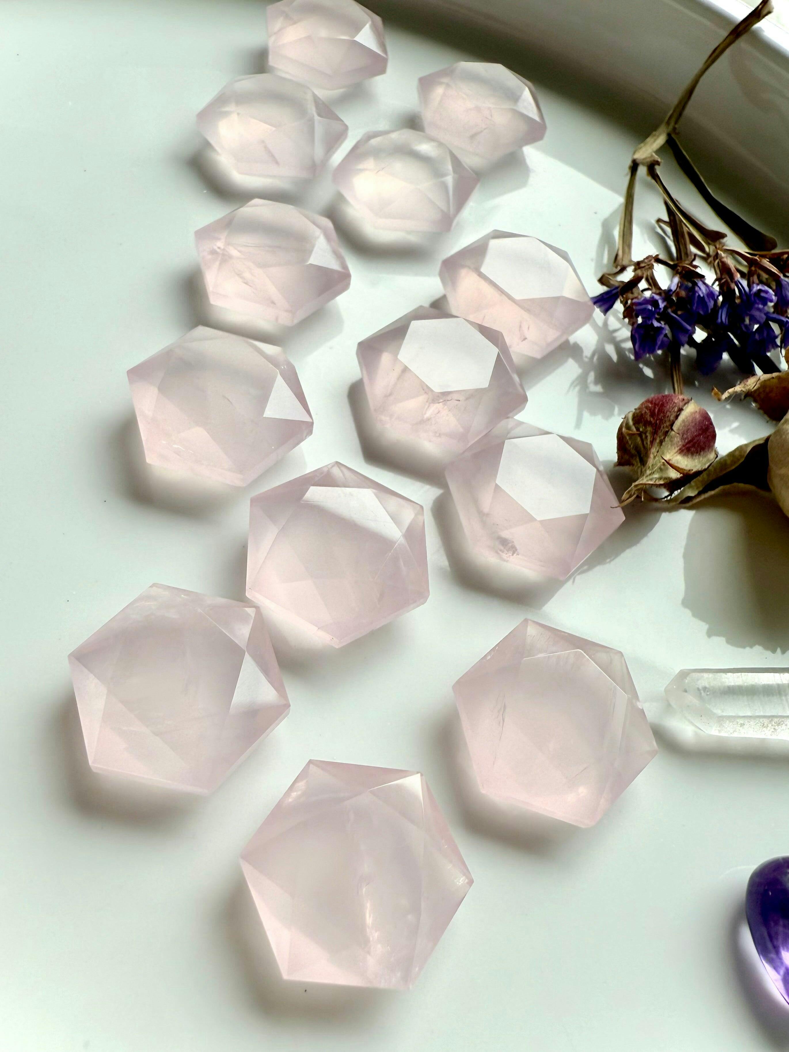 Rose Quartz Hexagons — small but powerful faceted crystal carvings of love, peace, and emotional healing. Carved from premium Madagascar rose quartz, these mini hexagons show a soft translucent pink color with beautiful natural veining and internal patterns, each piece one-of-a-kind.