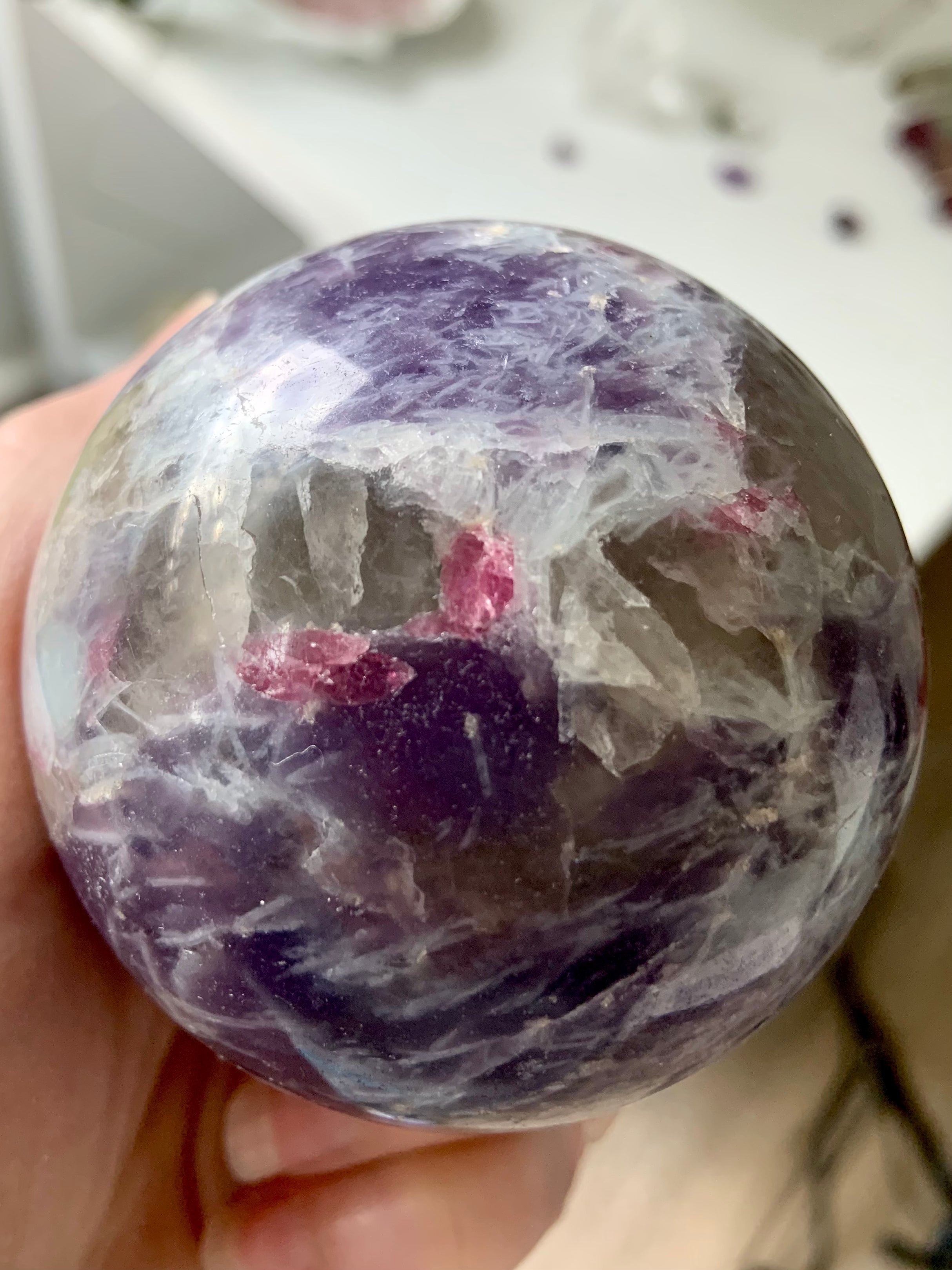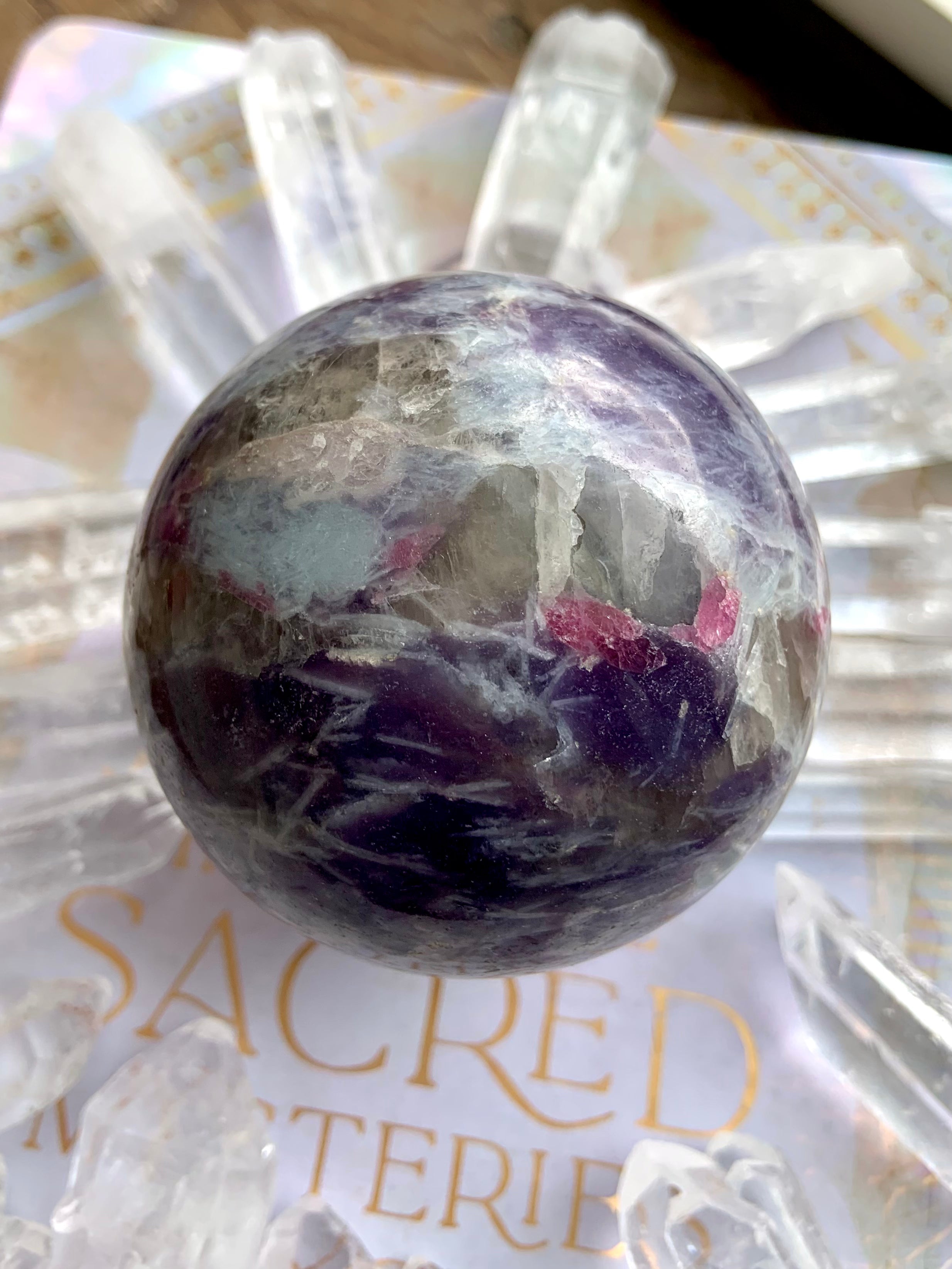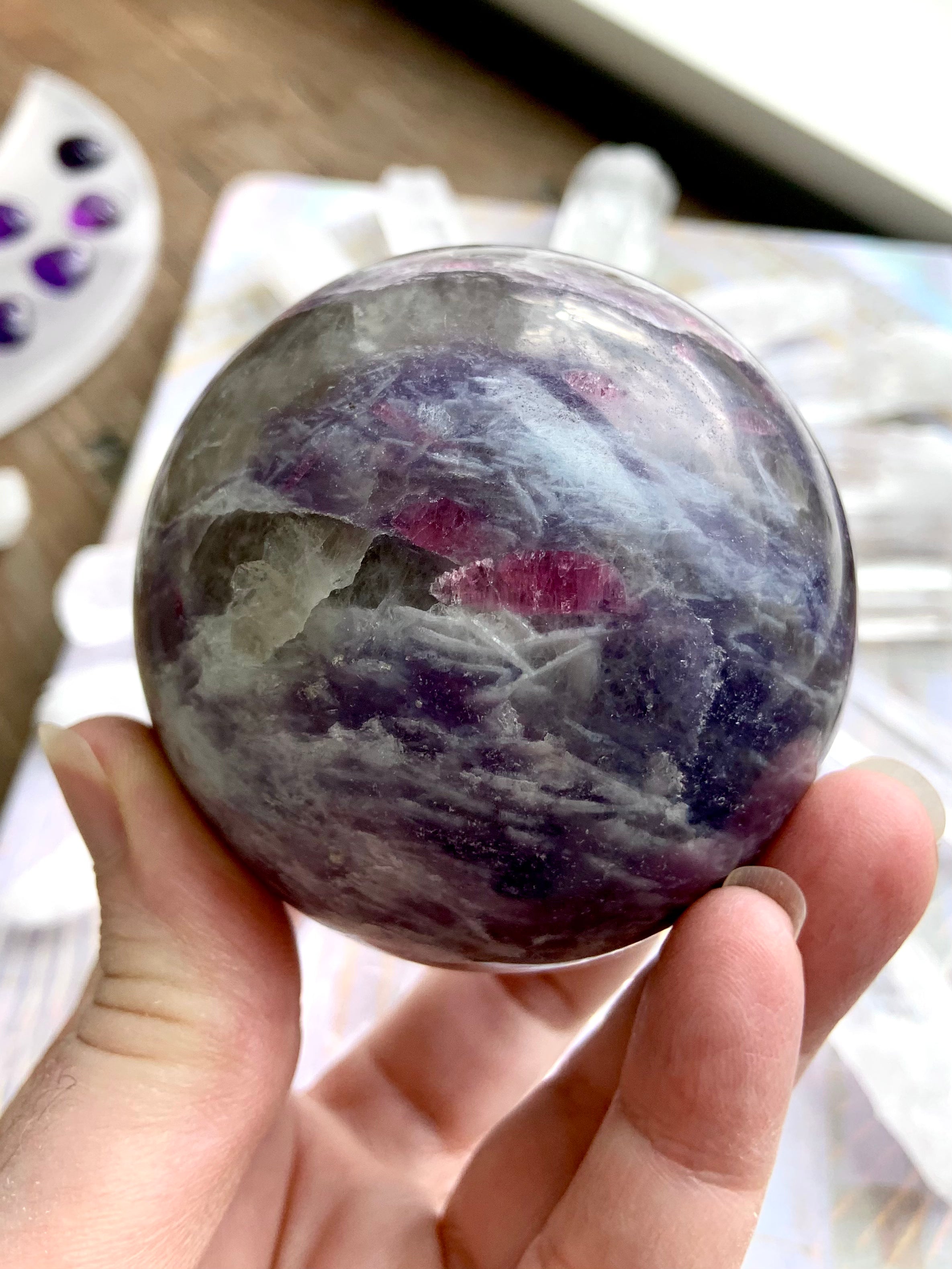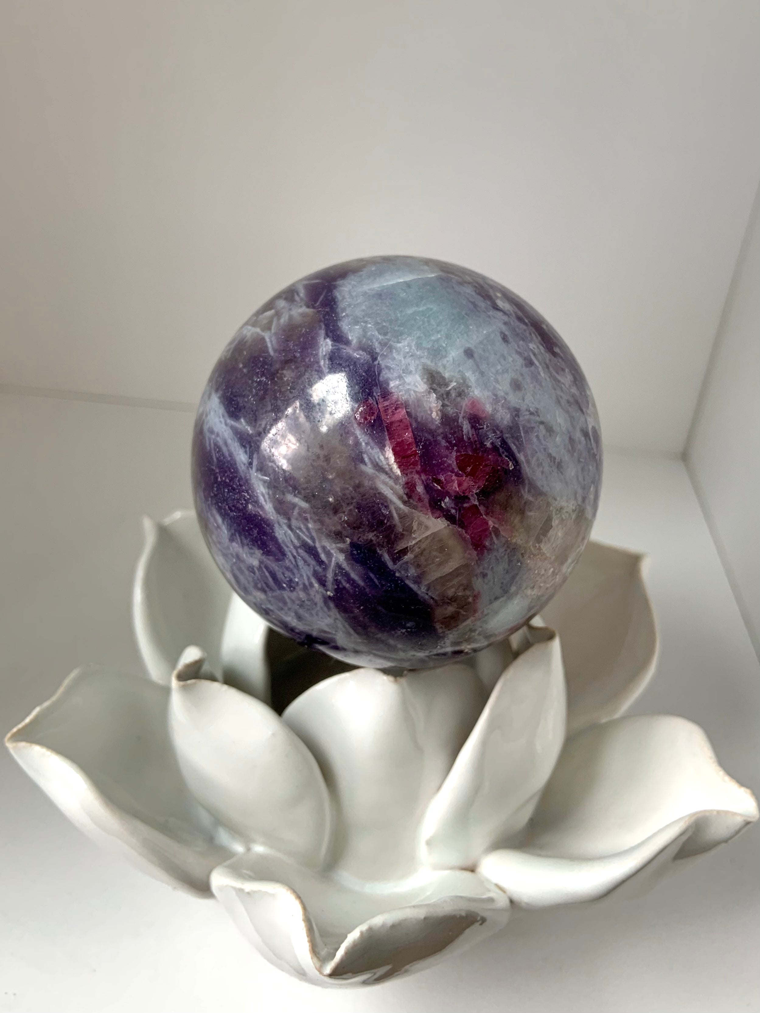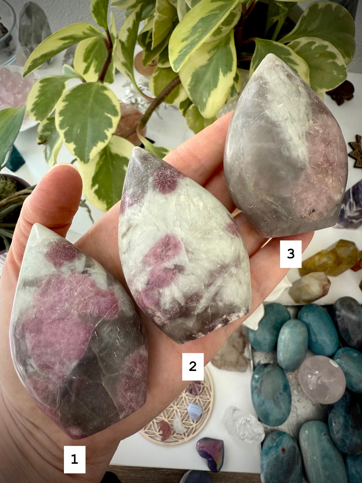 Unicorn Stone is a naturally occurring igneous pegmatite composed of Pink Tourmaline, Purple Lepidolite, Smokey Quartz, and Cleavelandite—each contributing to its nurturing, healing energy and gentle metaphysical benefits.