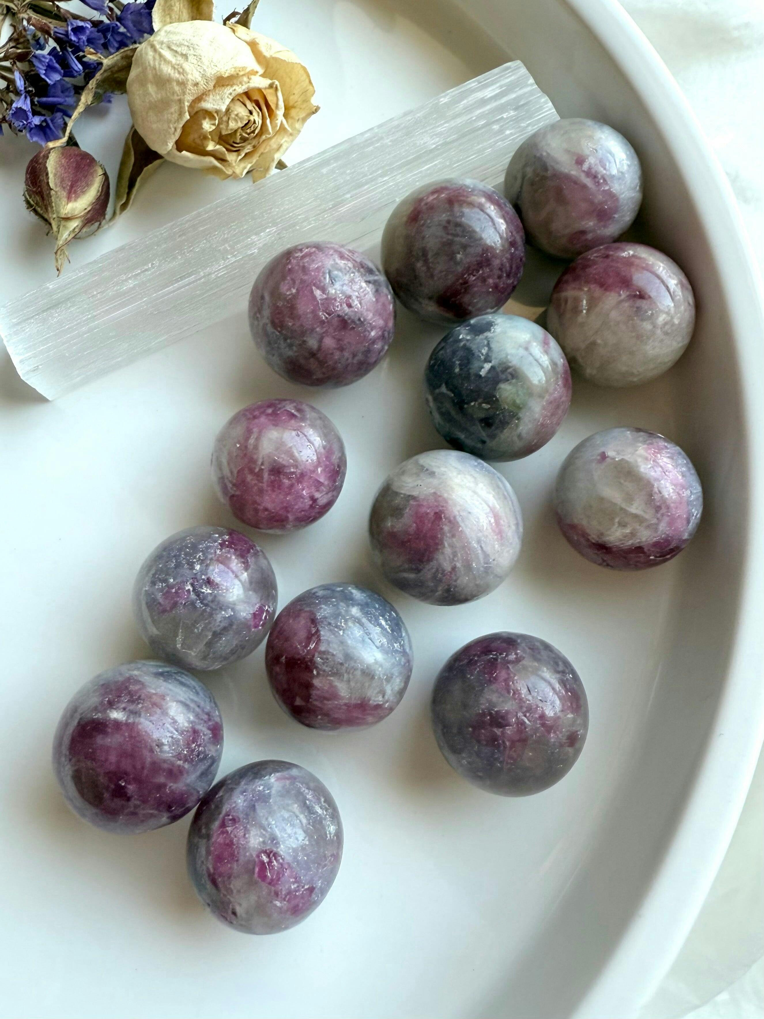 Each sphere is a miniature specimen of this high-vibe, heart-nurturing stone — perfect for meditation, crystal gridding, altar décor, or carrying with you throughout the day.