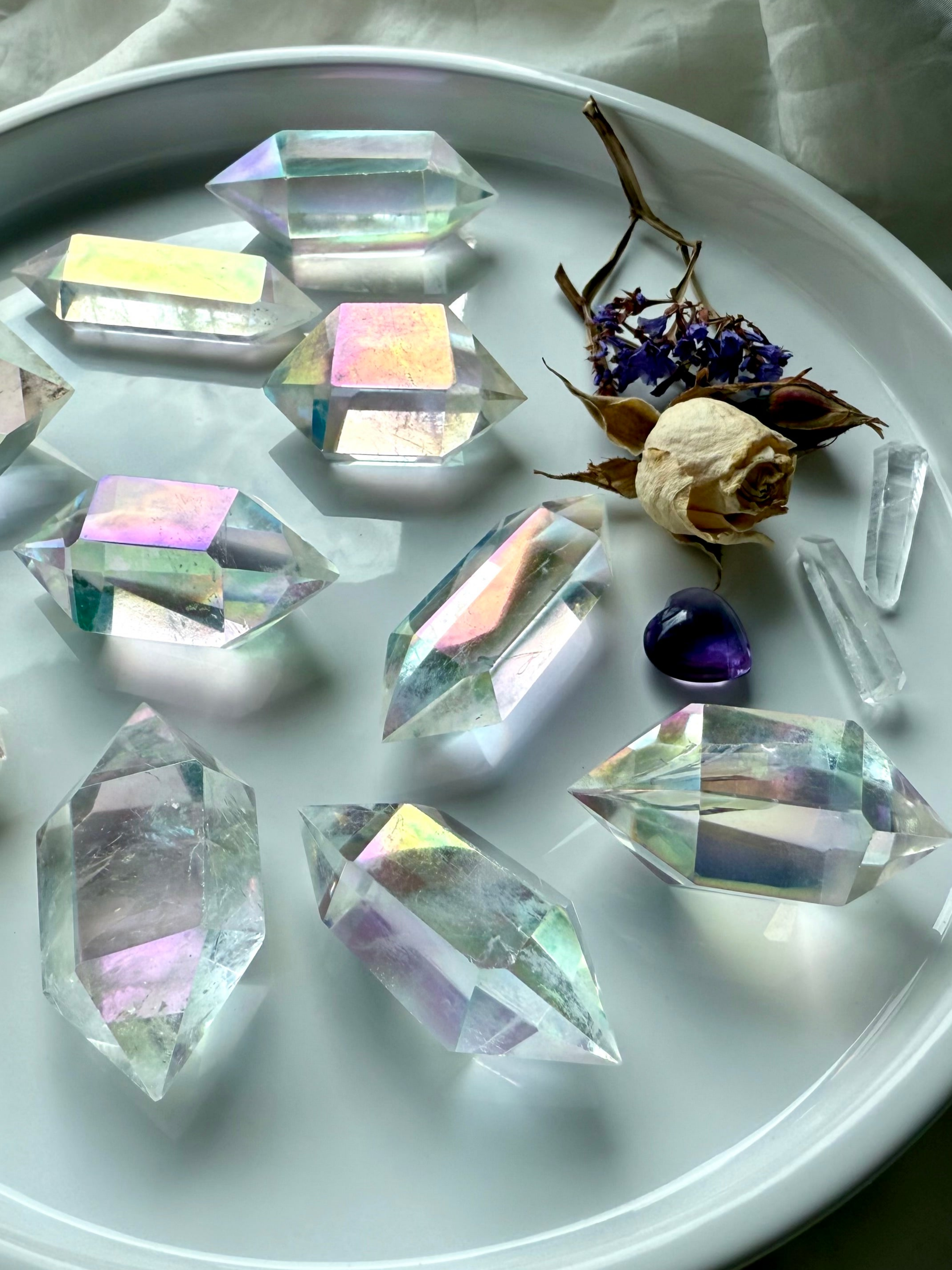 Angel Aura Quartz Double Terminated Points — luminous crystals with a rainbow sheen that radiates angelic energy and spiritual light. Each point is imperfect, cut and polished into a double termination, amplifying energy flow in both directions and making them powerful allies for healing, meditation, and crystal grids.