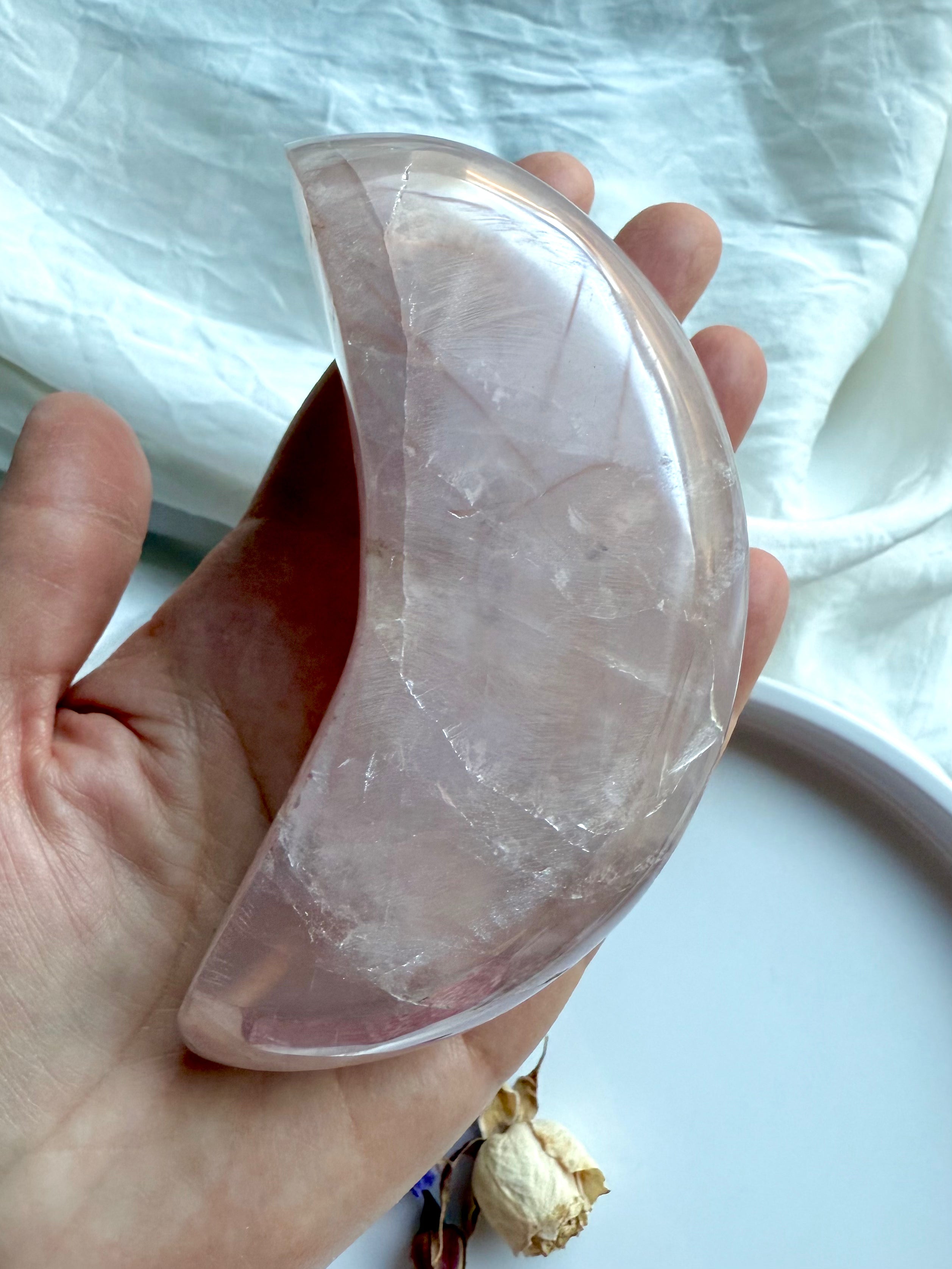 Aura Rose Quartz Crescent Moon Bowl – Lilac Crystal for Love + Altar Magic
