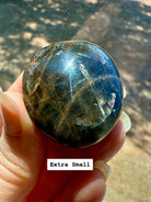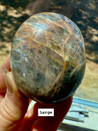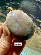 Hold a Black Moonstone Palm Stone to awaken your intuition and connect with Divine Feminine energy. The smooth polished oval shaped stones have beautiful shimmer when held to the light, and range in color from black to silvery dark gray to beige to rich rusty brown, with inclusions of peach moonstone. Each stone is unique and one of a kind.