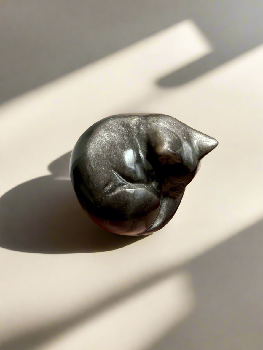 The mini cats are intuitively chosen for you, but I think the right cat will choose you! The sheen is visible in the black obsidian at various angles depending on the light. Some are darker than others as shown.