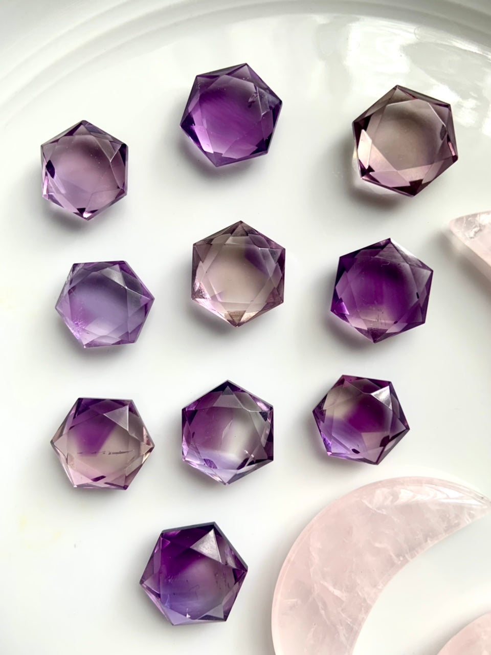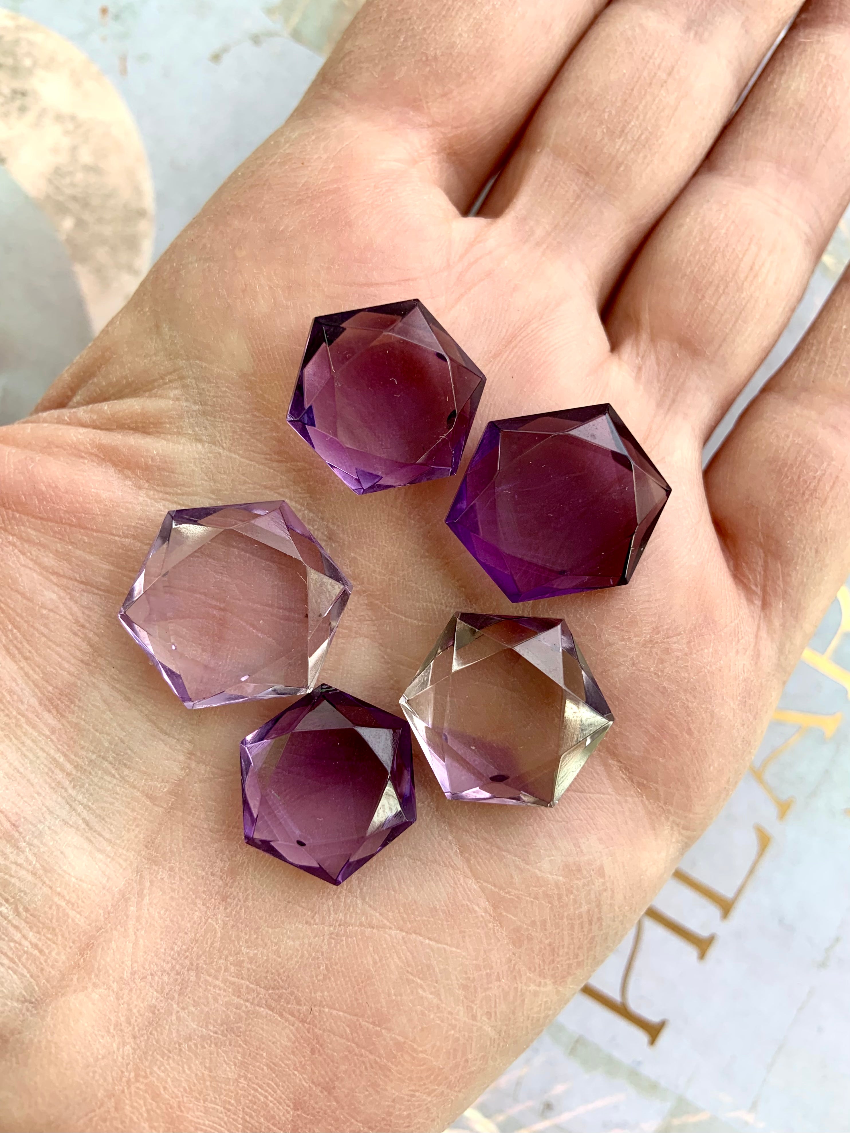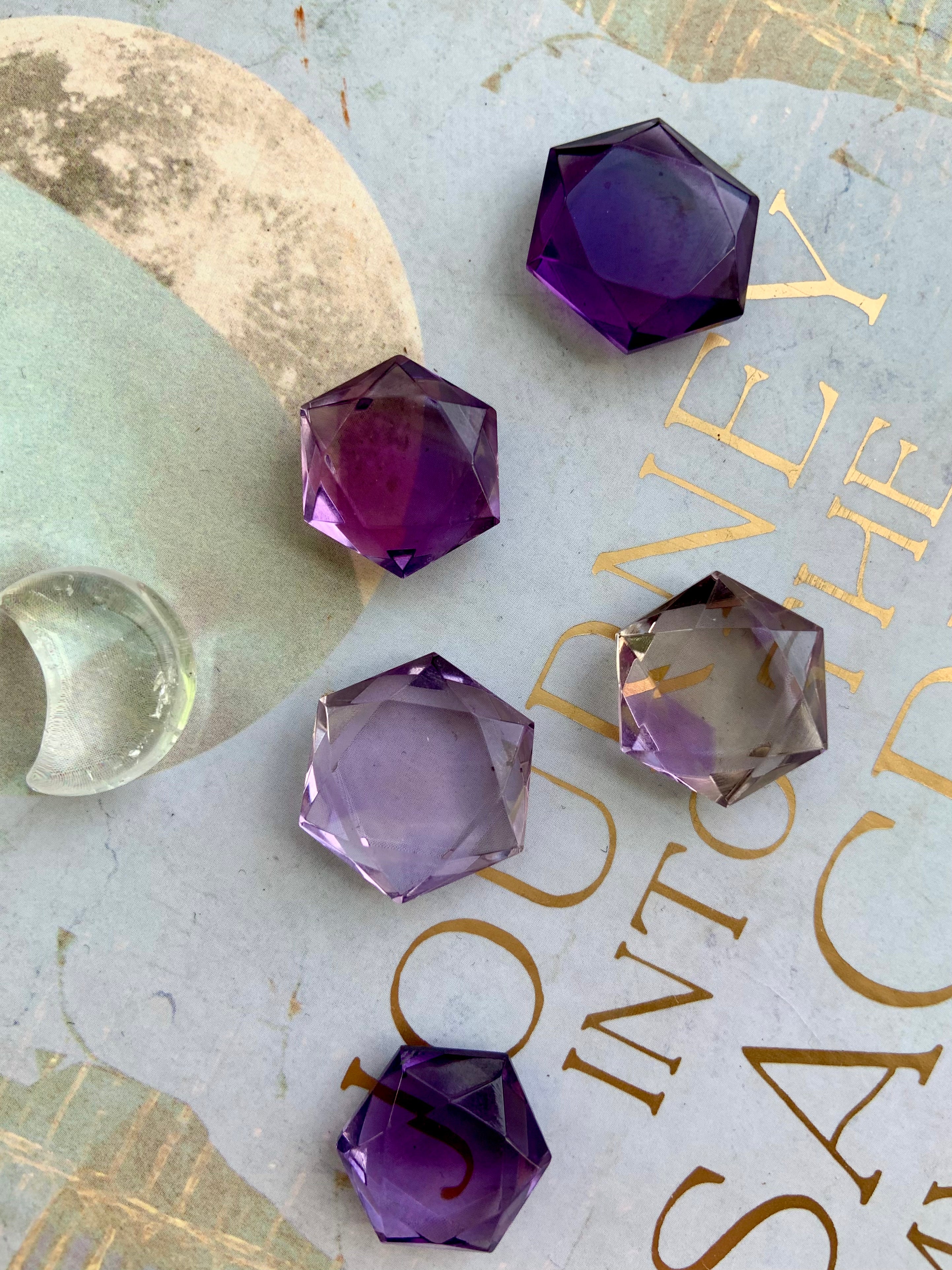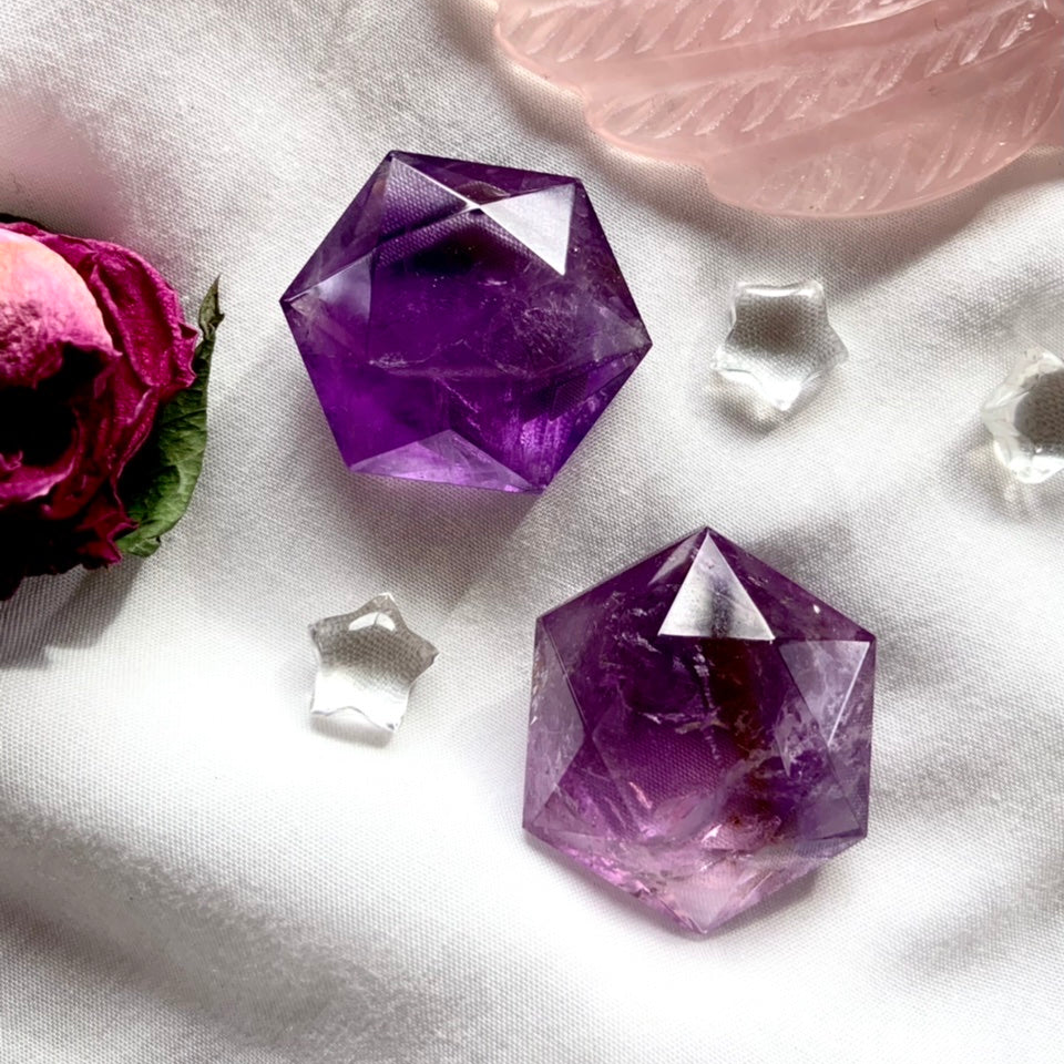 These Amethyst Hexagons, Amethyst Star of David, faceted gem shapes are just so beautiful + captivating to hold + play with their gem cut angles in the light.