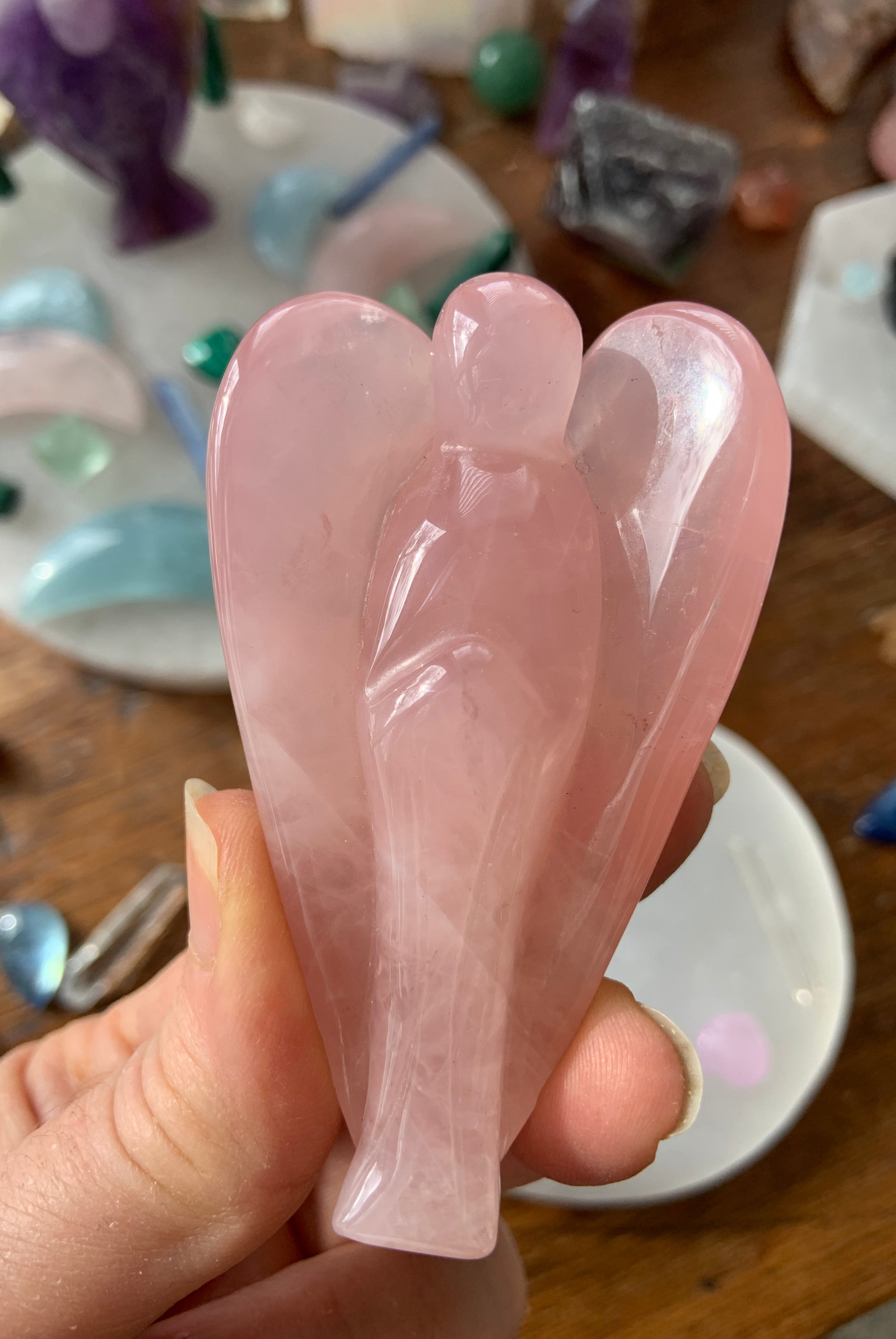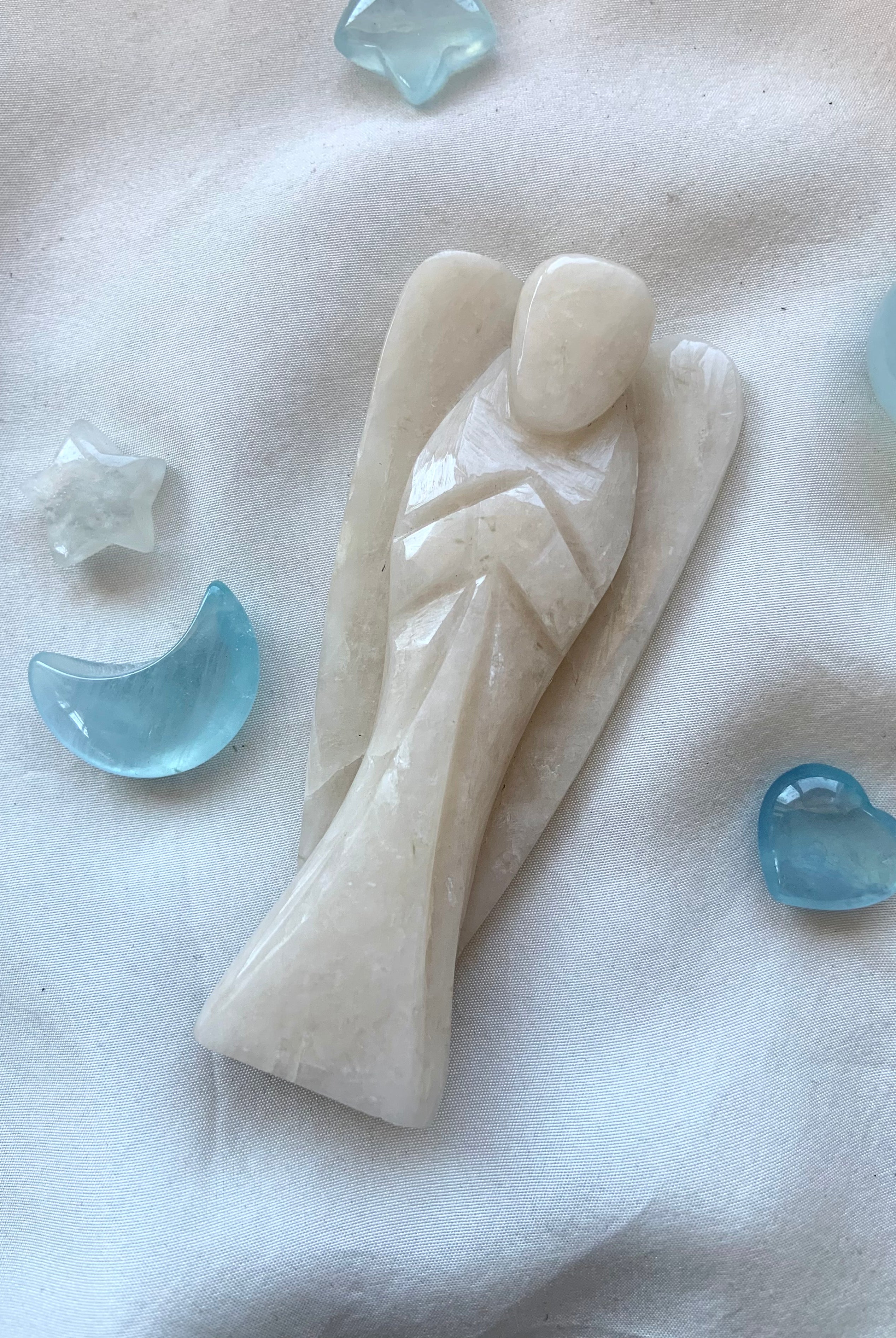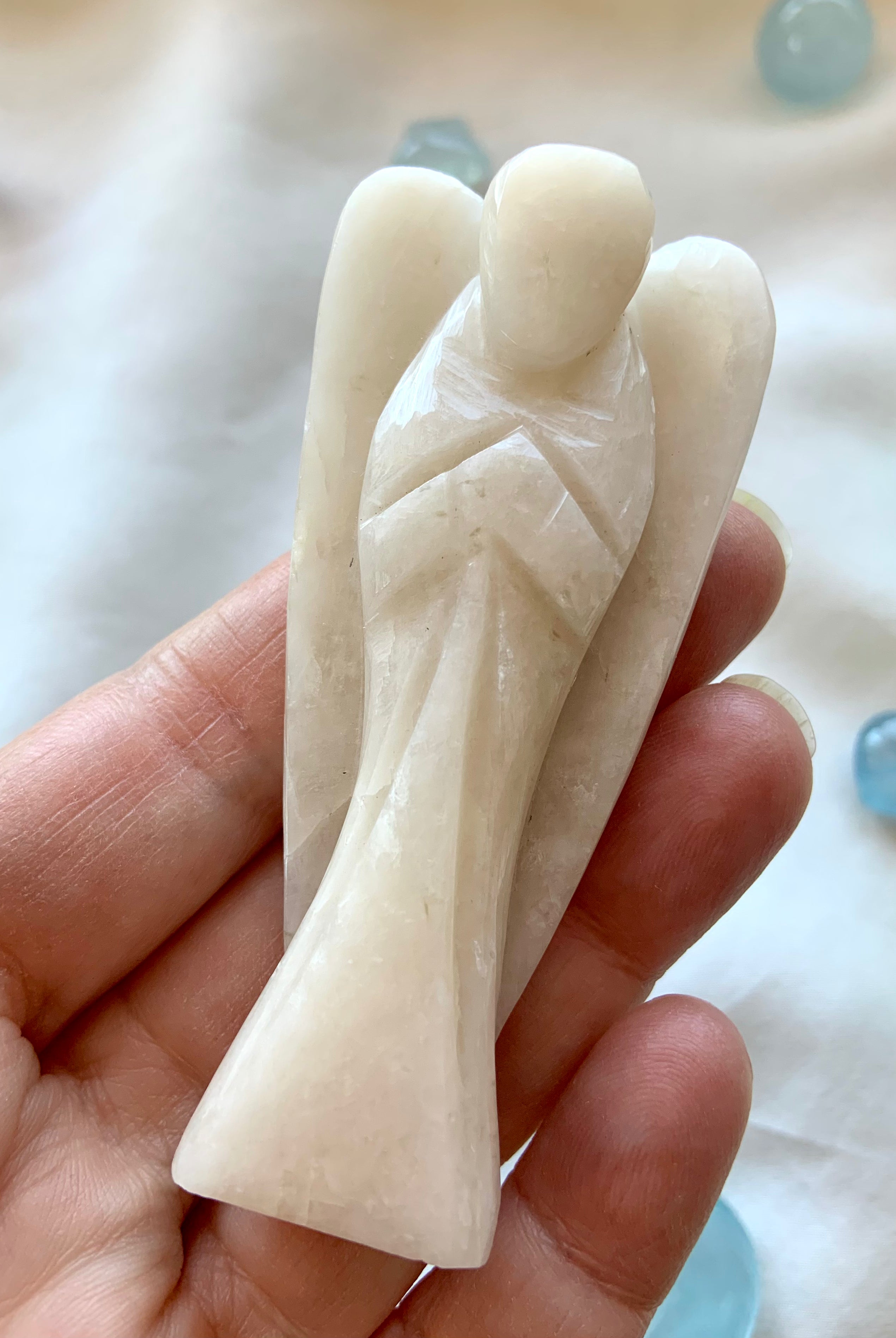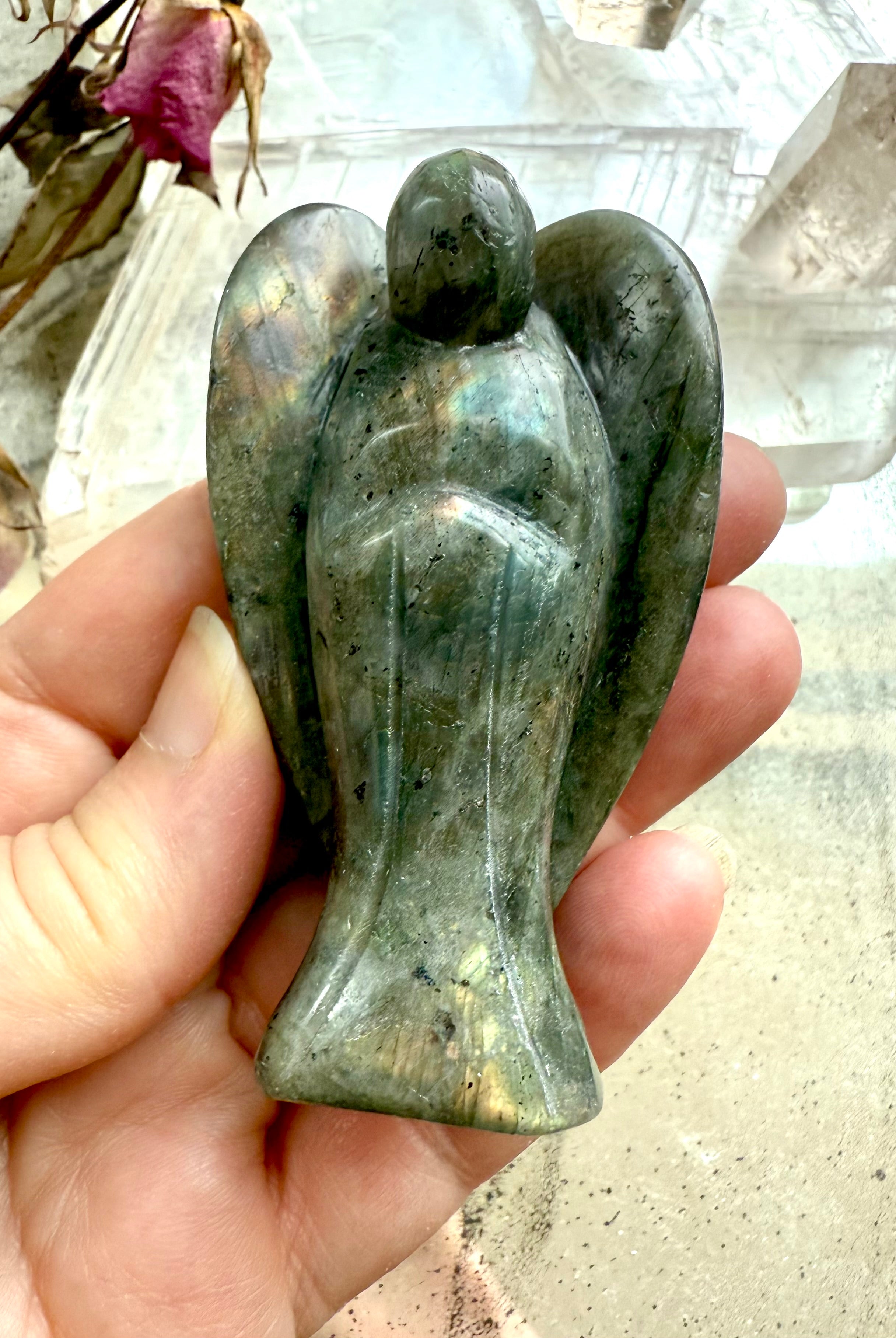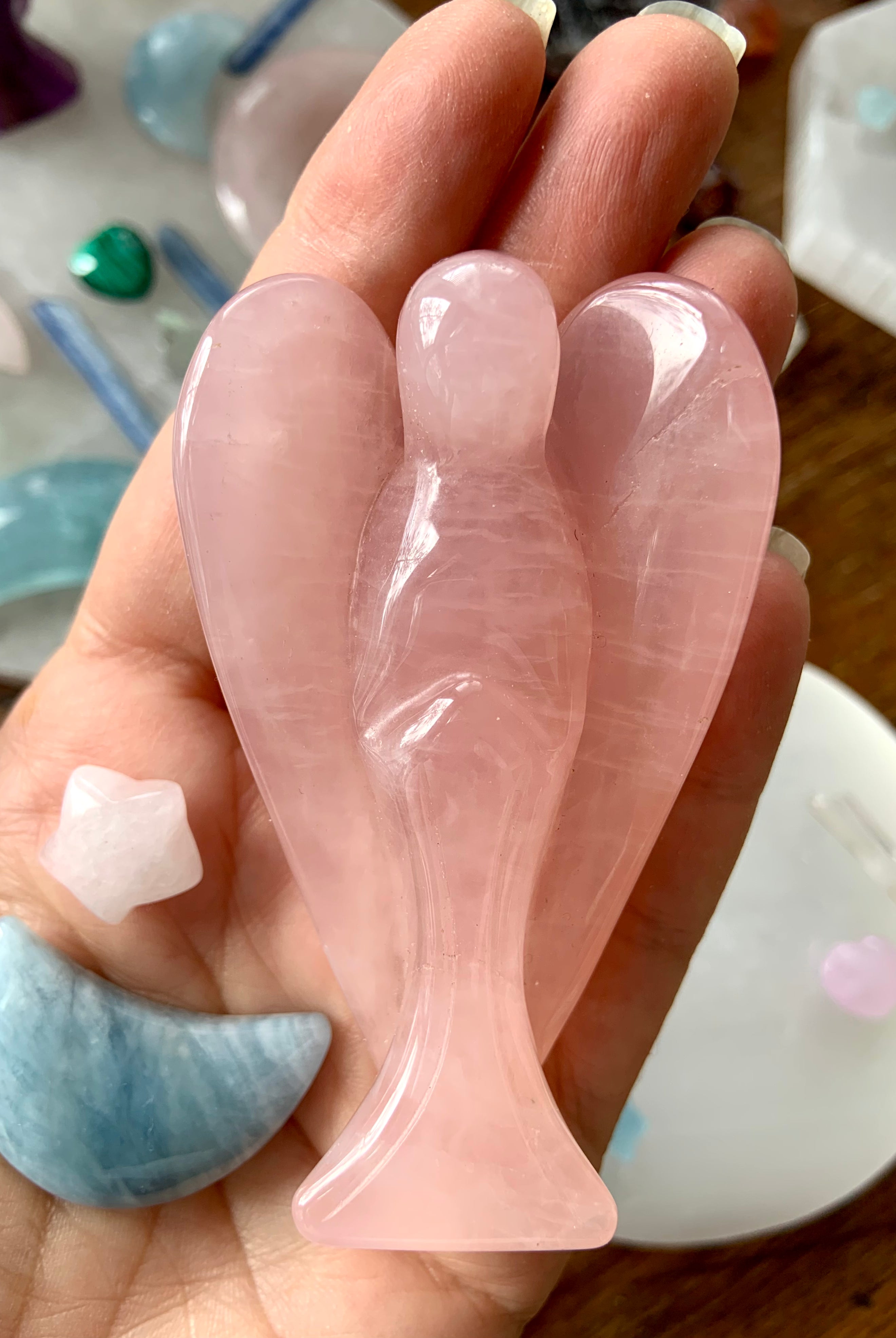 This curated collection includes pocket-size companions, meditation stones, altar guardians, and one-of-a-kind statement pieces. Whether gifted as a spiritual keepsake or used in ritual and remembrance, crystal angels offer comfort, presence, and a connection to the celestial realms.