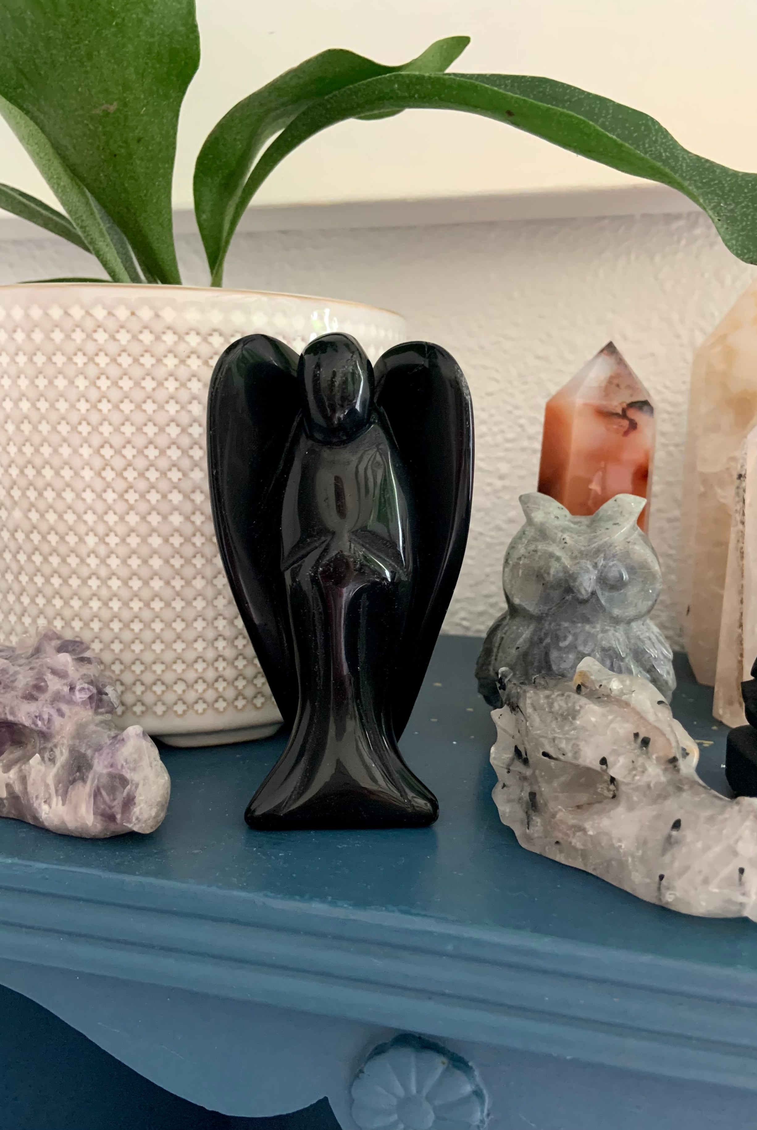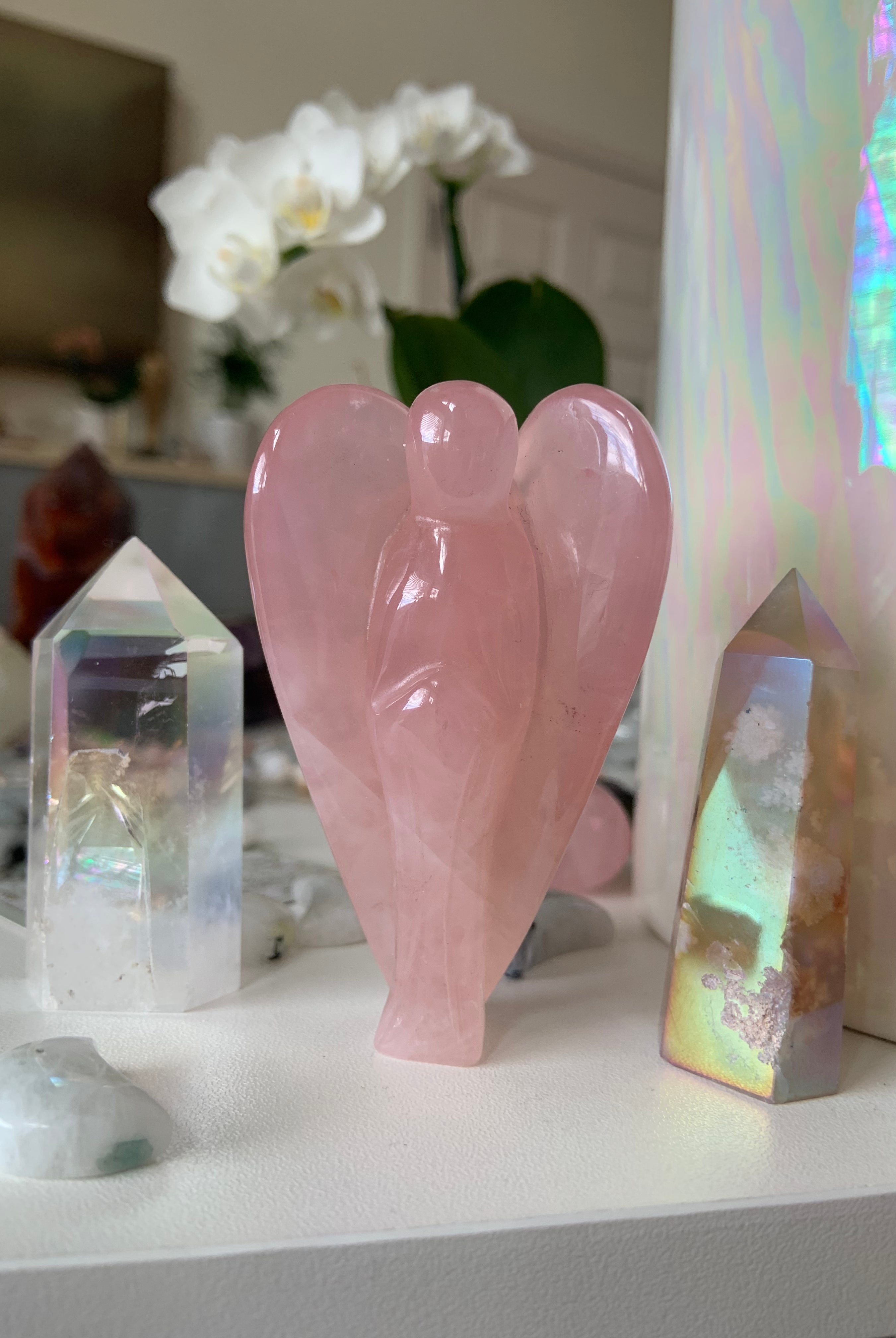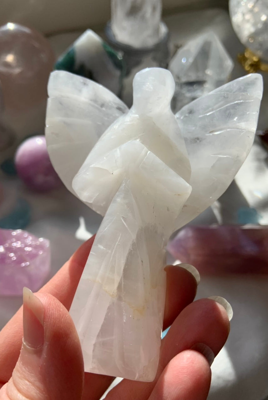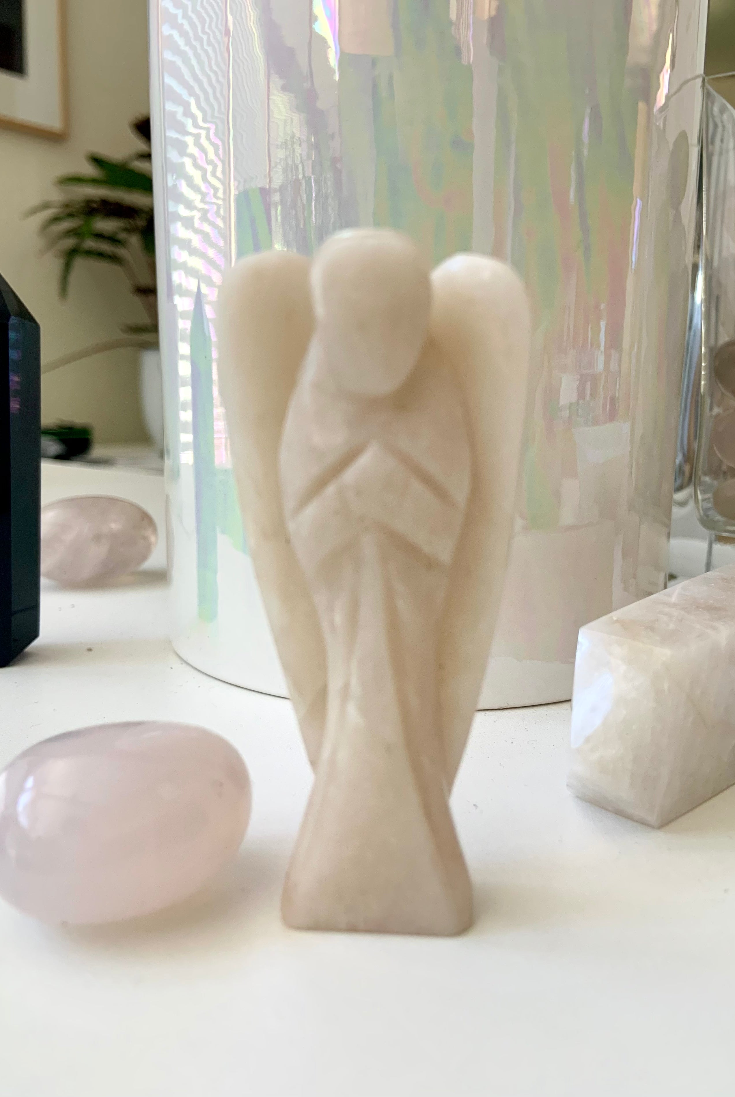 Call in divine support with our Crystal Angel carvings — sacred symbols of healing, protection, and spiritual light. These ethereal figures are carved from high-vibrational stones like Rose Quartz, Amethyst, Moonstone, Clear Quartz, and Black Obsidian, each radiating gentle guidance and peace.