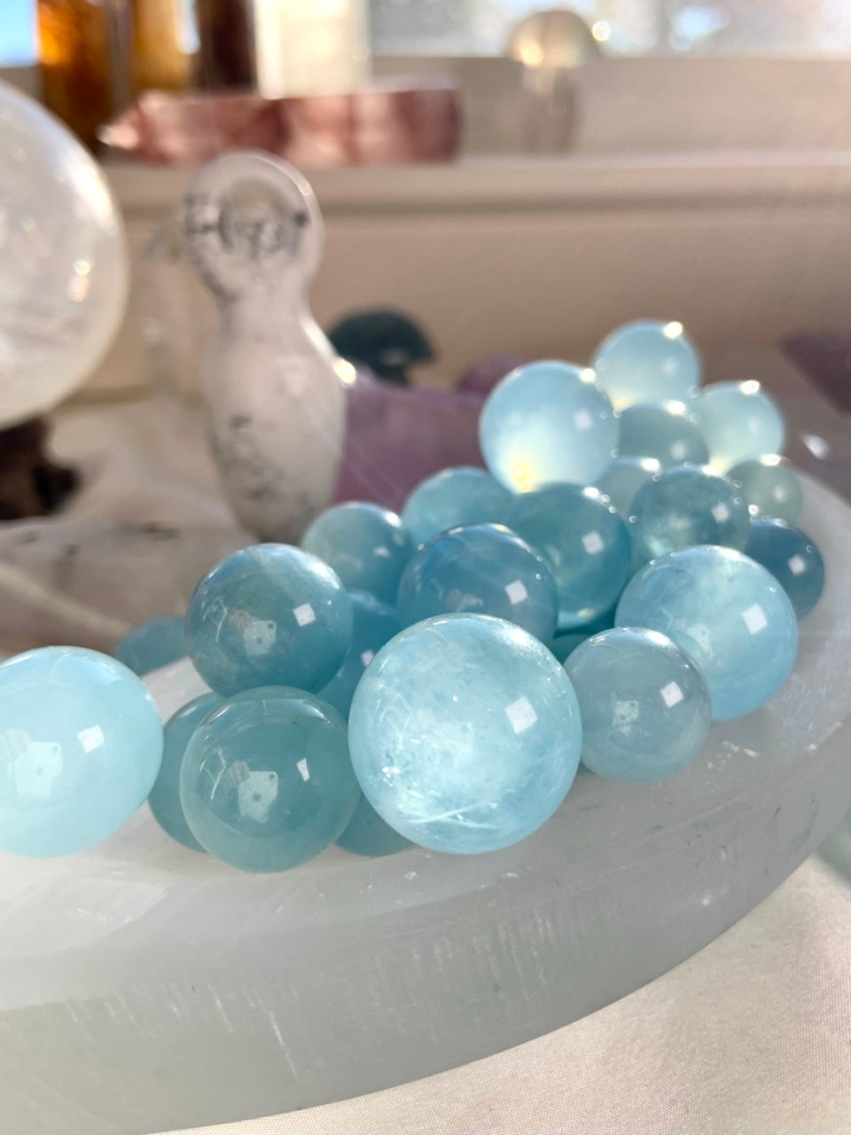 Listing is for 1, 2 or 3 mini spheres in the size you select. They vary as shown in pics as each piece is a beautiful one of a kind gemstone. Some are pale + clear others are deeper blue + more opaque, and everywhere in between. Your Aquamarine sphere will be intuitively chosen for you.