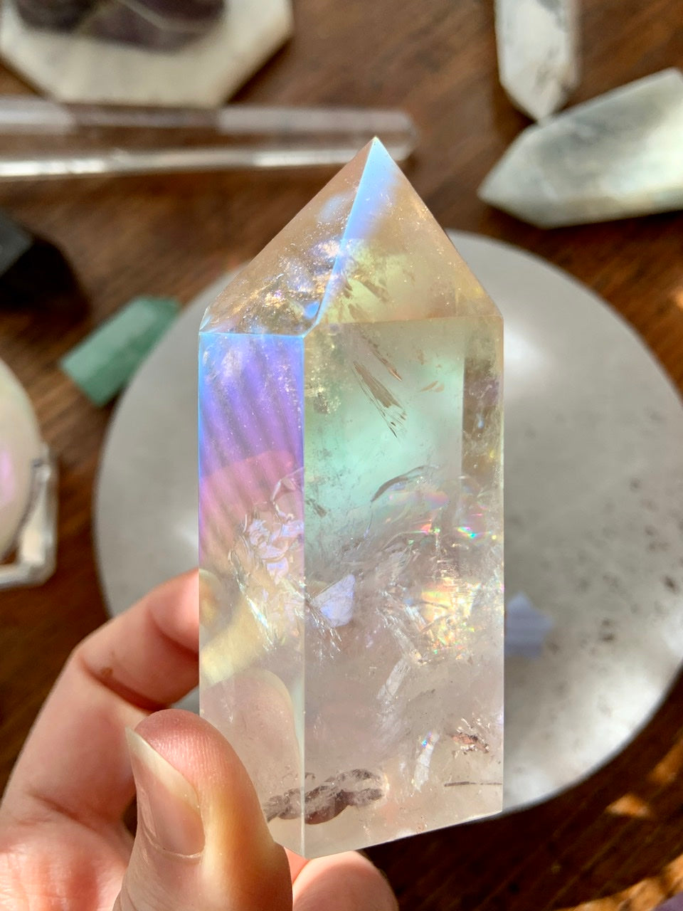 Clear Quartz is the Master Healer of the crystal world. It's a stone of clarity, light, reflection + amplification --- amplified with the alchemic aura coating.