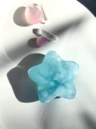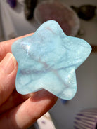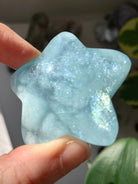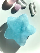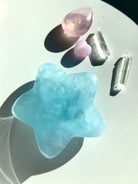 This Aquamarine Crystal Star will make a stunning centerpiece in your crystal grid designs with its gorgeous dreamy blue color, lots of glittery, shimmery silver flash, luminous transparency + unique patterning within the natural stone. This hand carved star is polished smooth with rounded edges + is 2" in diameter.
