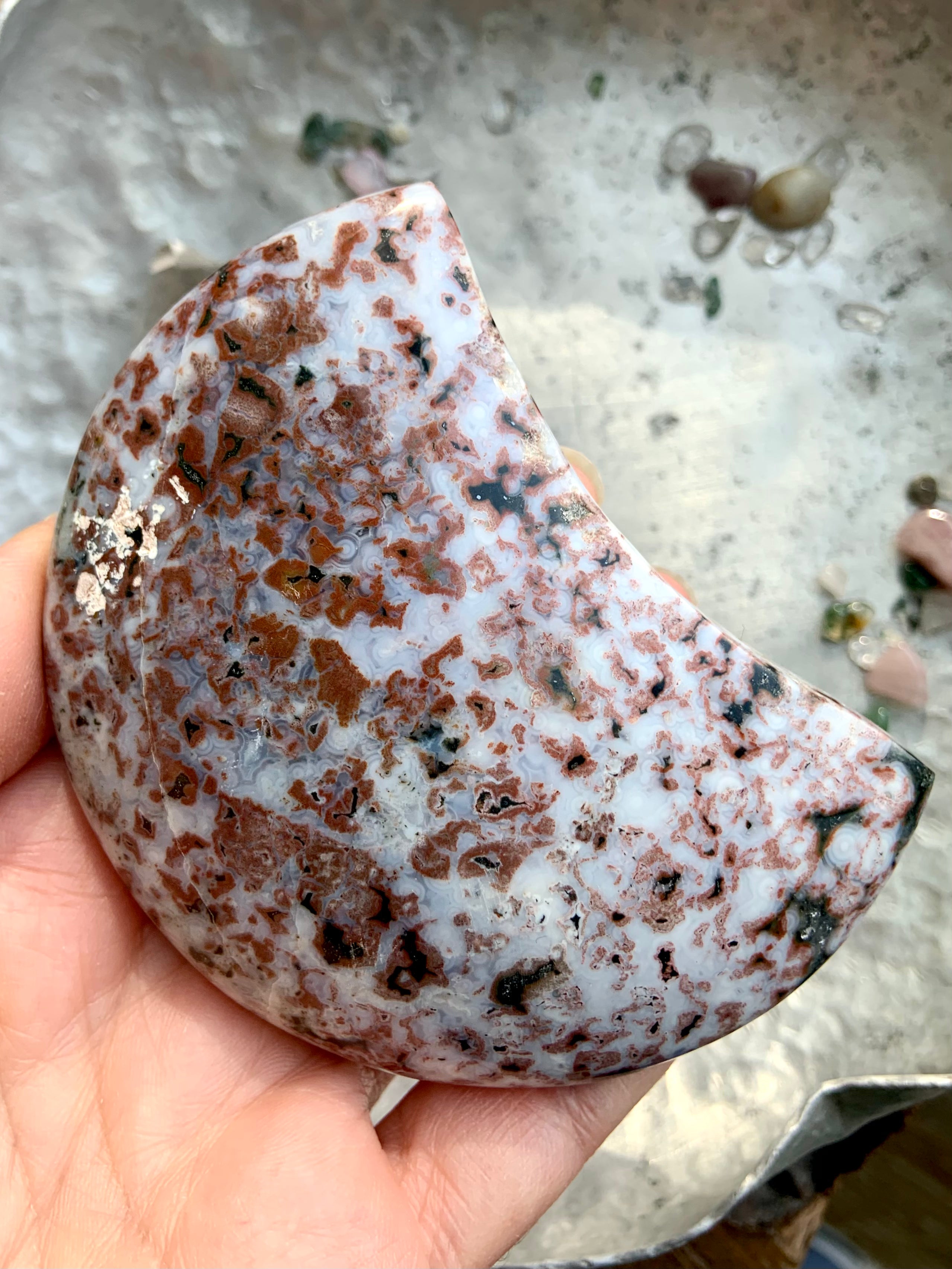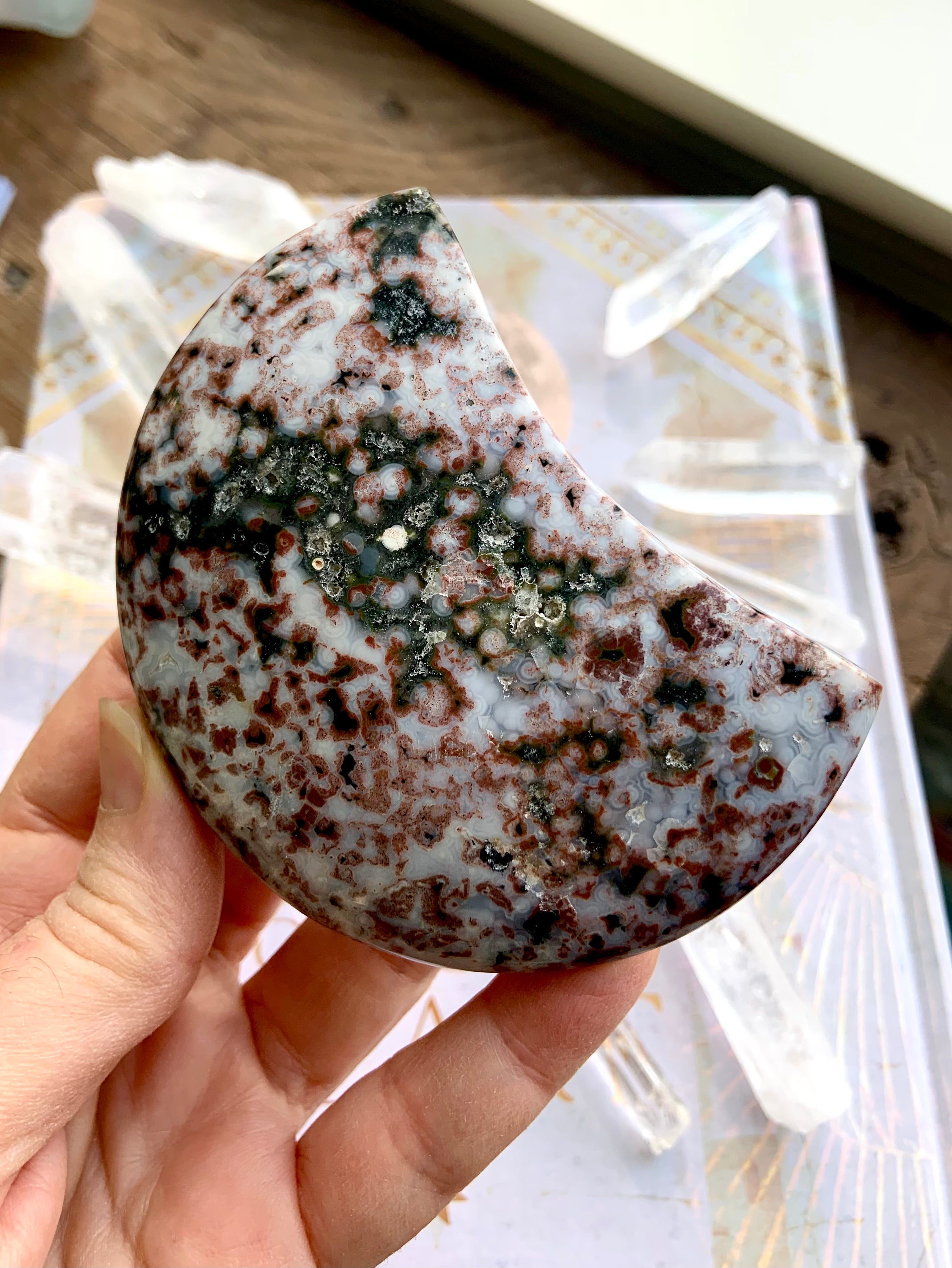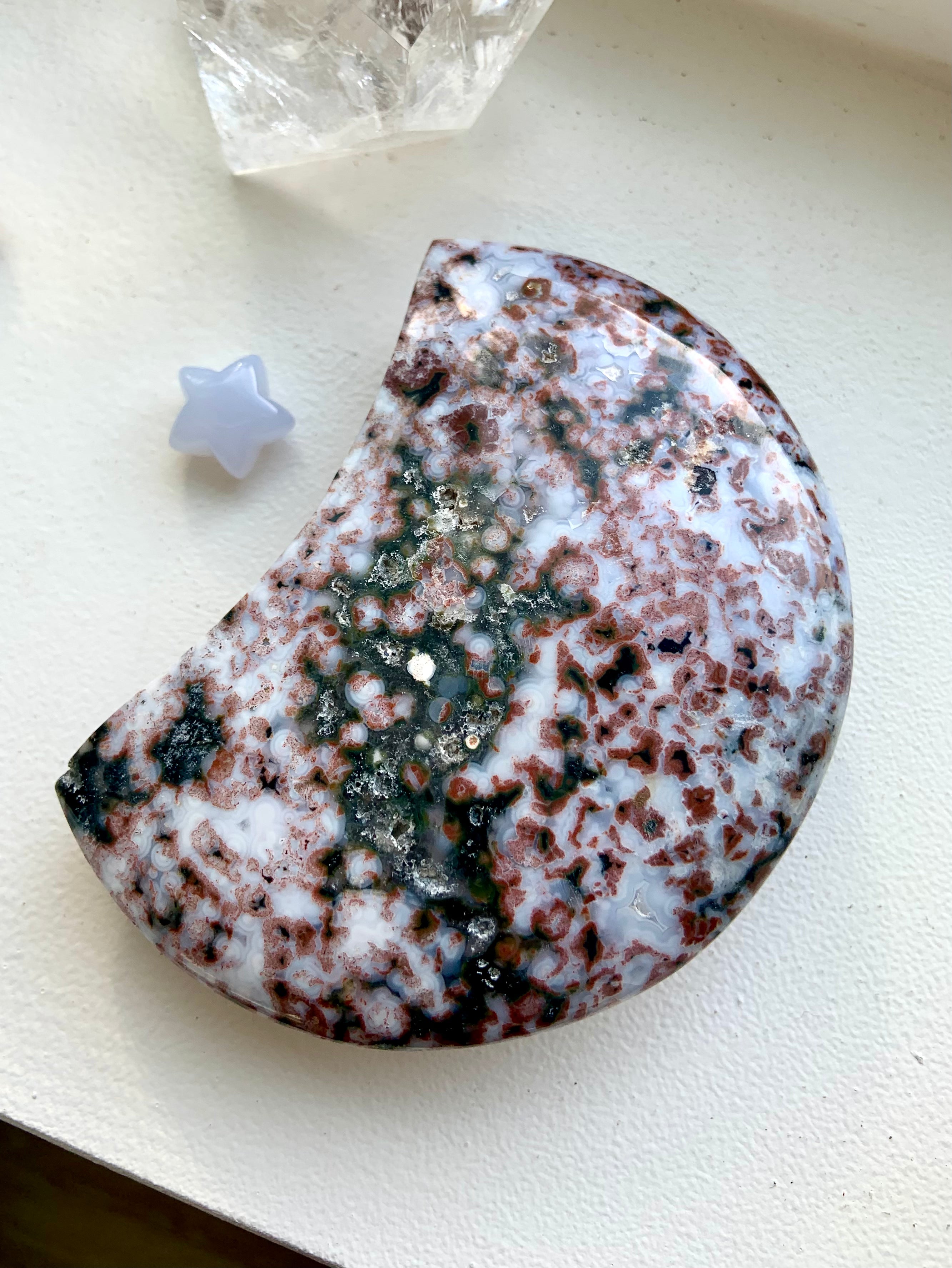 This Ocean Jasper Crystal Moon will assist you in working with the unseen energies of the etheric realms + facilitate a deeper awareness of those mythical, magical places beyond the veil.