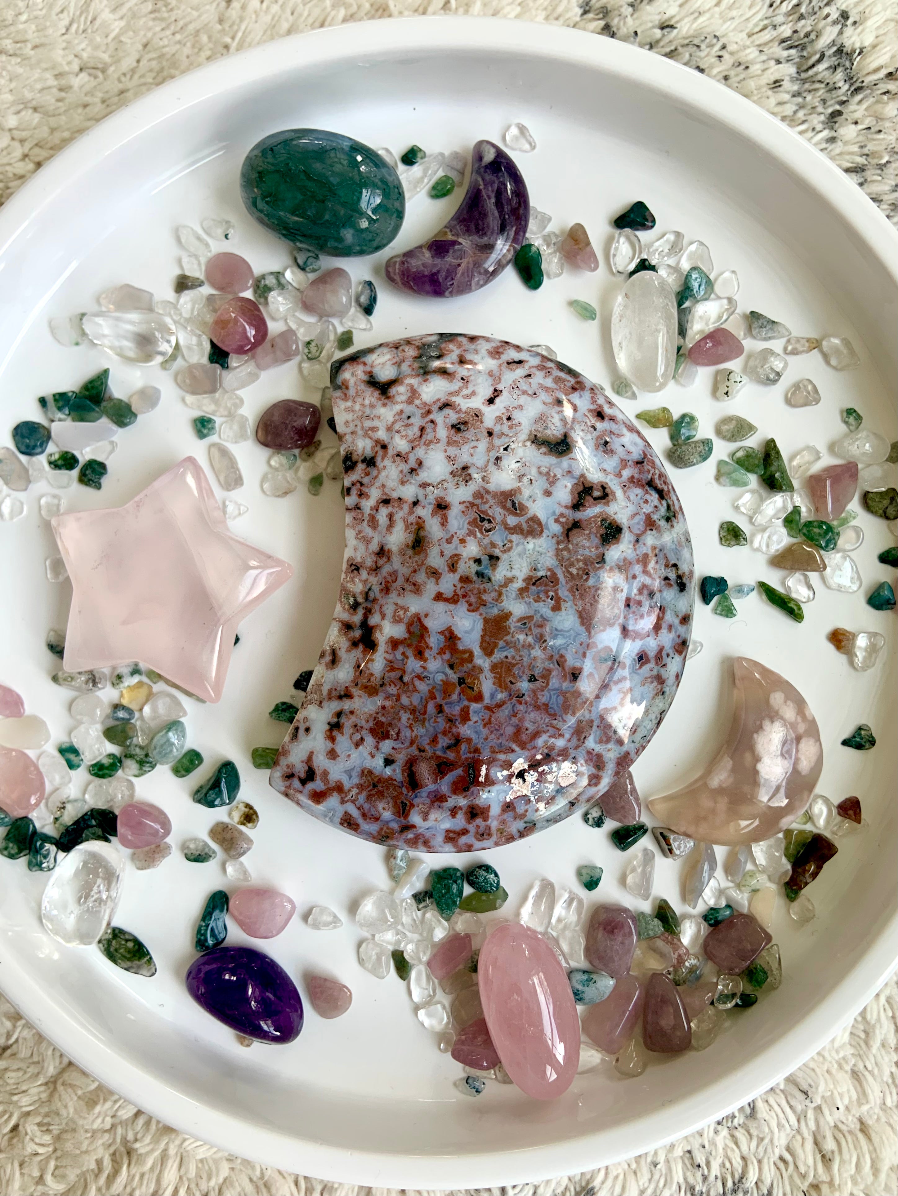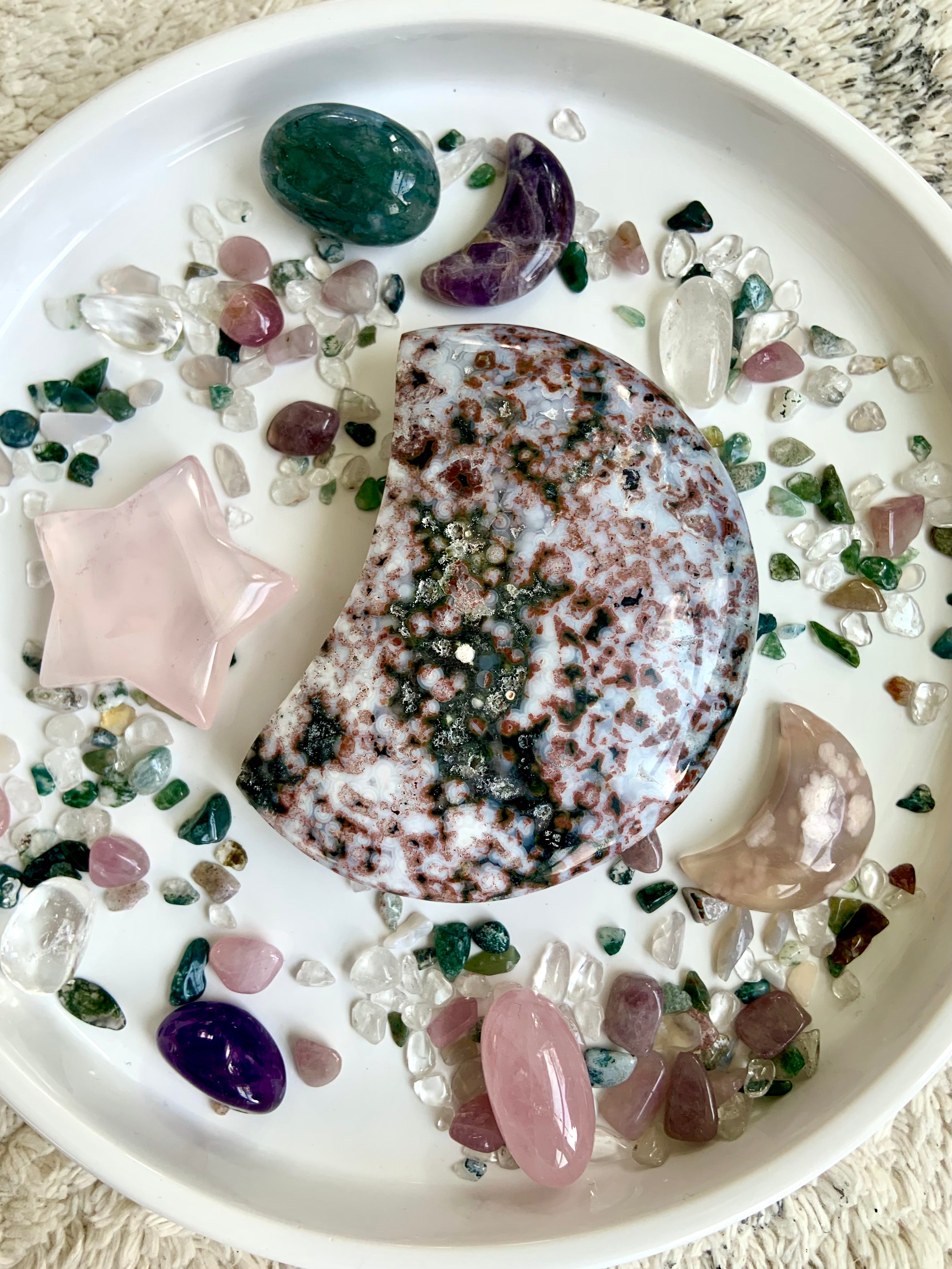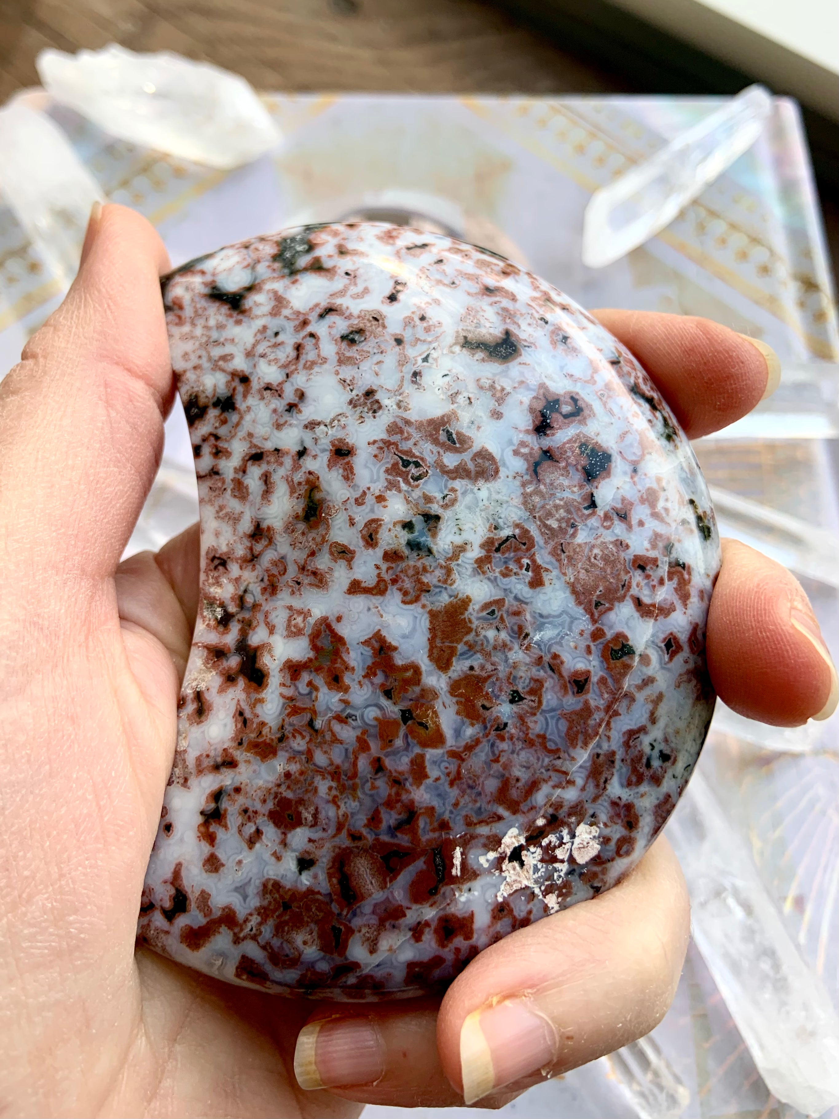 This Ocean Jasper Crystal Moon will assist you in working with the unseen energies of the etheric realms + facilitate a deeper awareness of those mythical, magical places beyond the veil.