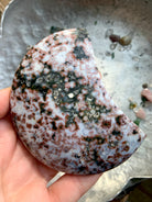 This beautiful Ocean Jasper Moon is full of wisdom + personality. The stone has lovely contrasting colors, some sparkly druzy spots, swirls of pink, rusty red, black, white, dark green + pale lavender colors with orbs bubbling around in the natural stone.