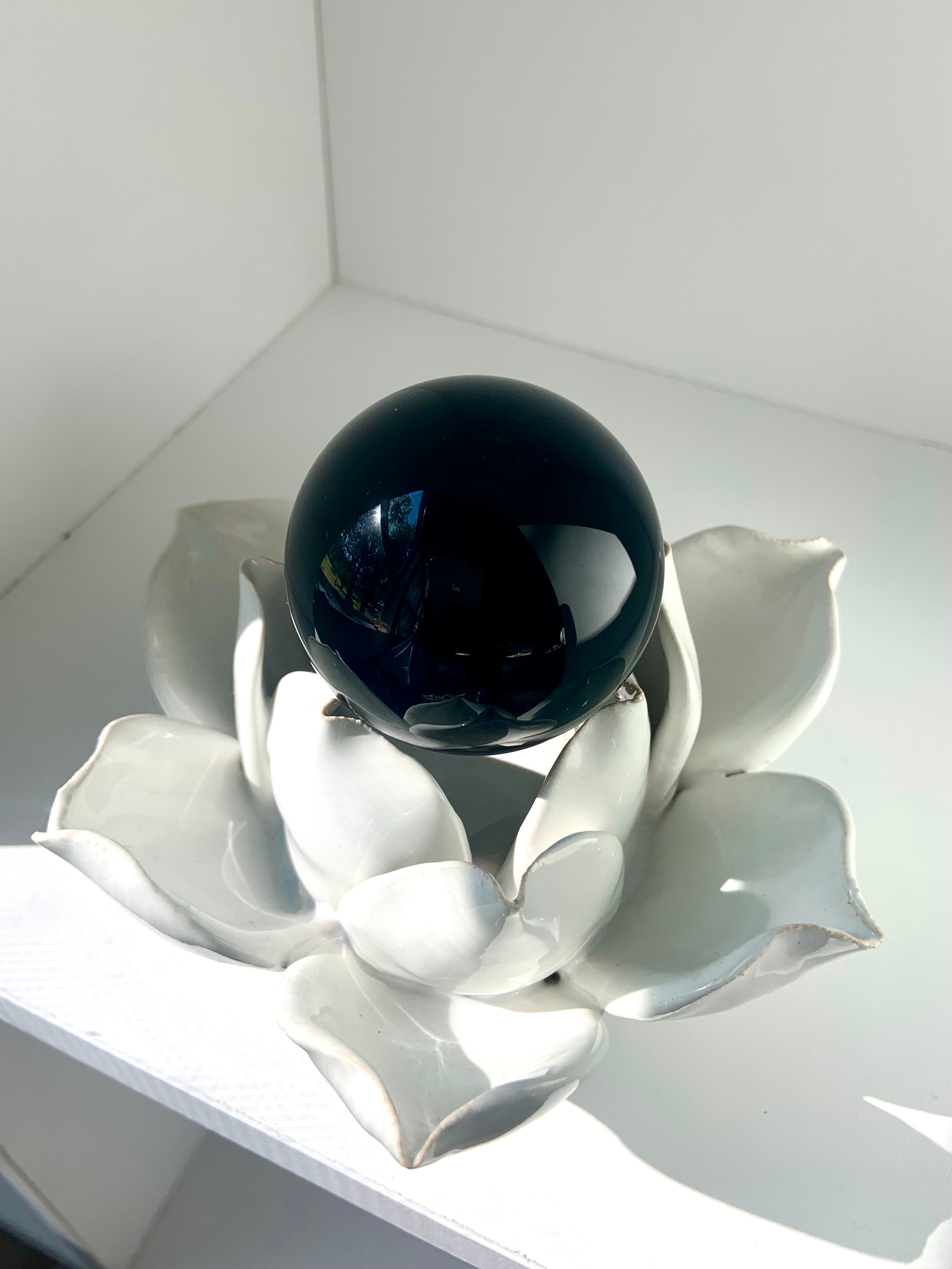 These high quality Black Obsidian Crystal Spheres are a protective, truth-enhancing stone, offering clarity of mind. Black Obsidian is a Root Chakra stone that has a cleansing, protective + powerfully grounding energy, often used to purify negativity + deflect EMF's from your space.