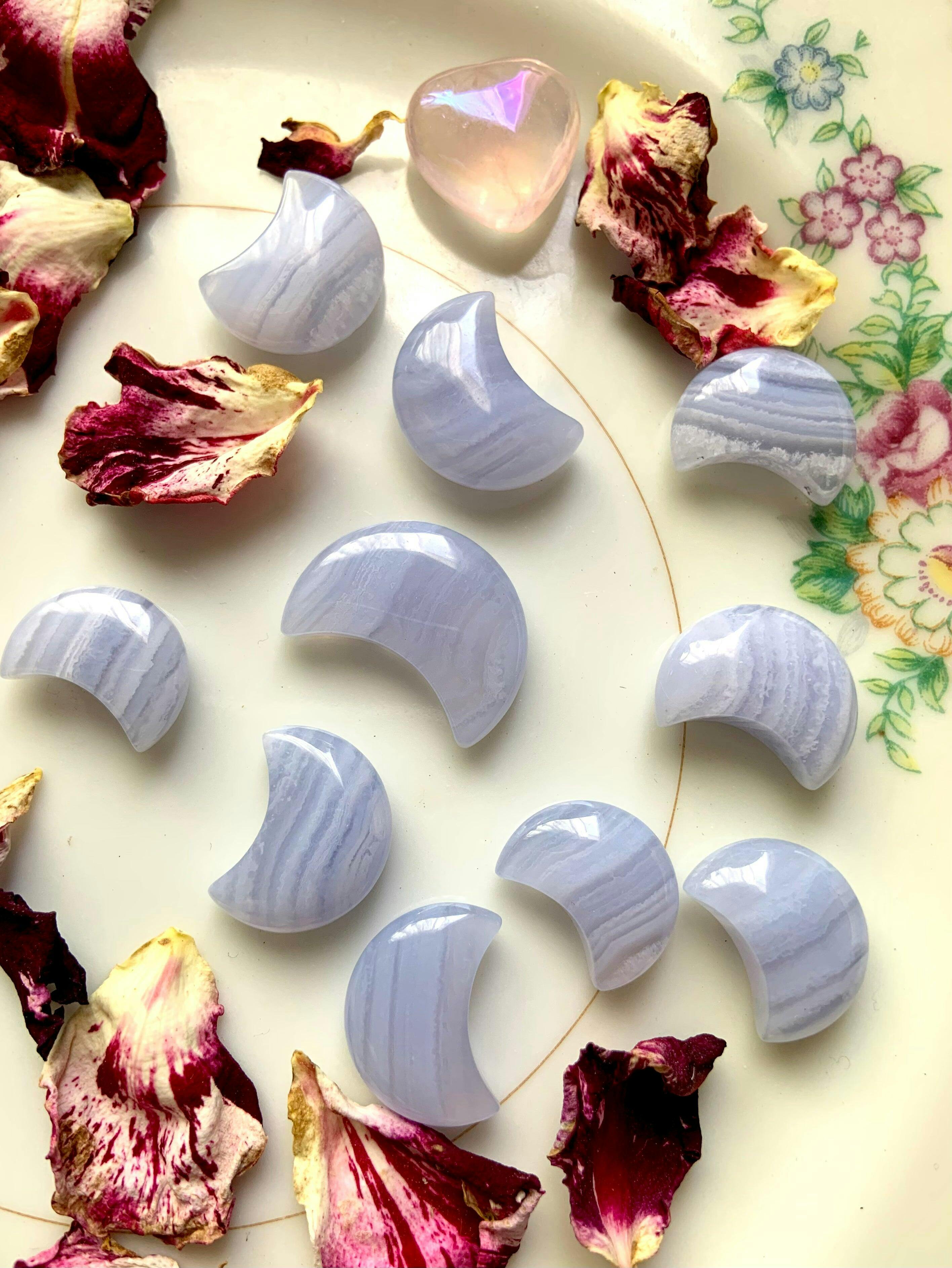 Use these beautiful pretty Blue Lace Agate Crystal Moons to decorate your sacred space! Feature in your crystal grids + crystal display or decorate your desk, inspire journaling or meditation, in moon rituals, to adorn your altar space, to accent your crystal collection, or floating in your jewelry box.