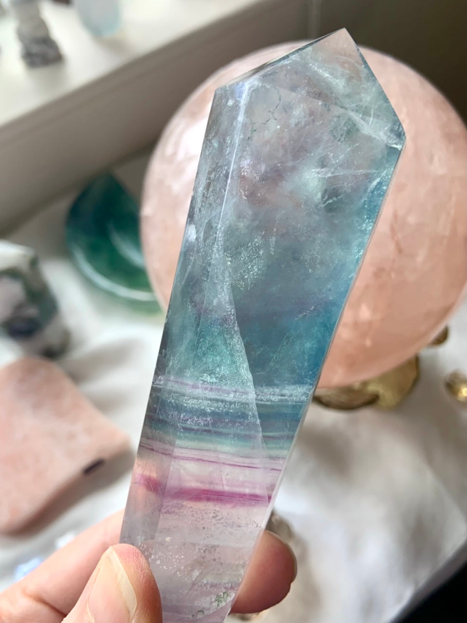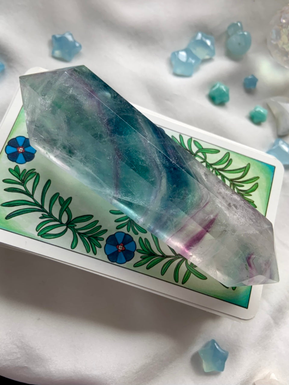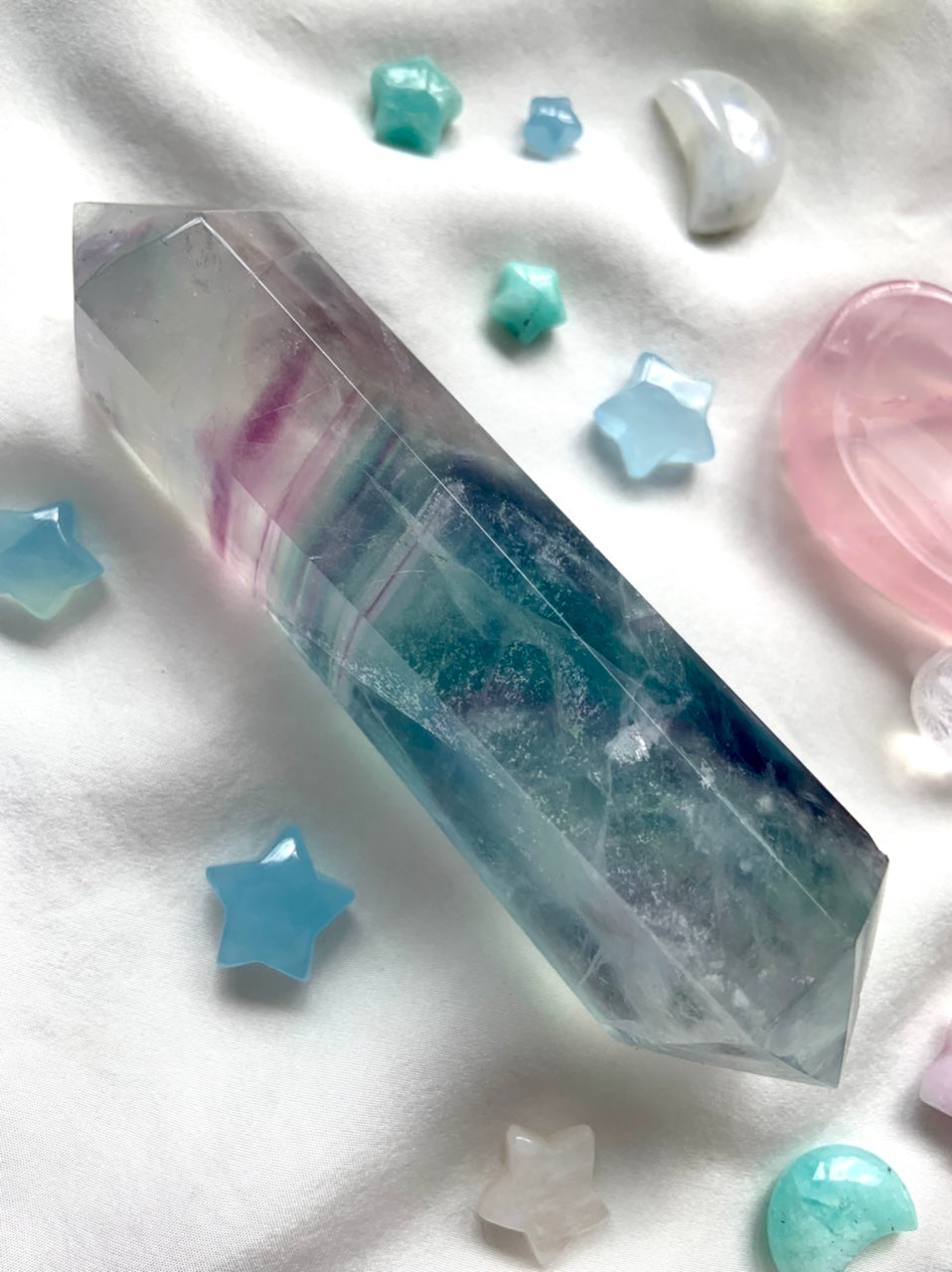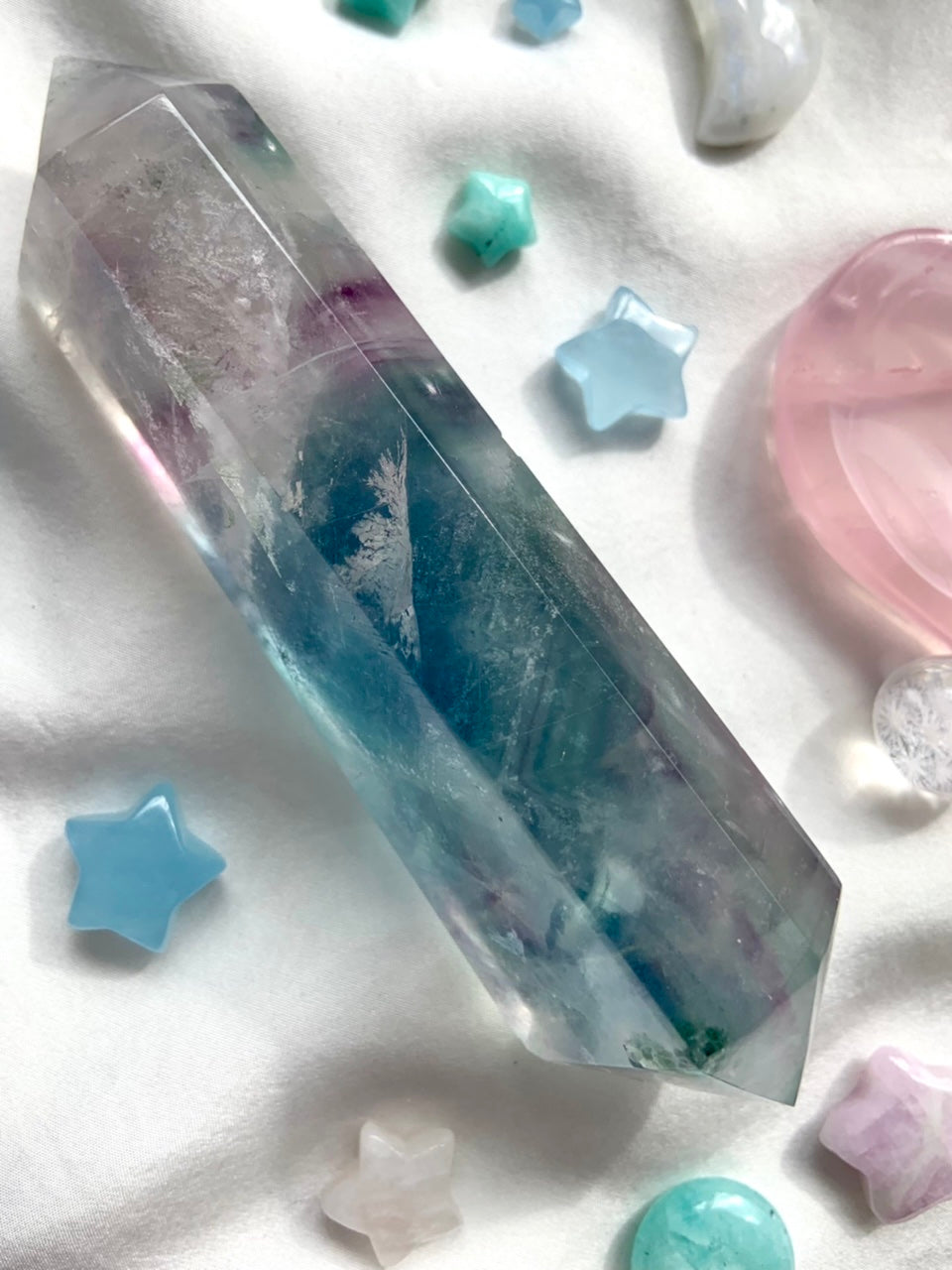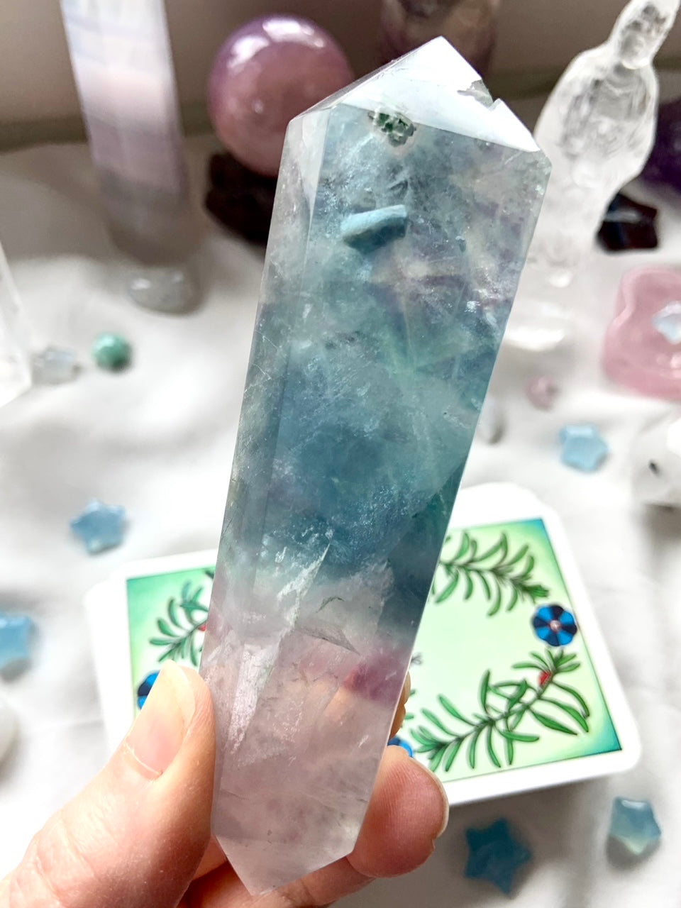 The watery colors of pale to deep blue, teal + purple of this sparkly, transparent Fluorite double terminated crystal conjure Akashic memories of Atlantis + Lemuria.