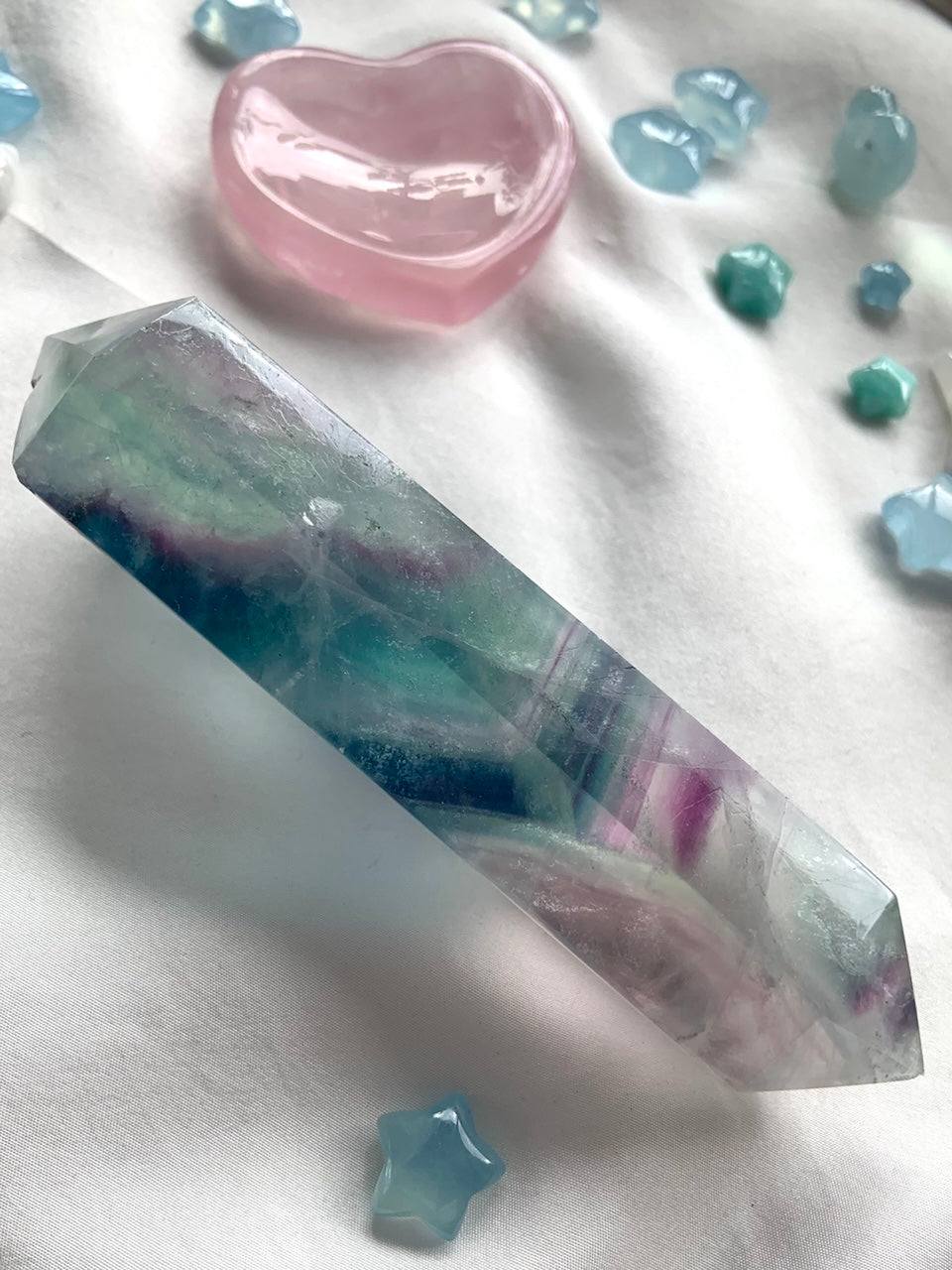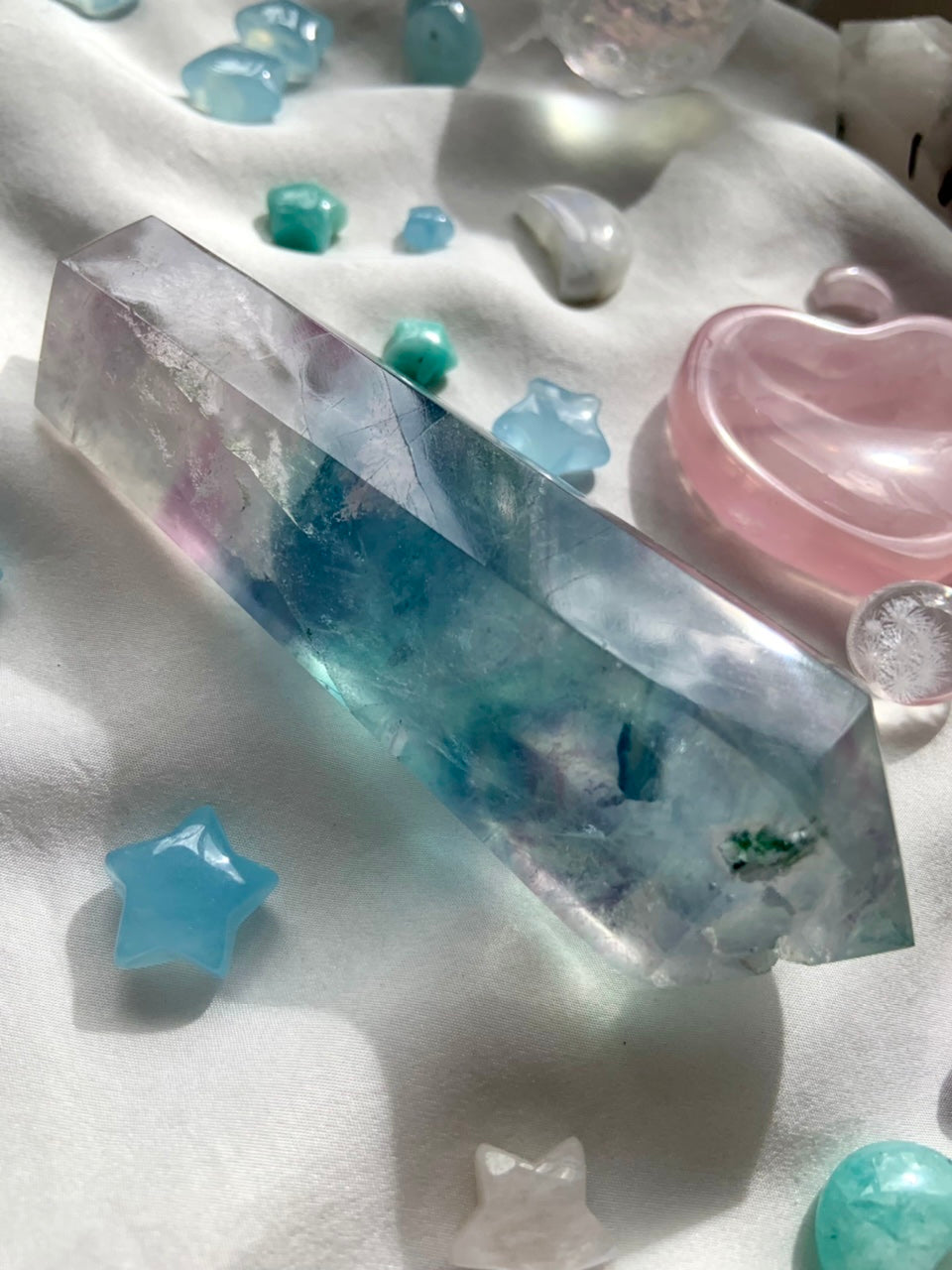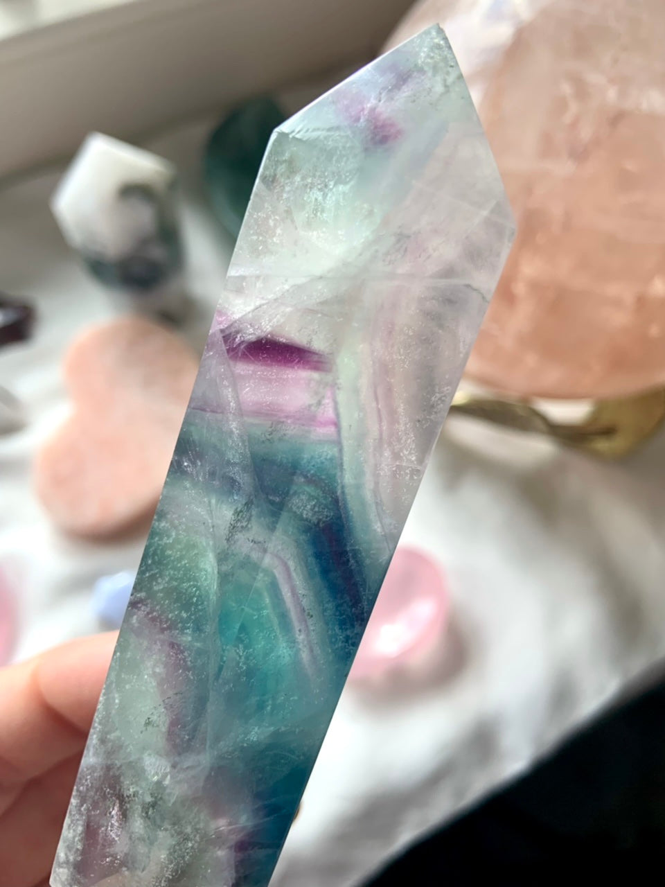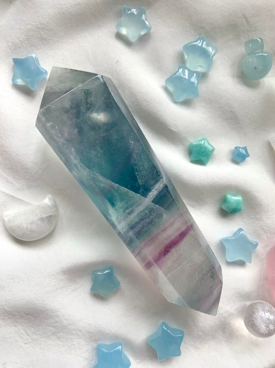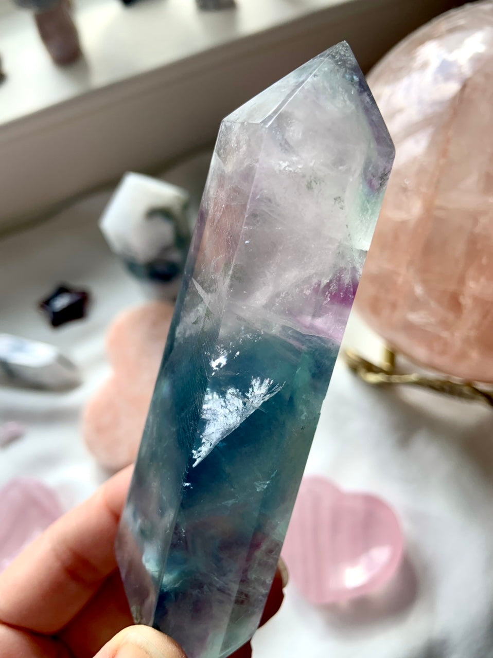 The watery colors of pale to deep blue, teal + purple of this sparkly, transparent Fluorite double terminated crystal conjure Akashic memories of Atlantis + Lemuria.