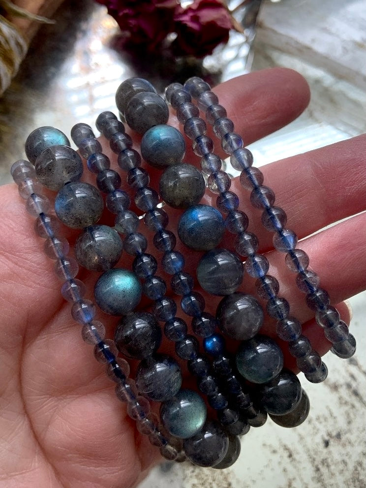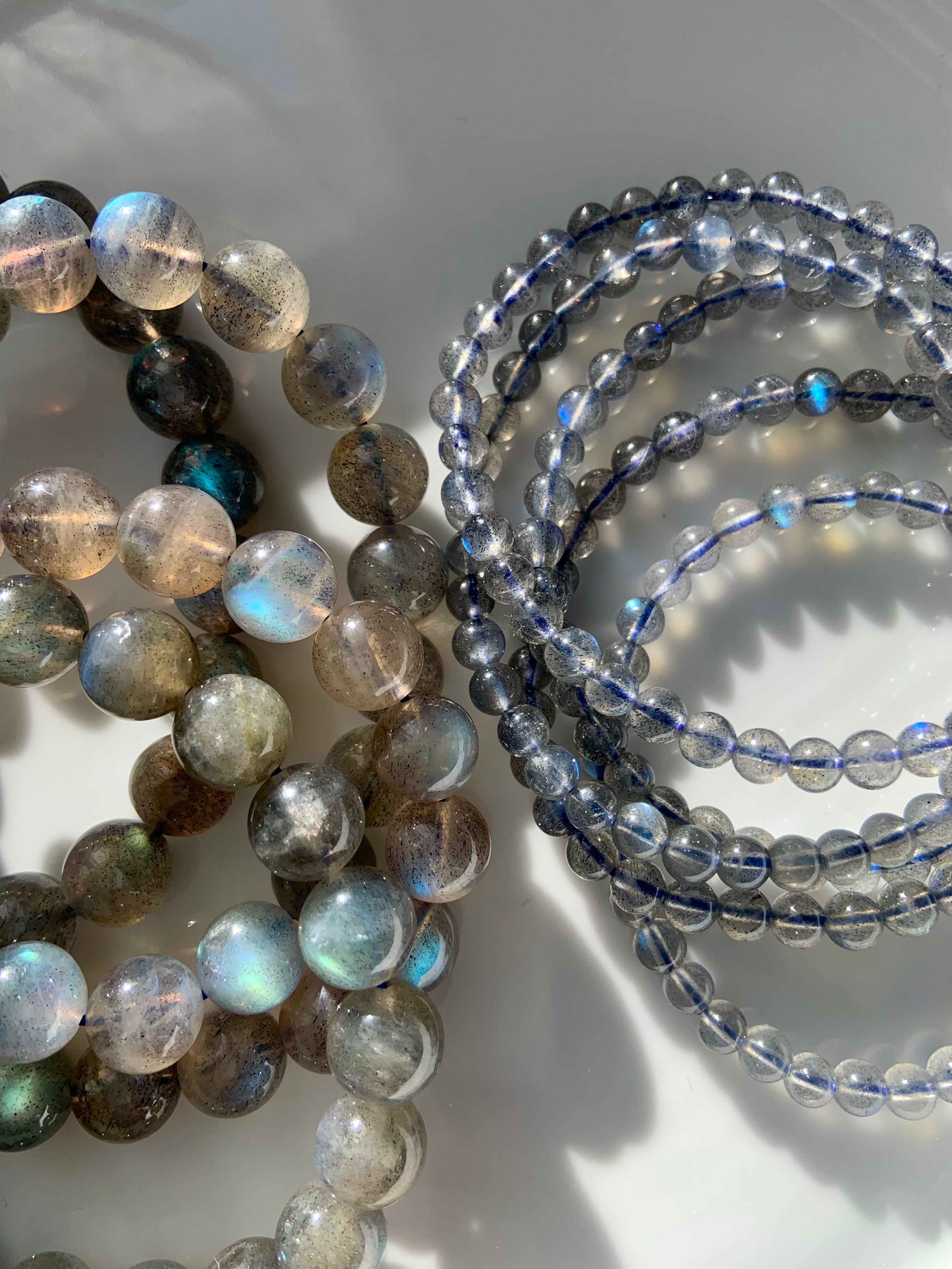 Get your Goddess on with a stack of luminous Labradorite Crystal Bracelets. Labradorite is a stone of insight, magic + destiny. When life's got you feeling like you need a cosmic reboot ~ wear one of these beautiful luminous Labradorite bracelets to help you through it!
