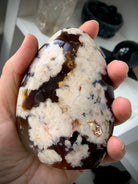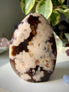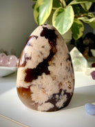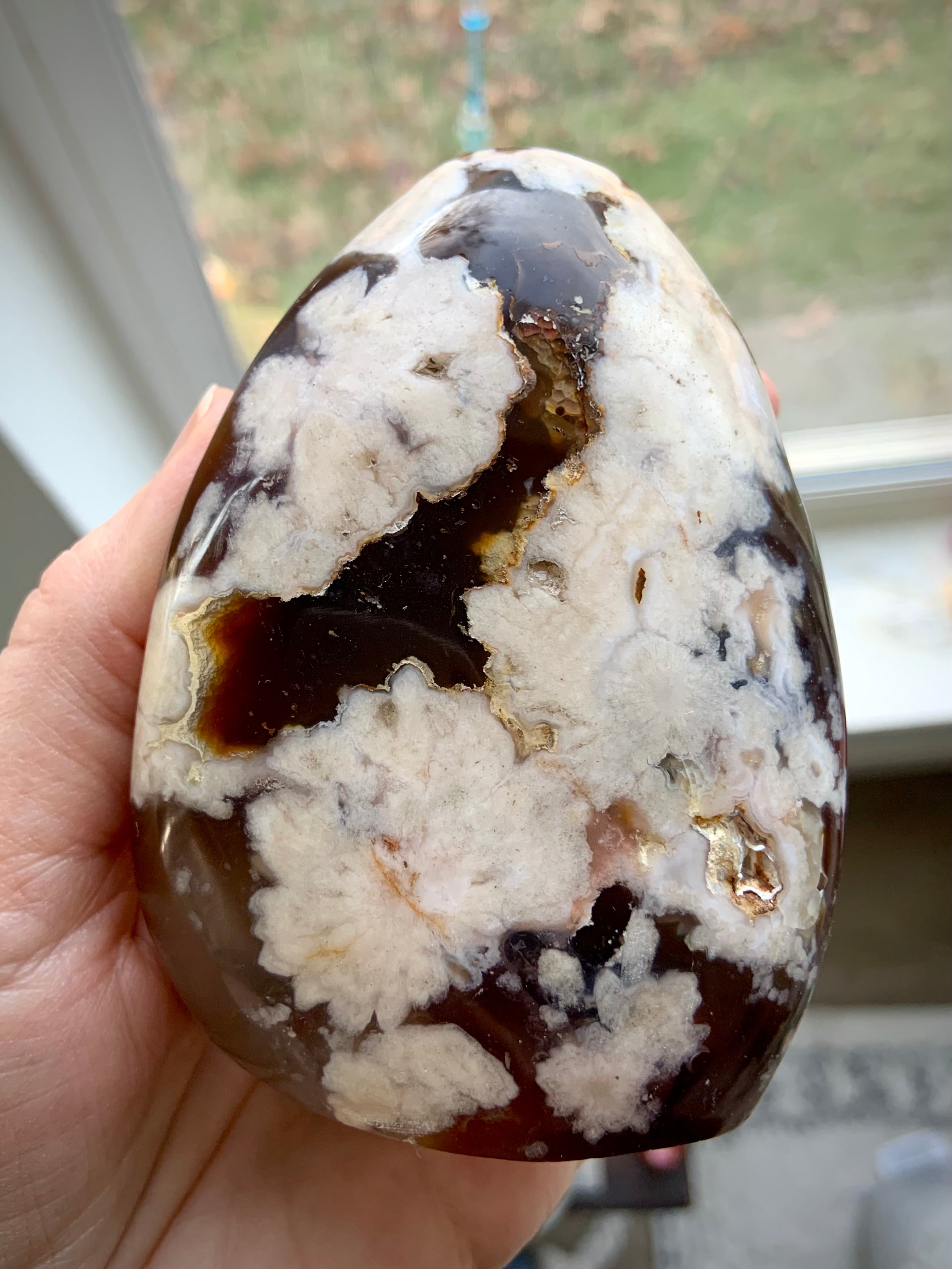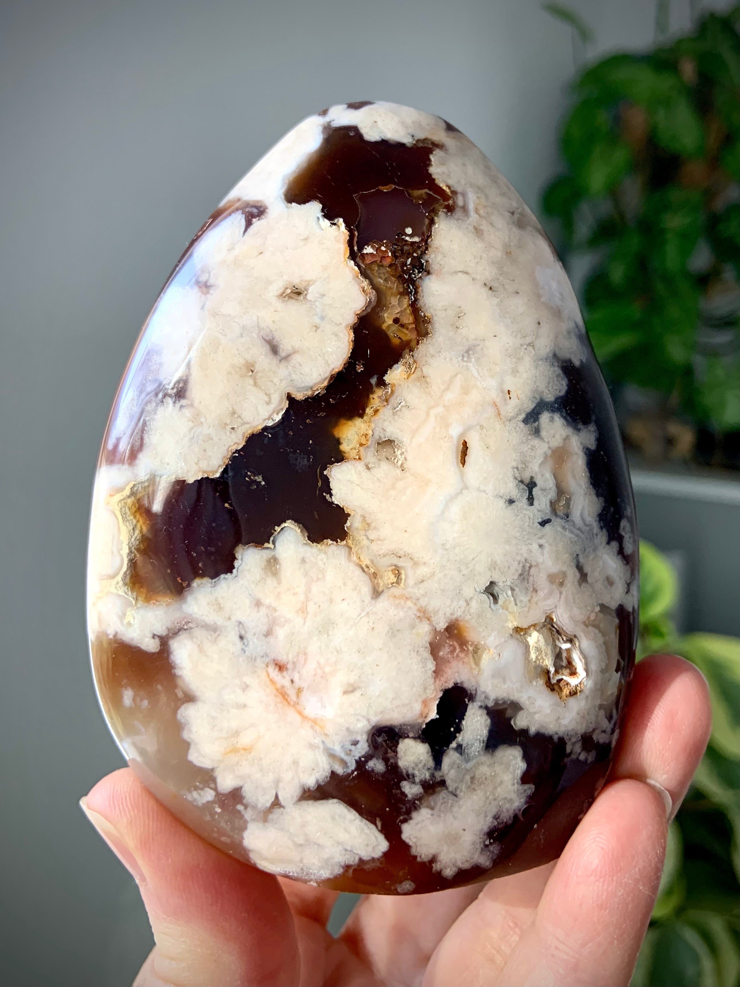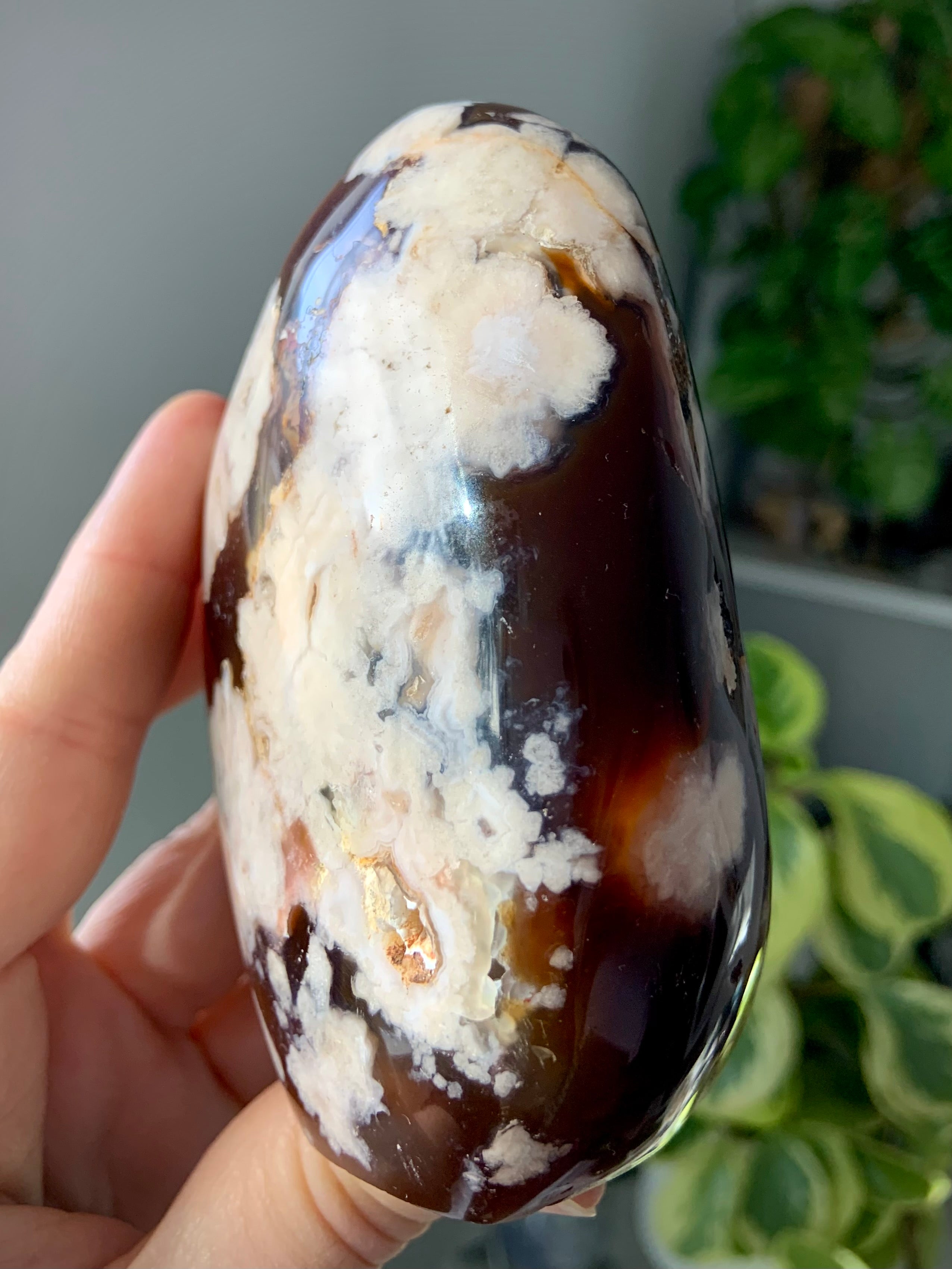 There is a lovely cascade of well-formed cherry blossoms + a small druzy pocket on the main face of the stone. This one has a very nice natural spiraling amorphous shape that makes it comfortable to hold in meditation + a flat base that displays lovely amongst your crystal collection.