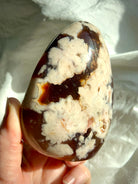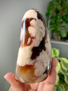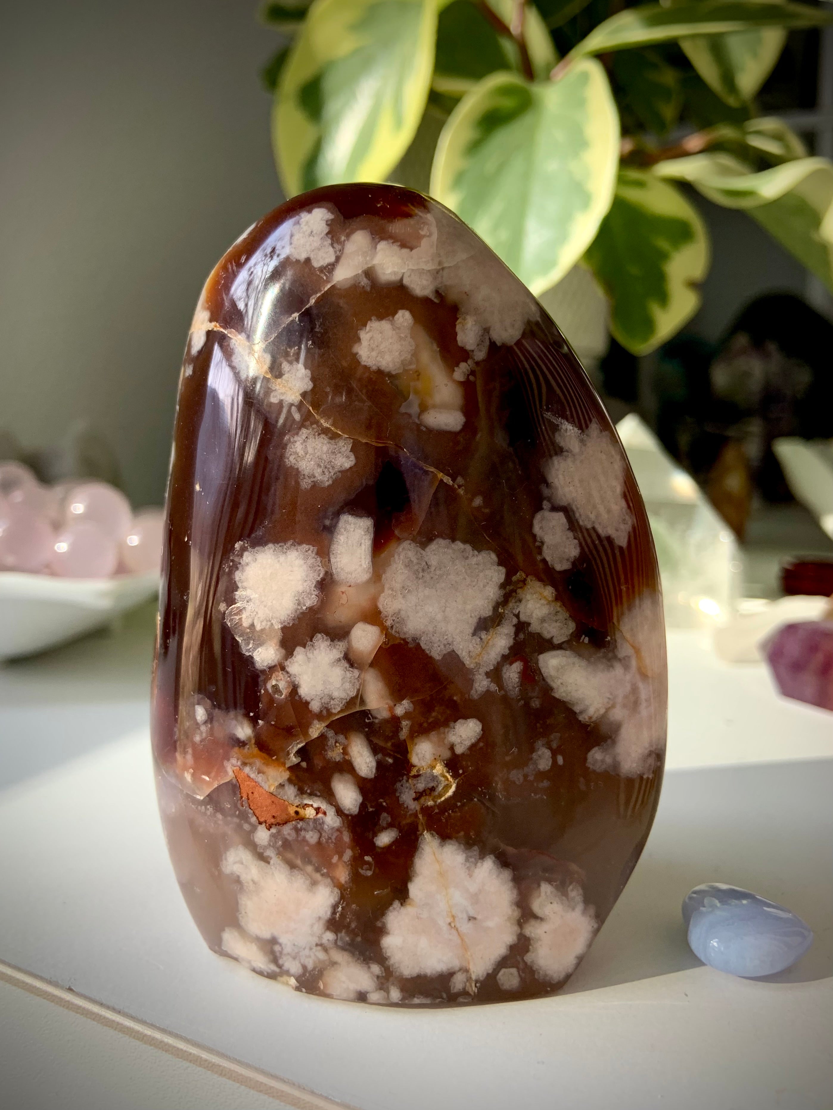This unique crystal freeform is a combination of Carnelian + Flower Agate with lovely pale creamy pink cherry blossoms suspended in a dark amber + earthy brown colored Carnelian Agate matrix, a very unique + highly collectible sepia toned specimen.