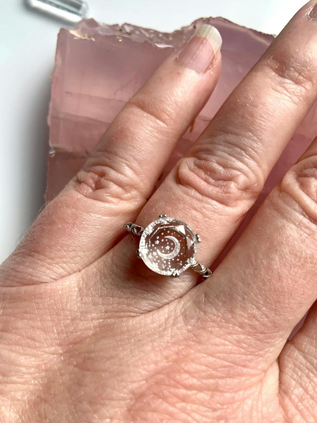 Set in an adjustable sterling silver band, this celestial crystal ring captures the light in a magical way — a timeless adornment for intention-setting, moon rituals, or simply bringing a sense of wonder to your everyday style.