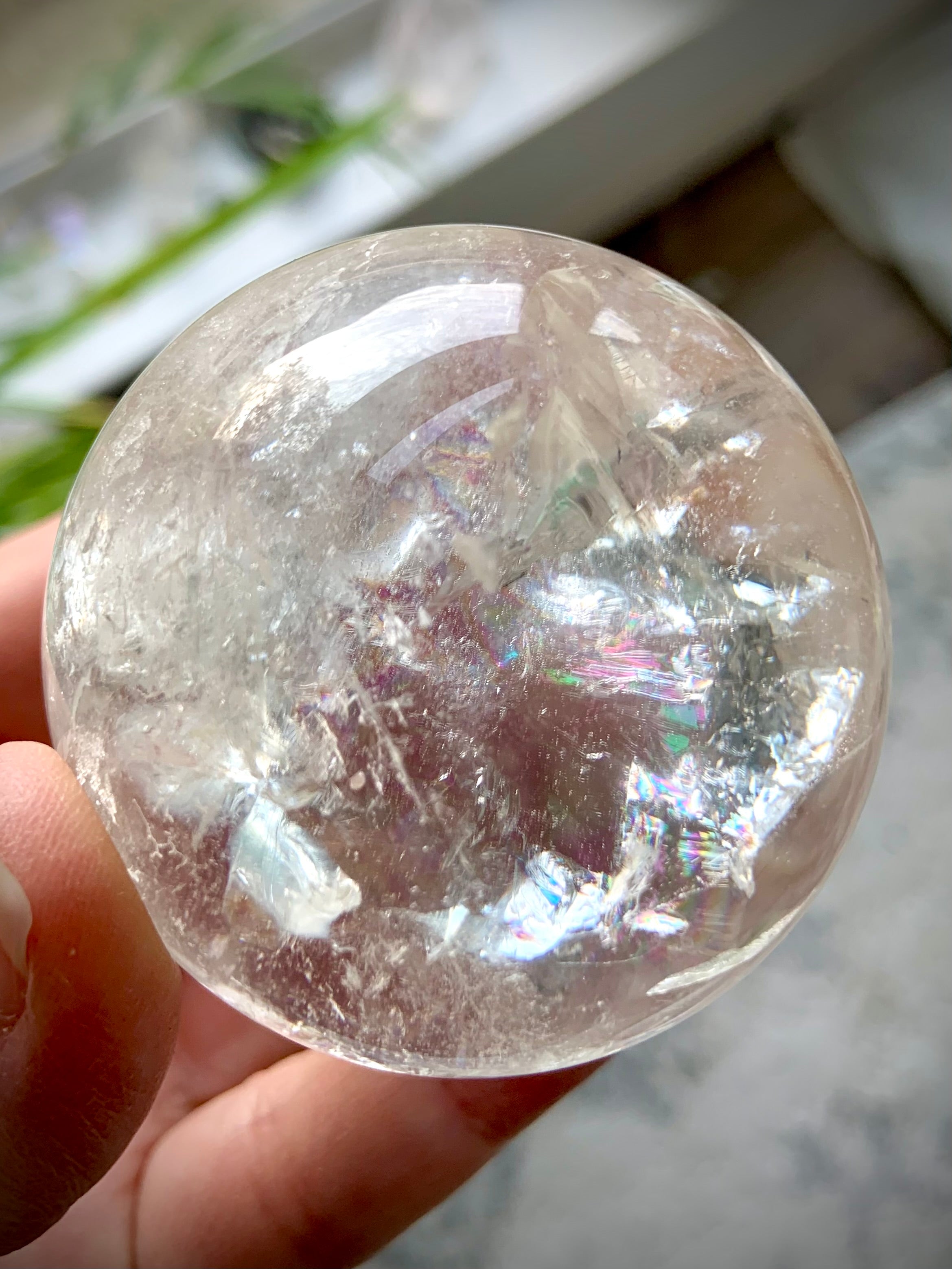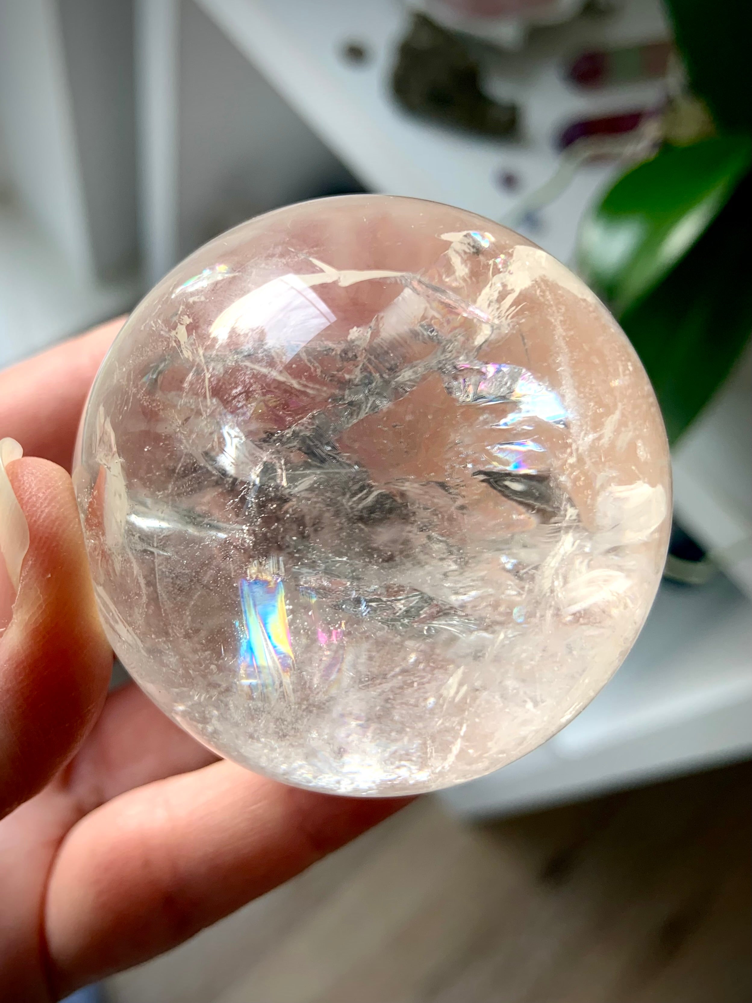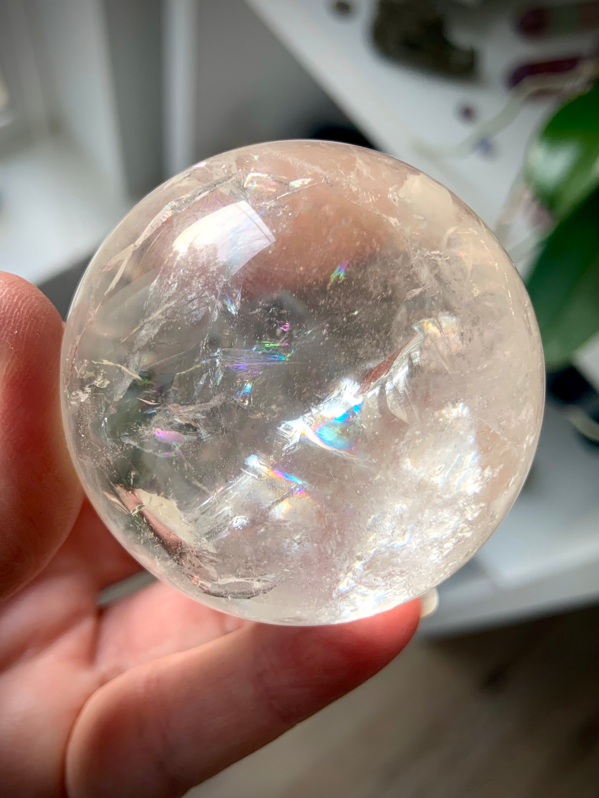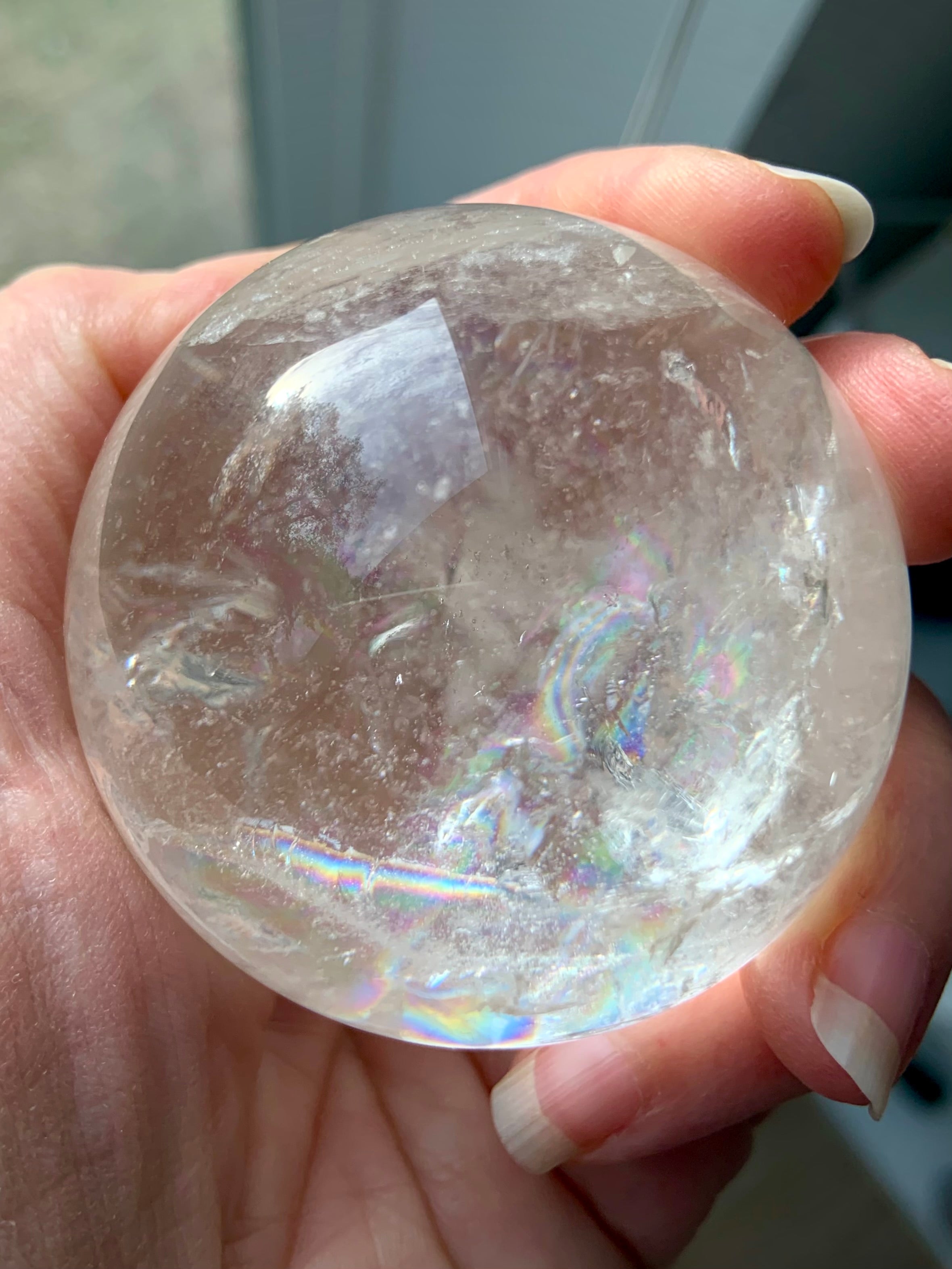 Crystal Spheres radiate energy in all directions. The crystal ball shape allows the light + energy to move above, below + toward all four sacred directions of the crystal. Light passes through the crystalline core illuminating the brilliant rainbows + patterns of the natural quartz crystal from virtually every angle.