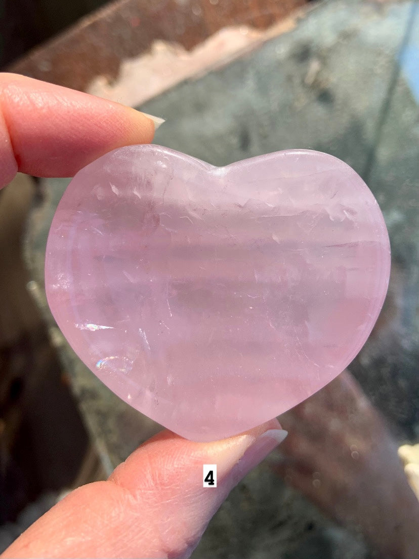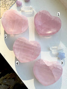 You will receive the exact rose quartz crystal heart bowl that you choose from the numbered pictures. Each crystal is unique in color hue/saturation, clarity/transparency, inclusions + patterning of the natural stone.