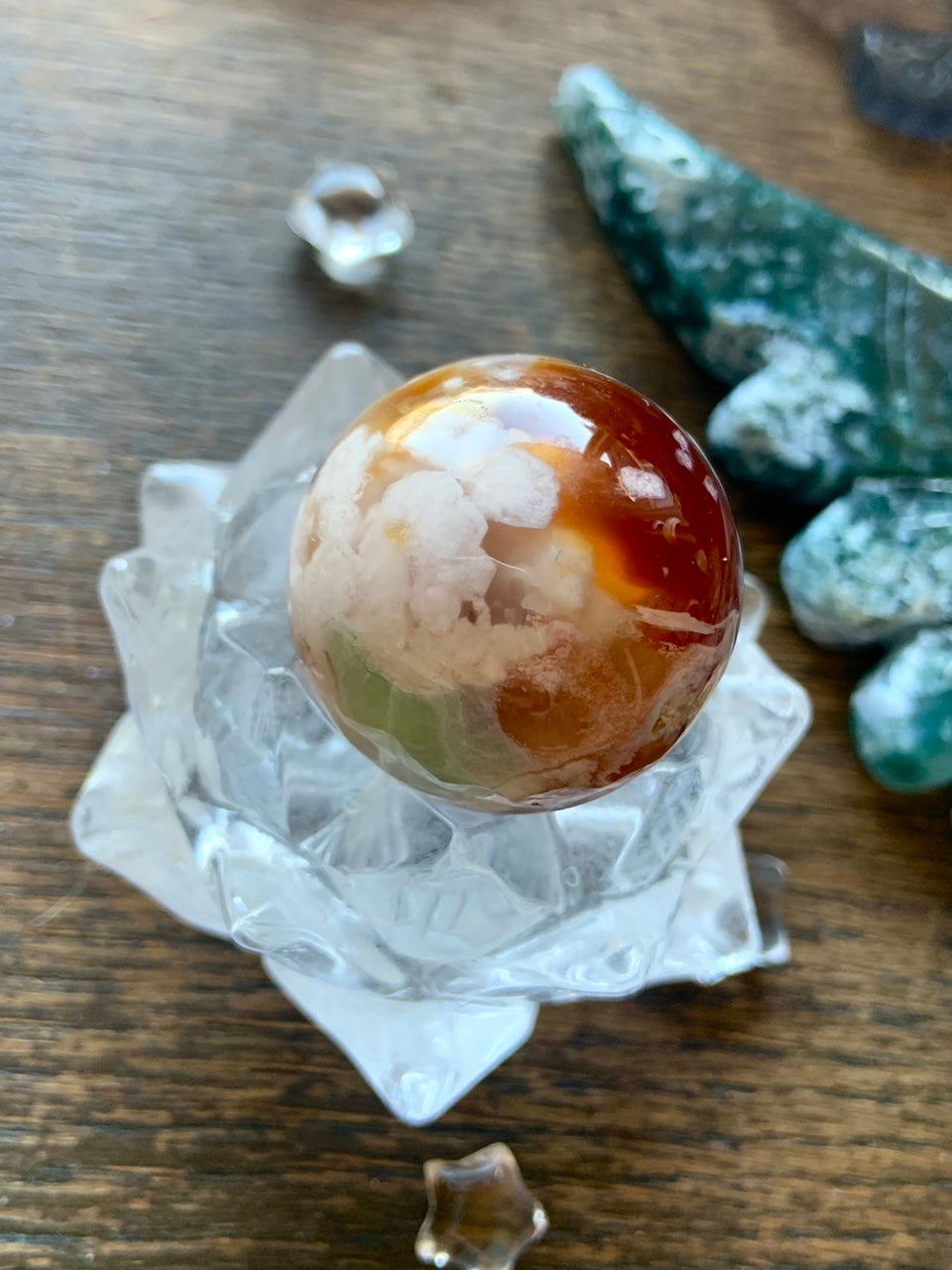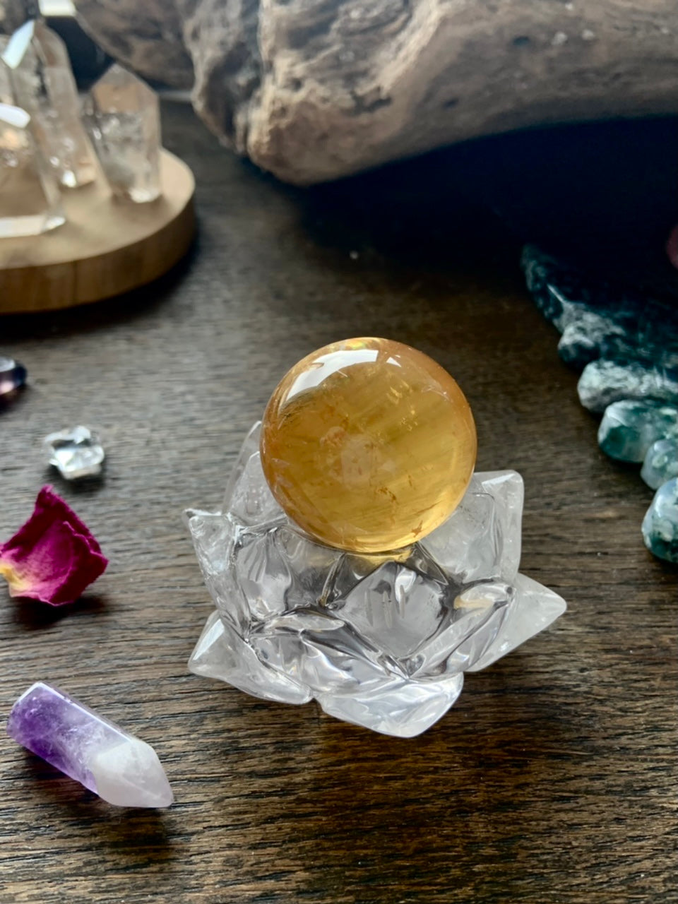 These quartz crystal lotus flowers are hand carved from a substantial chunk of crystal + make a beautiful meditation stone. The Honey Calcite Sphere in the center is 34mm diameter, the small pink Kunzite sphere is 15mm, the carnelian flower agate sphere is 32mm. You will receive the exact crystal flower that you see in these pics.