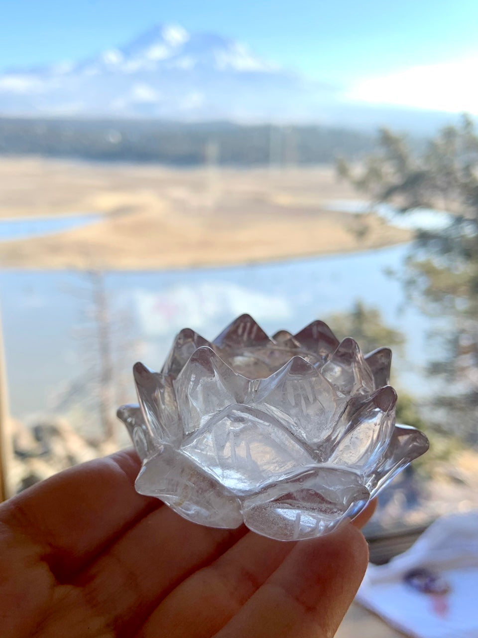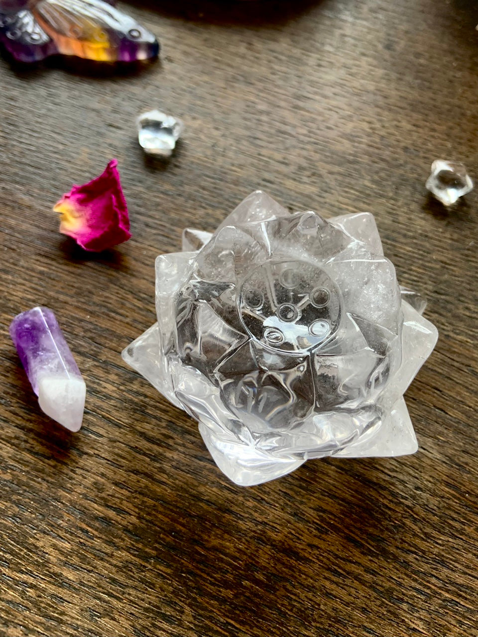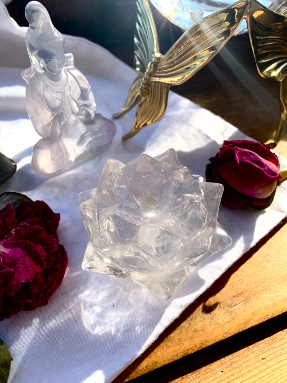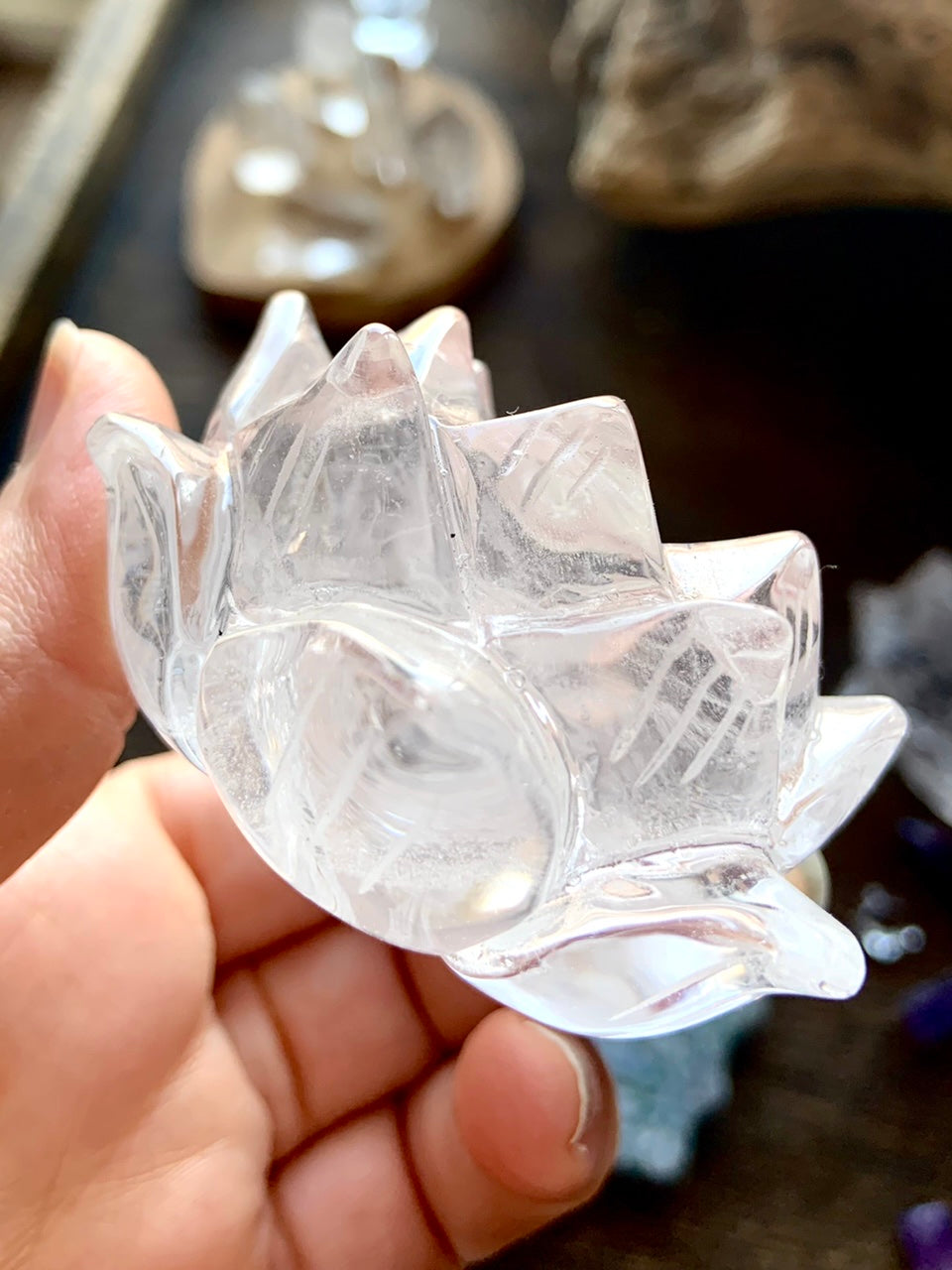 This lovely crystal lotus flower will make a stunning addition to your botanical crystal collection. It's a hand-carved flower made from clear quartz crystal with some lovely interior dimension.