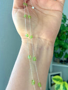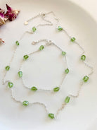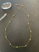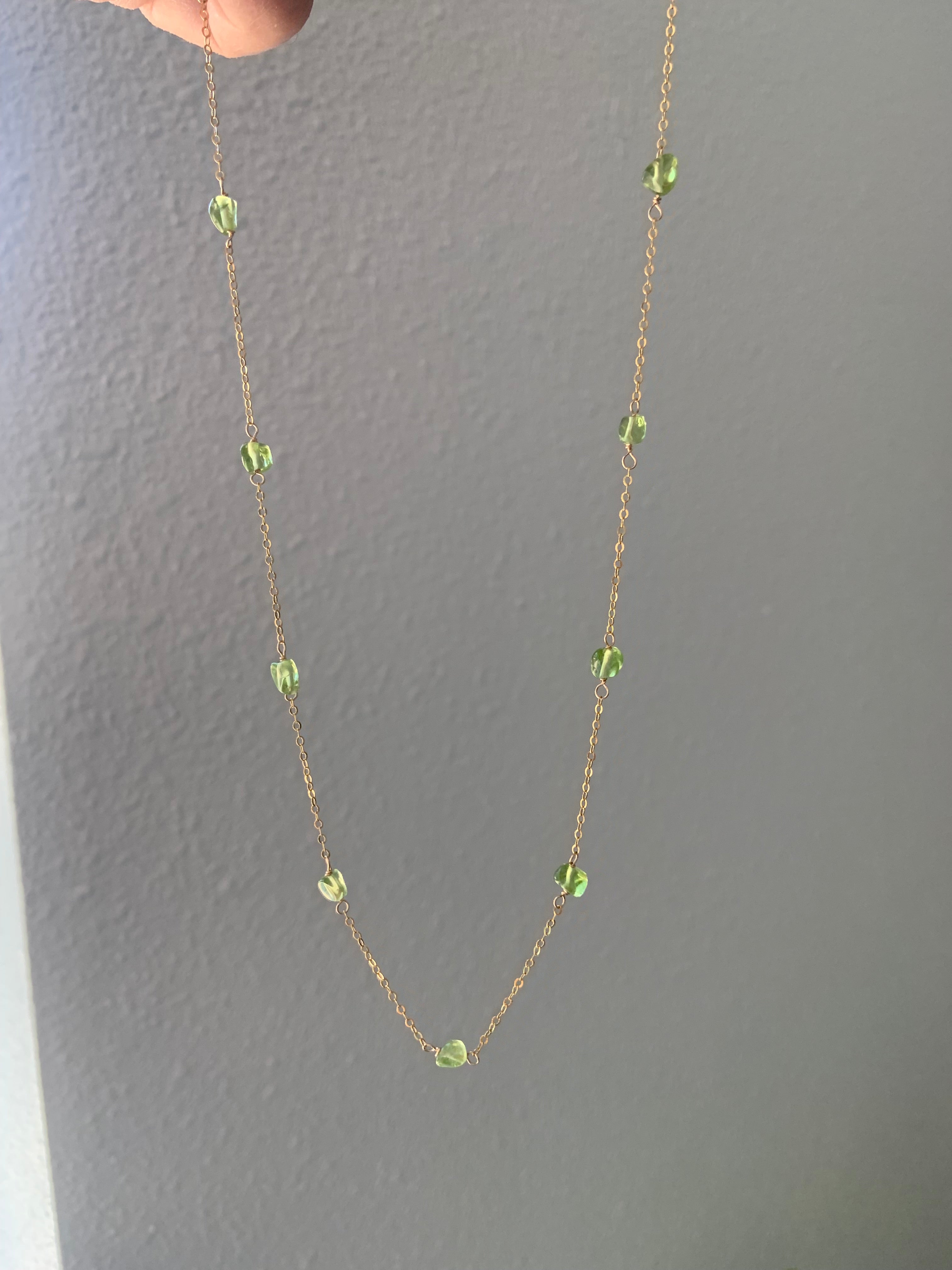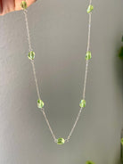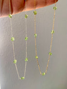 Adorn yourself in our Peridot Satellite Necklace in your choice of sterling silver or gold filled chain makes such a sweet + thoughtful gift for yourself or someone special. Our dainty gemstone necklace features a delicate chain with smooth Peridot gems at equal intervals, like the orbit of a satellite.
