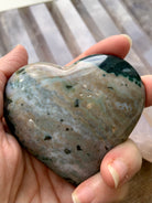 This beautiful Ocean Jasper Heart is full of wisdom + personality. The stone has lovely contrasting colors, dark green, mauve, pale pink, bluish gray, tan, white, + pale lavender colors with orbs + a sparkly quartz vein in the natural stone. This crystal heart is a nice shape + size to use as a meditation stone.