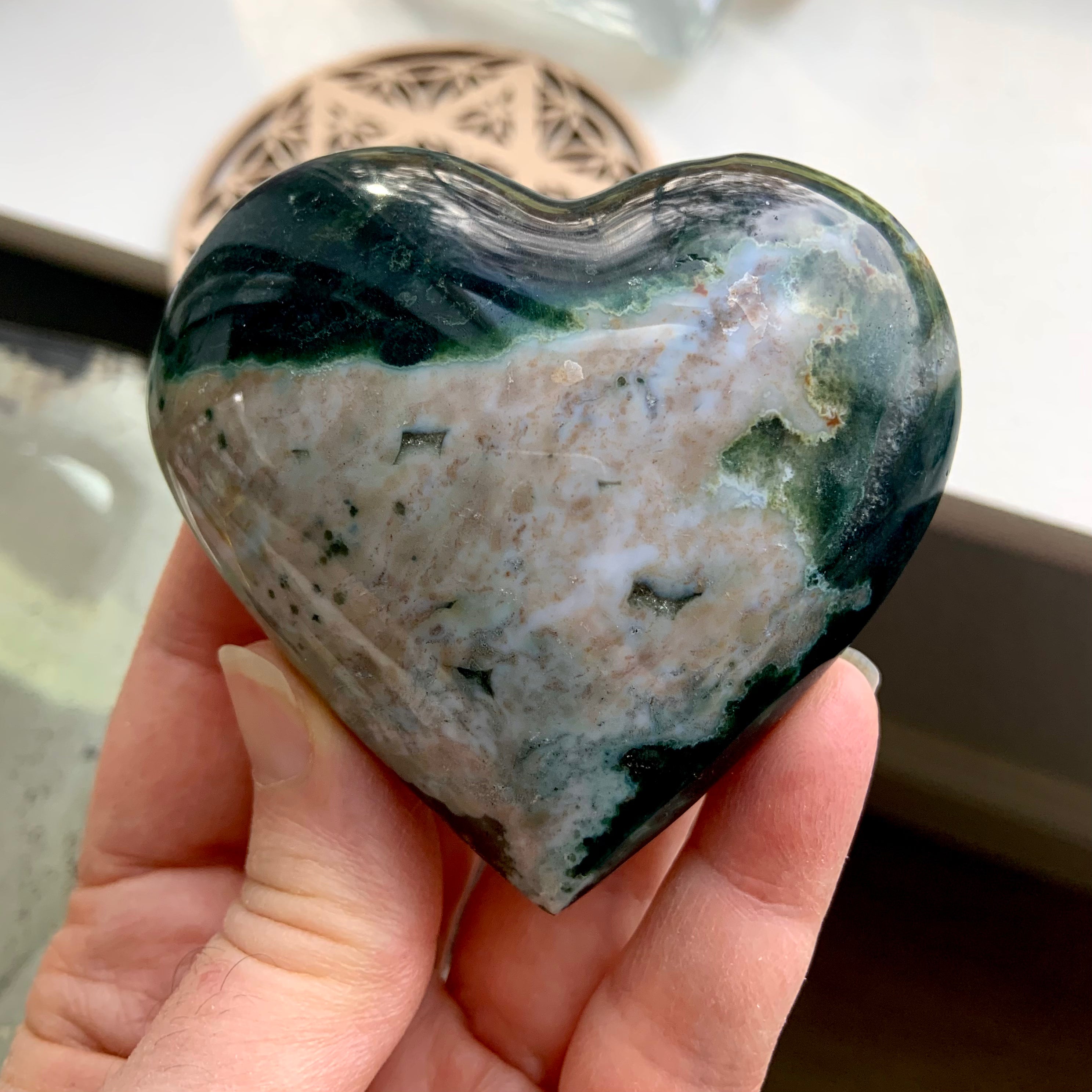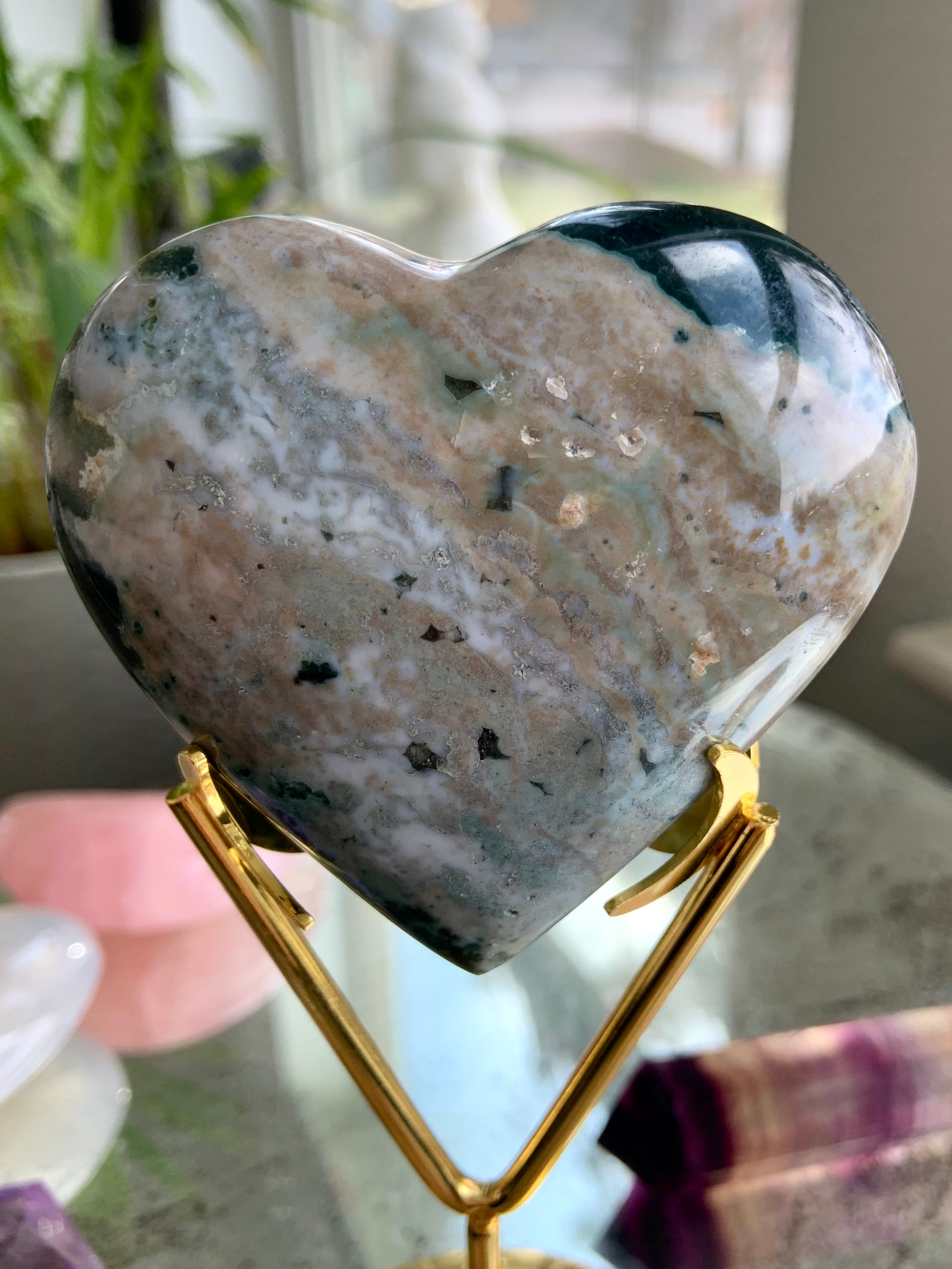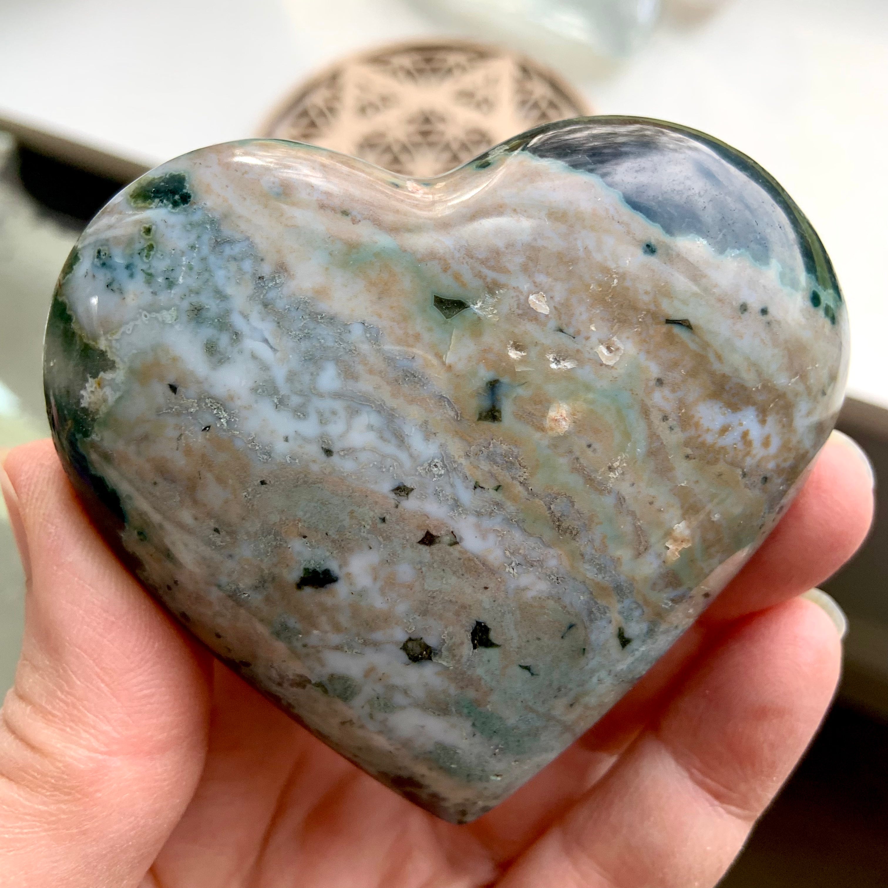 Meditate with this Ocean Jasper Crystal Heart to awaken your inner wisdom. Ocean Jasper supports your exploration, expanding your awareness of the unseen energies + etheric realms, facilitating a deeper awareness of those mythical, magical places beyond the veil.