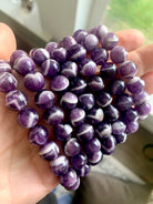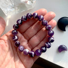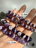 These stunning high quality Dream Amethyst beaded bracelets have extraordinary chevron patterns of deep purple + contrasting white zigzags in the stone. Dream Amethyst aka Chevron Amethyst, is a combination of Amethyst + White Quartz, layered to form a V-banded or striped pattern that resonates with the Crown Chakra to boost your intuition.