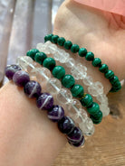 The first pic with a goddess stack shows the Amethyst worn with our Tigers Eye Bracelet, High Quality Black Tourmaline Bracelets + colorful Faceted Mookaite Jasper Bracelets. The second pic showing a gemstone bracelet Goddess stack show the Chevron Amethyst with our Clear Quartz Flower Bead Bracelet along with two bead sizes of our Green Malachite Bracelets + a round bead Clear Quartz bracelet, are also available in our shop.