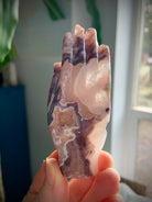 Consider this extremely rare + exquisite pink + purple Moss Agate Hamsa for your sacred space. This stunning Hamsa hand is carved from a stunning piece of multicolored Moss Agate with beautiful white filigree outlines, distinct peachy, pink + purple color patterns with crystalized quartz + sparkly druzy.