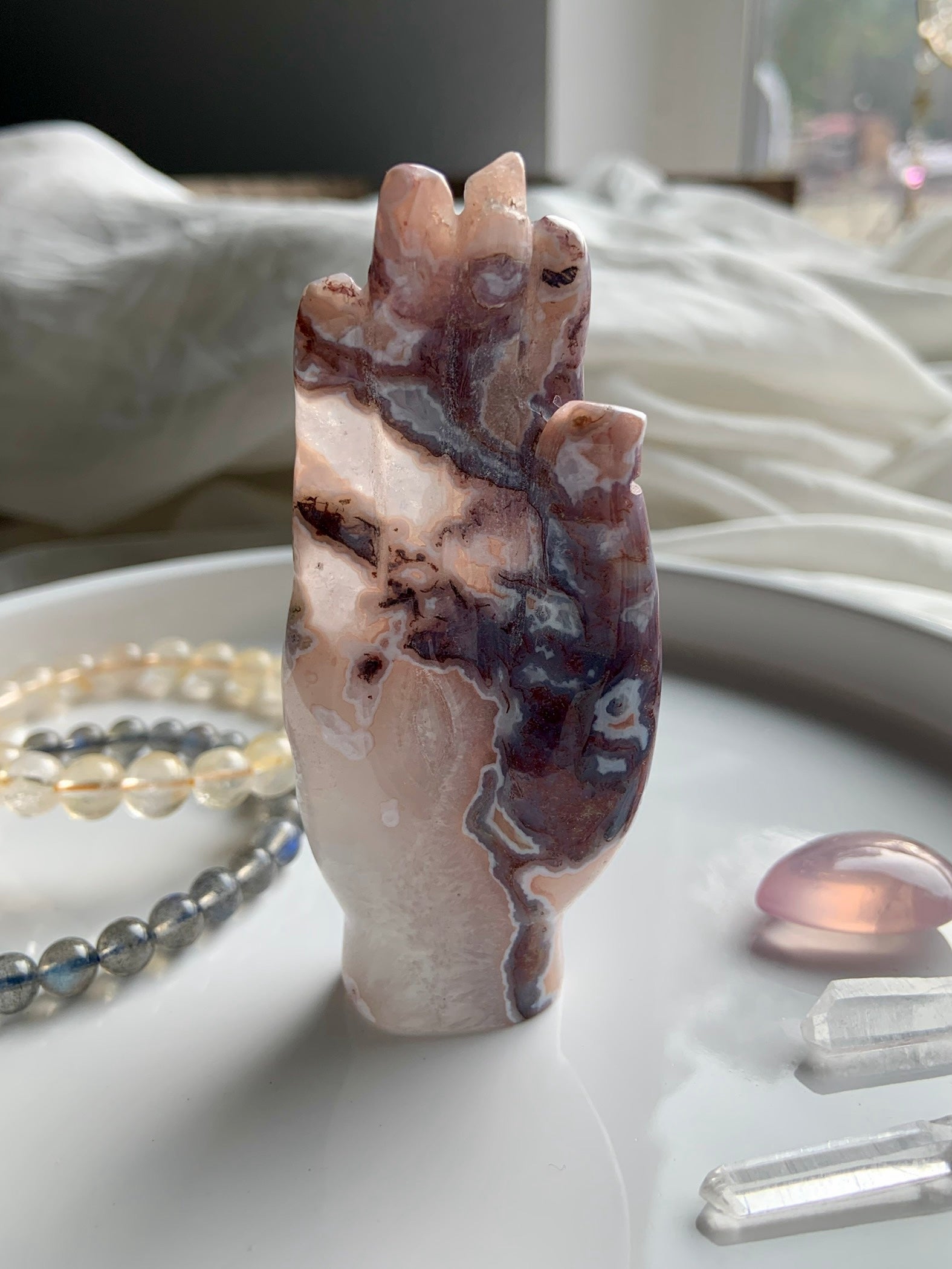 Rare Pink Moss Agate Hamsa Carving