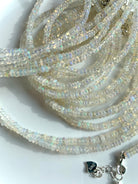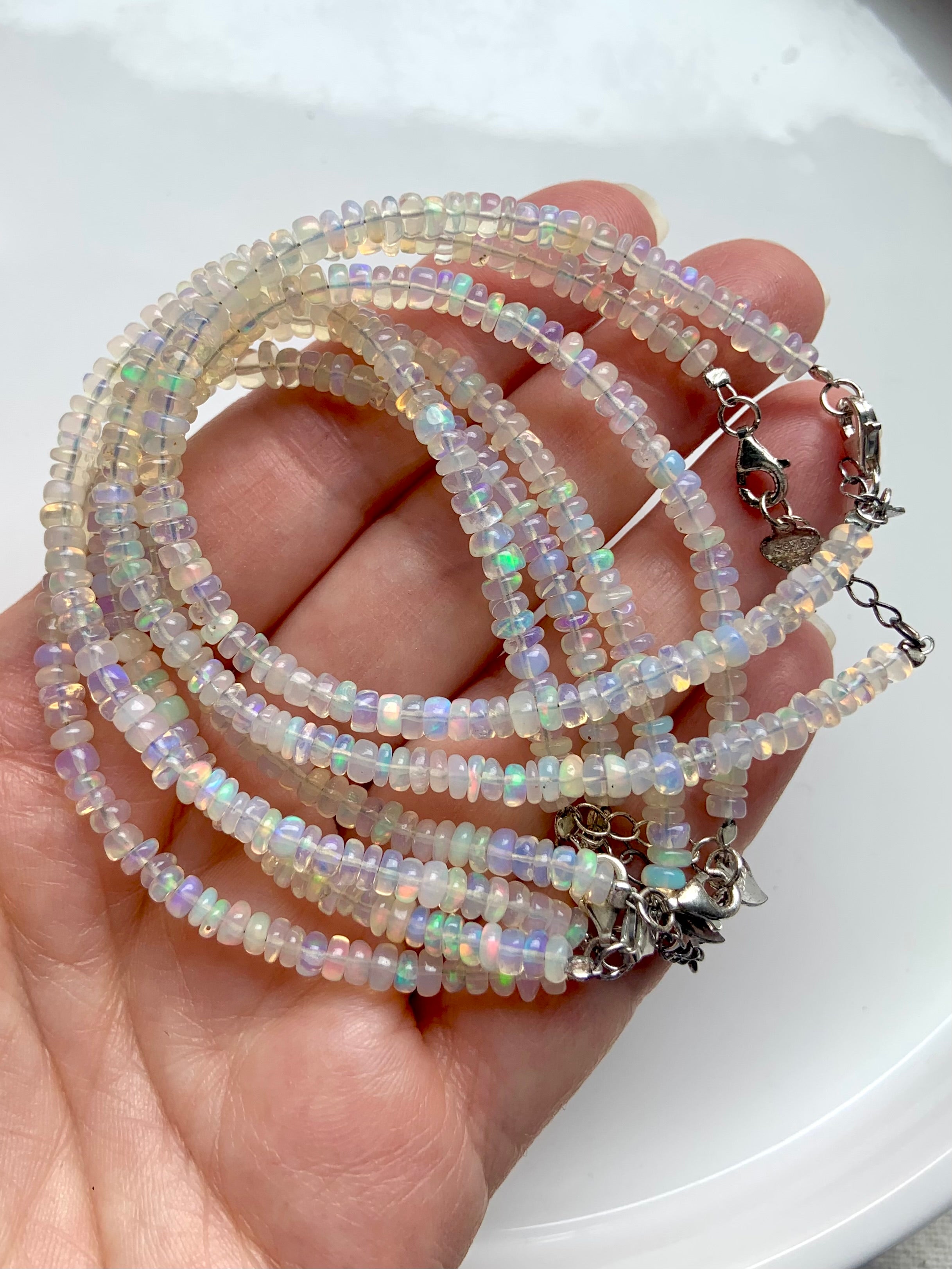 These Fire Opals are a form of white opal, also known as Welo Opal because it's found exclusively in the Welo region of Ethiopia. The fiery flashes of colorful patterns in this crystal are created by the arrangement of silica particles within the amorphous solids that form the stone.