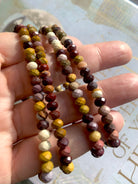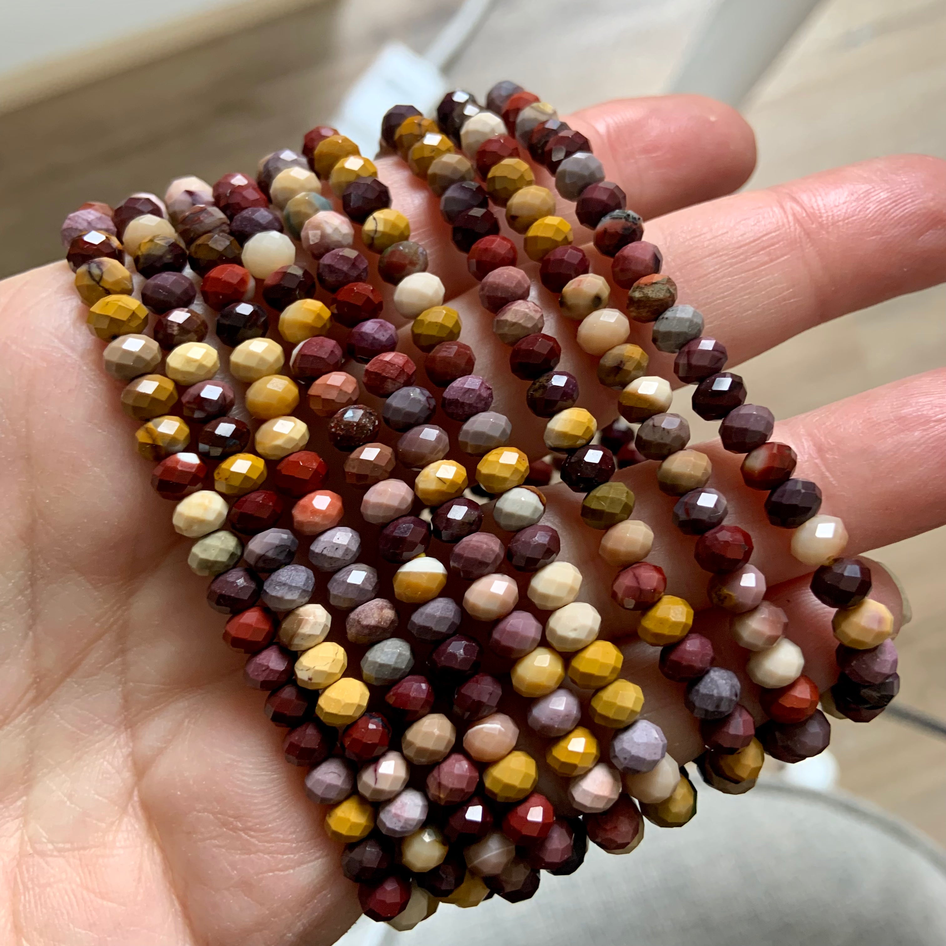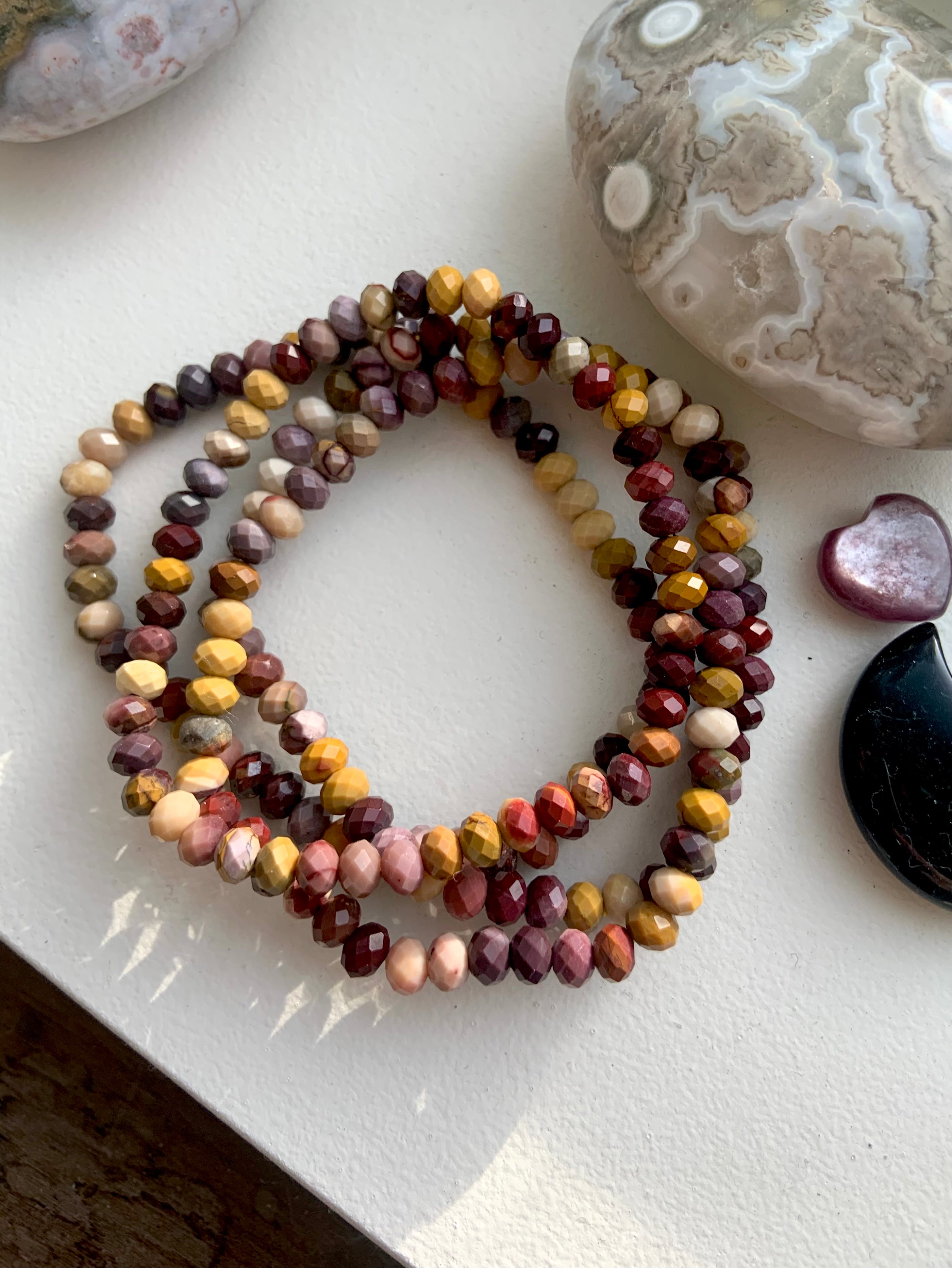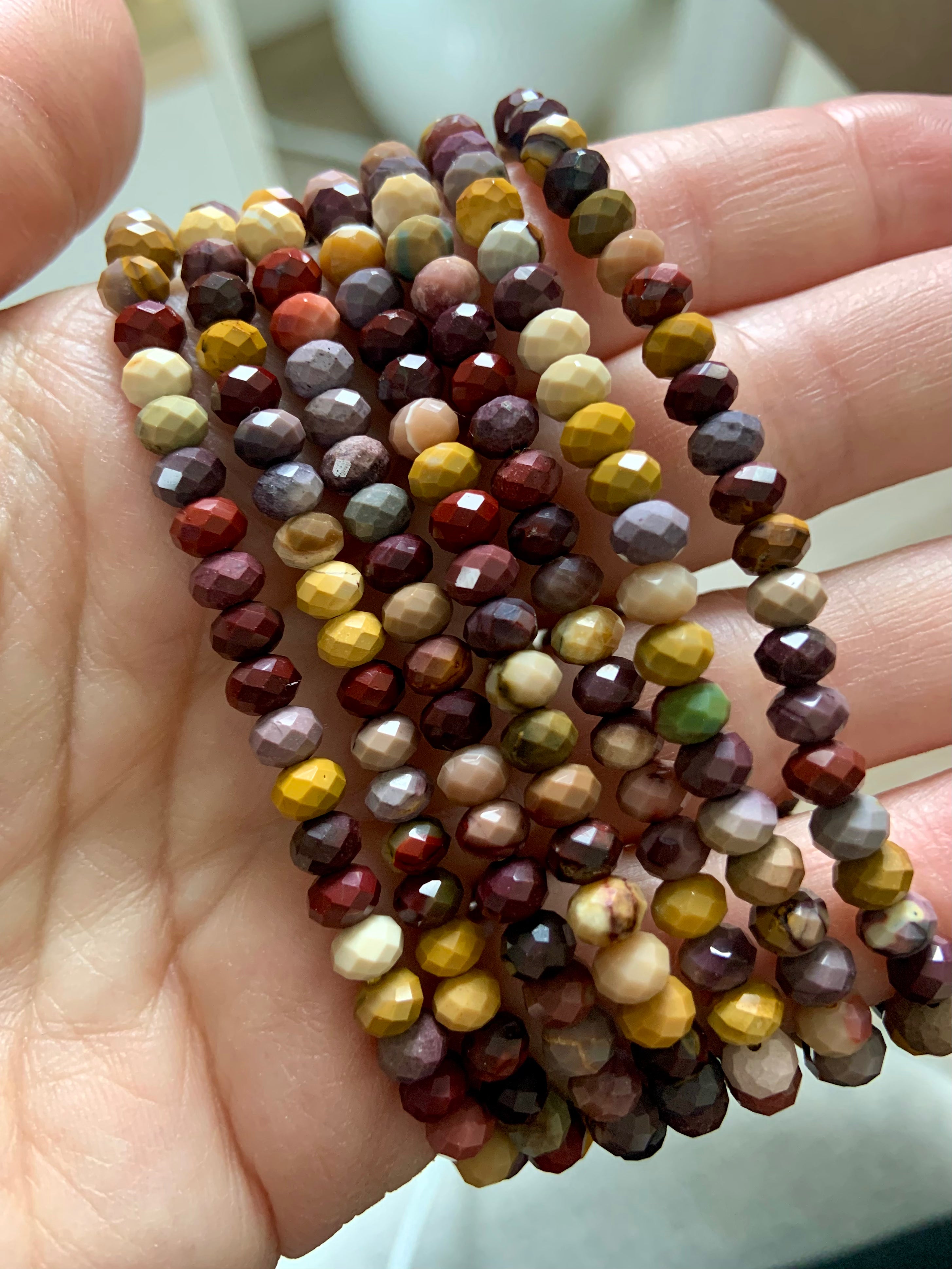 Sparkly, colorful faceted rondelle-shaped Mookaite Jasper beaded bracelets help stabilize your energy while bringing a sense of adventure to your day. The healing vibrations of Mookaite Jasper connects you with the powerful medicine of the Earth.