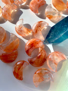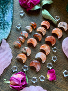These beautiful Hematoid Quartz crystal moons are a combination of Fire Quartz + Golden Healer. These magical crystal crescent moons have a high energetic vibration that can assist in transforming + transmuting negativity into a more positive energetic state.