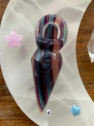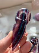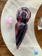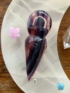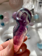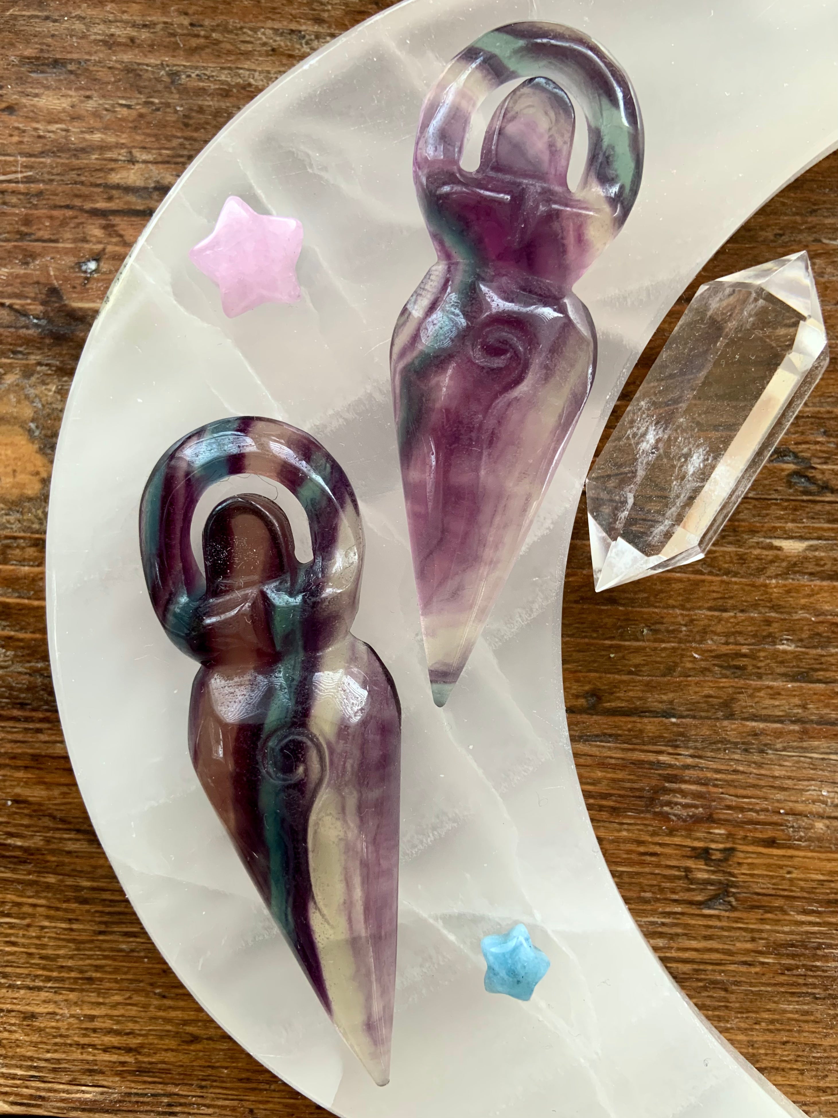 Bring the energy of the Divine Feminine into your space + your sacred self care practices with one of these hand-carved Crystal Goddess Figurines. Shaped out a beautiful multi-colored crystal called Fluorite, she is the Spiral Goddess. With the spiral of life on her belly, she can hold your intentions as a meditation tool, manifestation talisman or a fertility crystal.