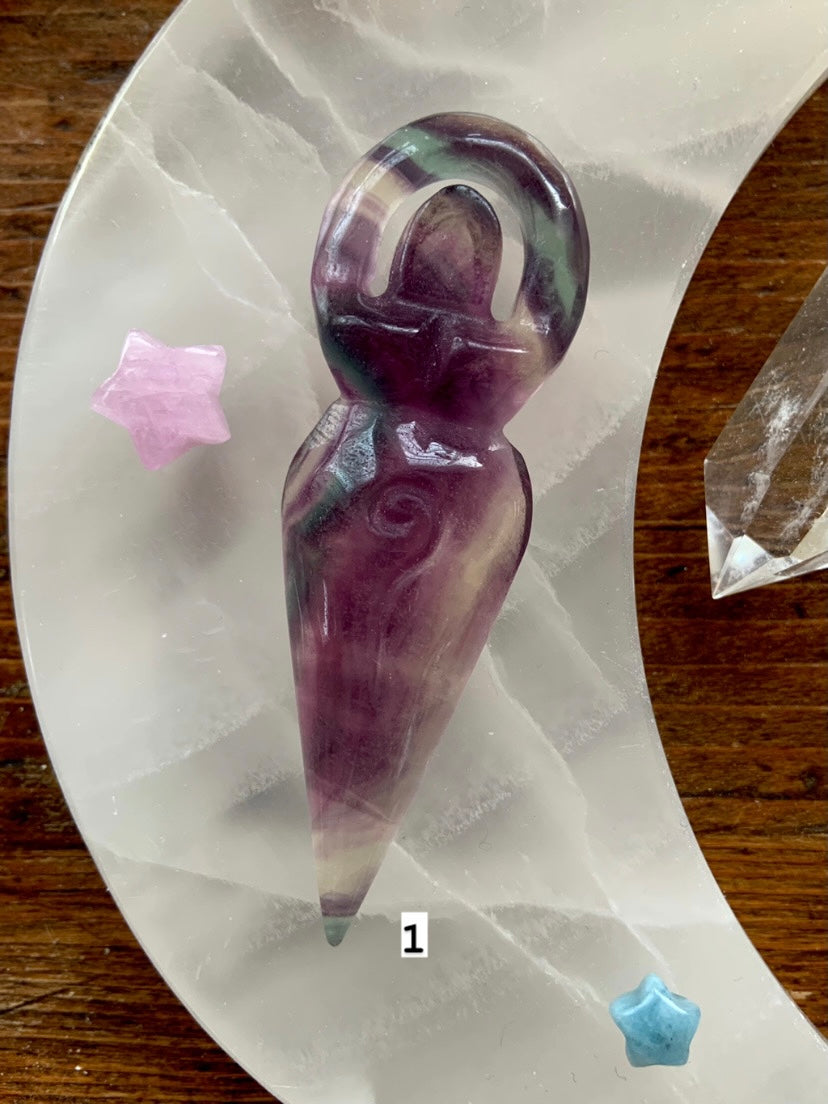 You will receive the exact fluorite goddess that you choose from the numbered pictures. Natural stones may have inherent marks, mineral inclusions, or slight imperfections. Weights + measures are approximate.