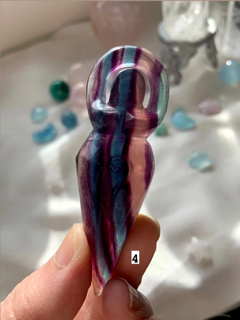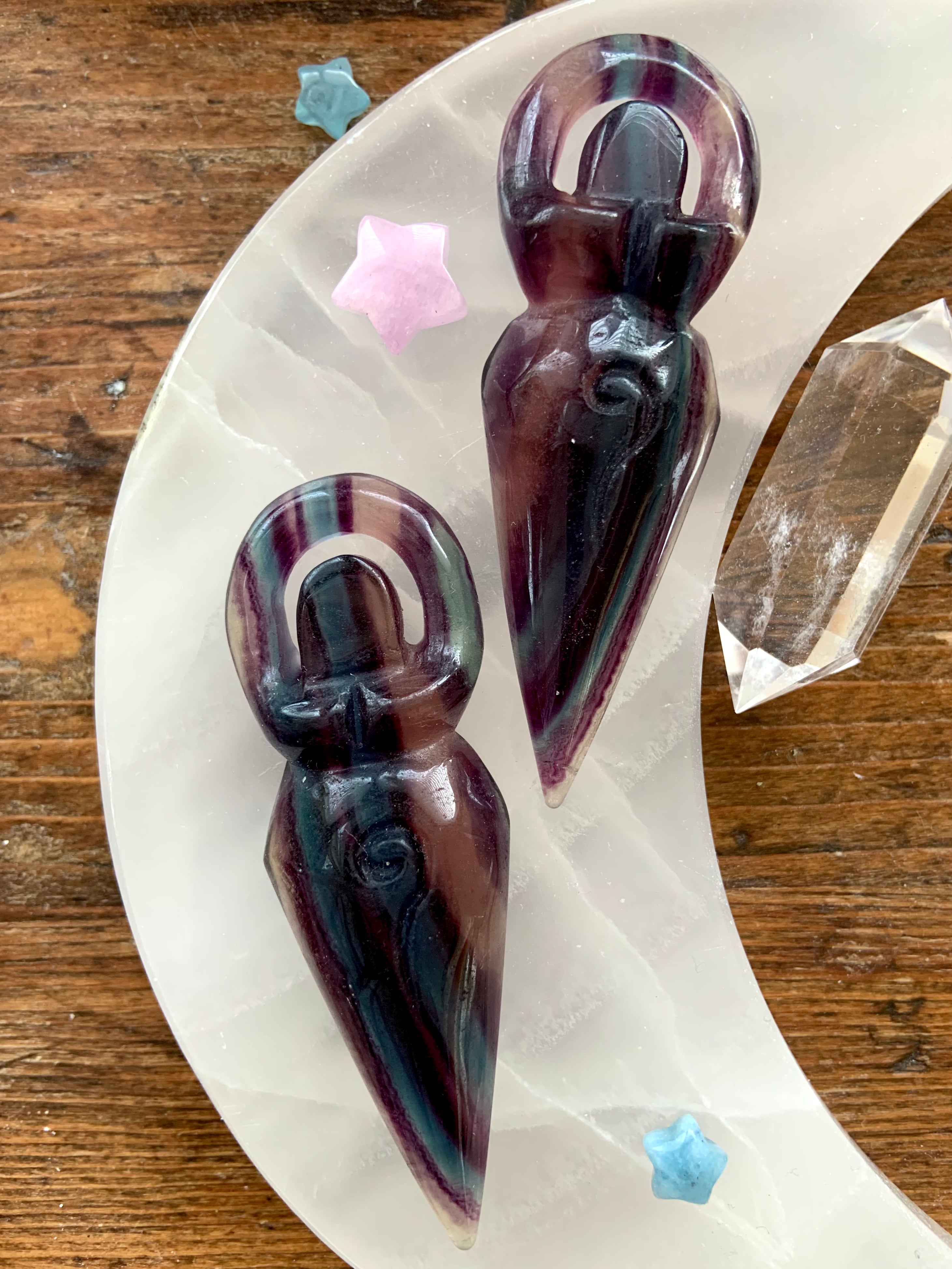 Fluorite crystals have a grounding + harmonizing spiritual energy coming through in the clear, blue, teal, magenta, purple colors + undulating patterns in the natural stone. Bring peace, bliss, calm + positive vibes to your sacred space with these luminous Fluorite Goddess carvings.