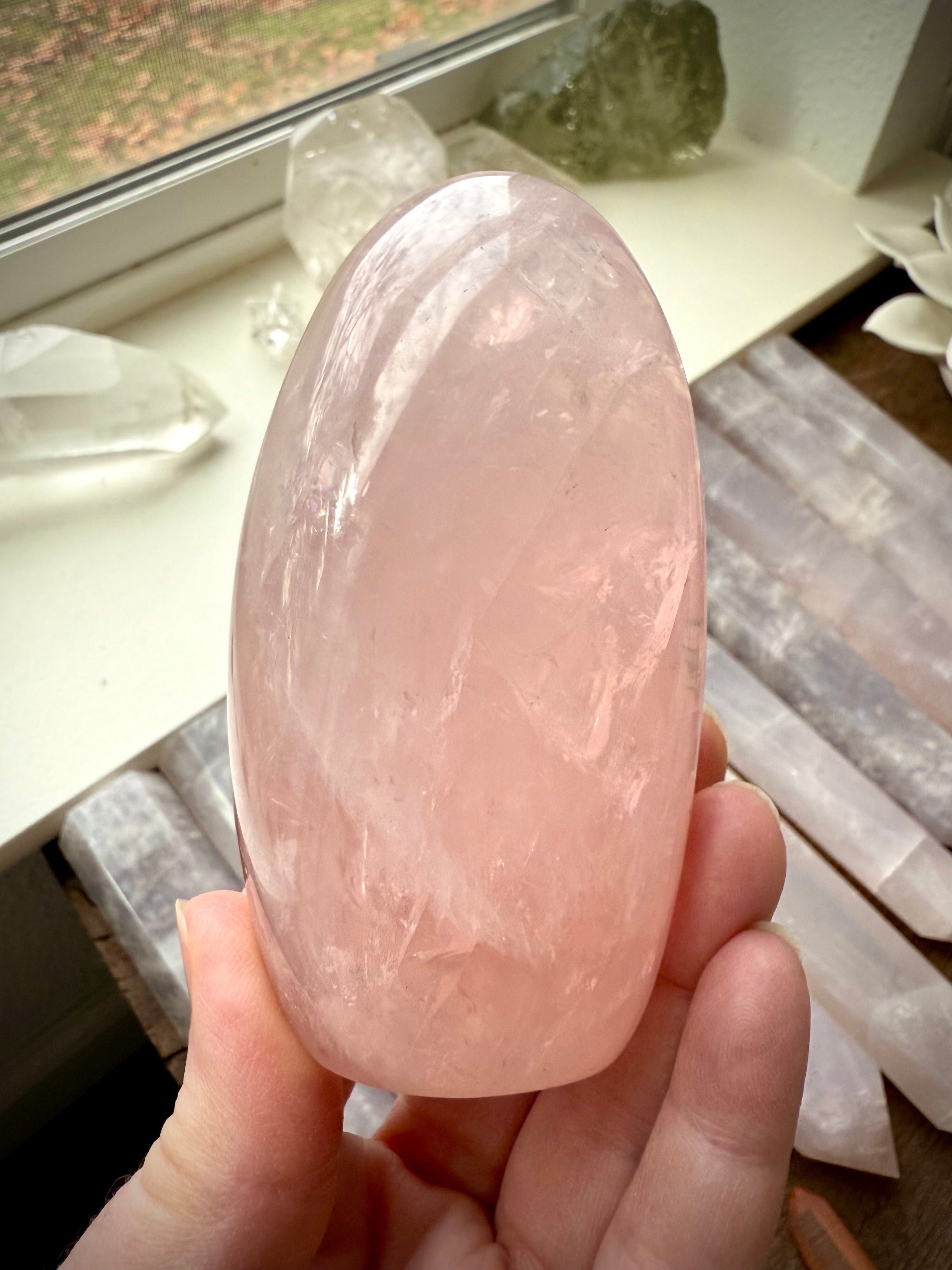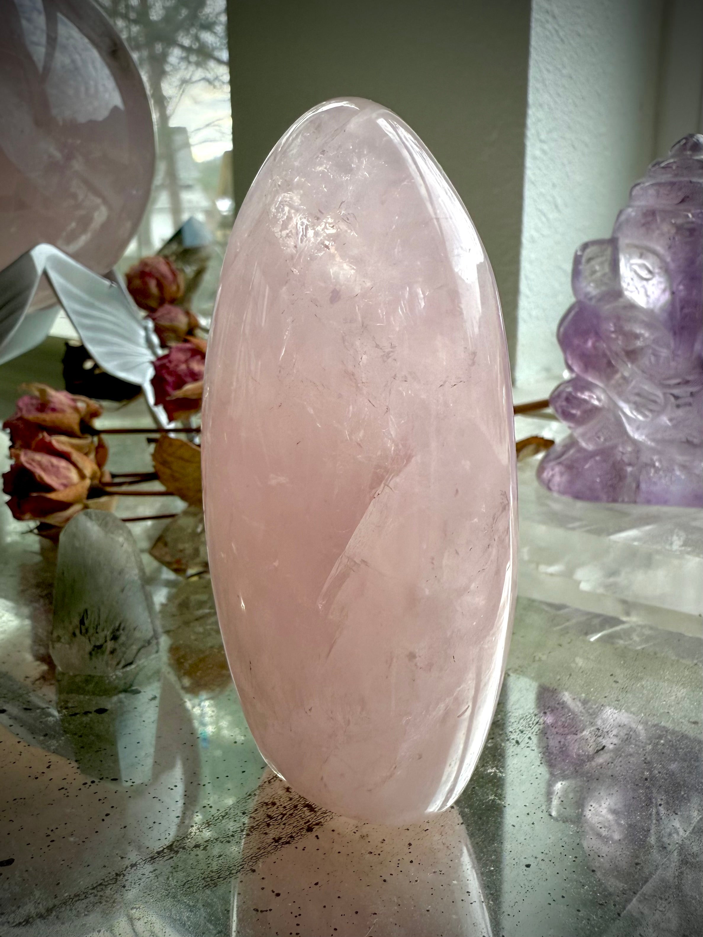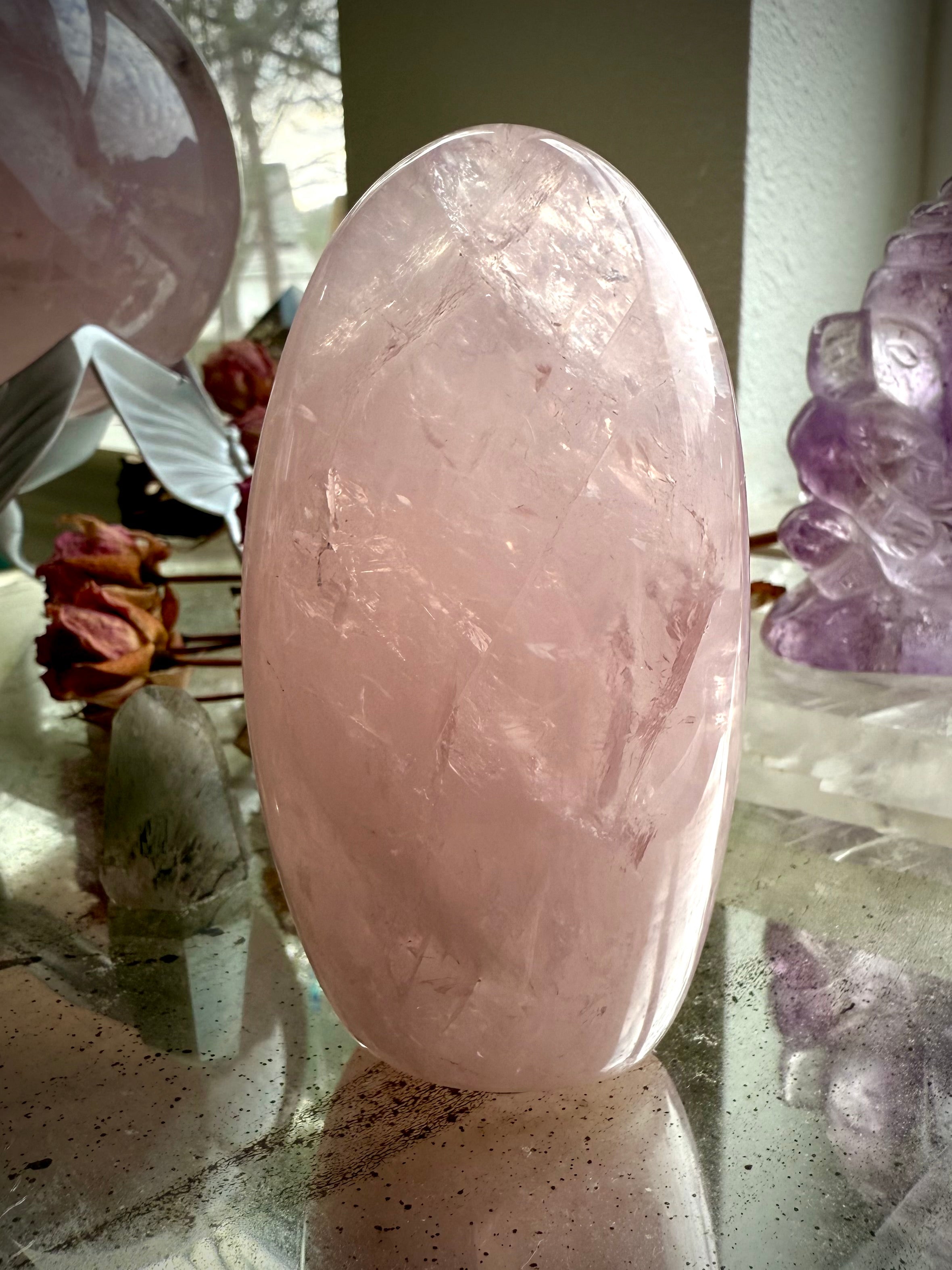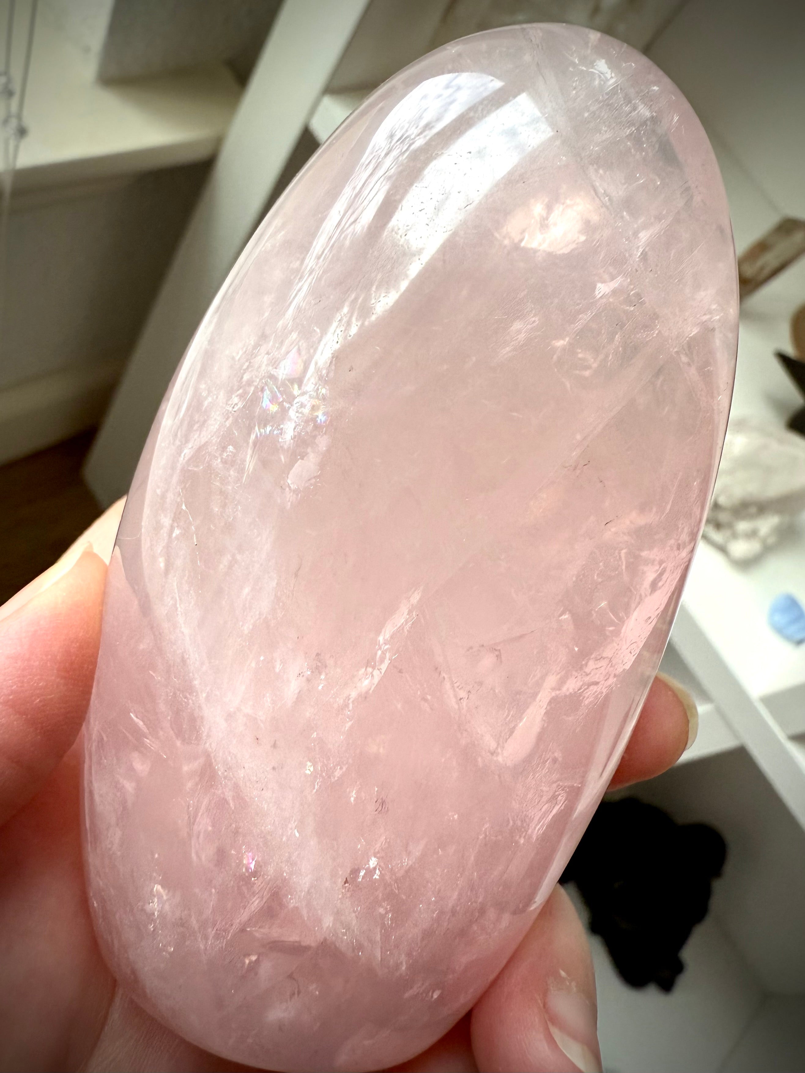 This is a beautiful luminous polished Rose Quartz Crystal with lots of flash + a couple of rainbows too. This soft pink crystal has a calming presence that will bring a steady, soothing energy to your sacred space.