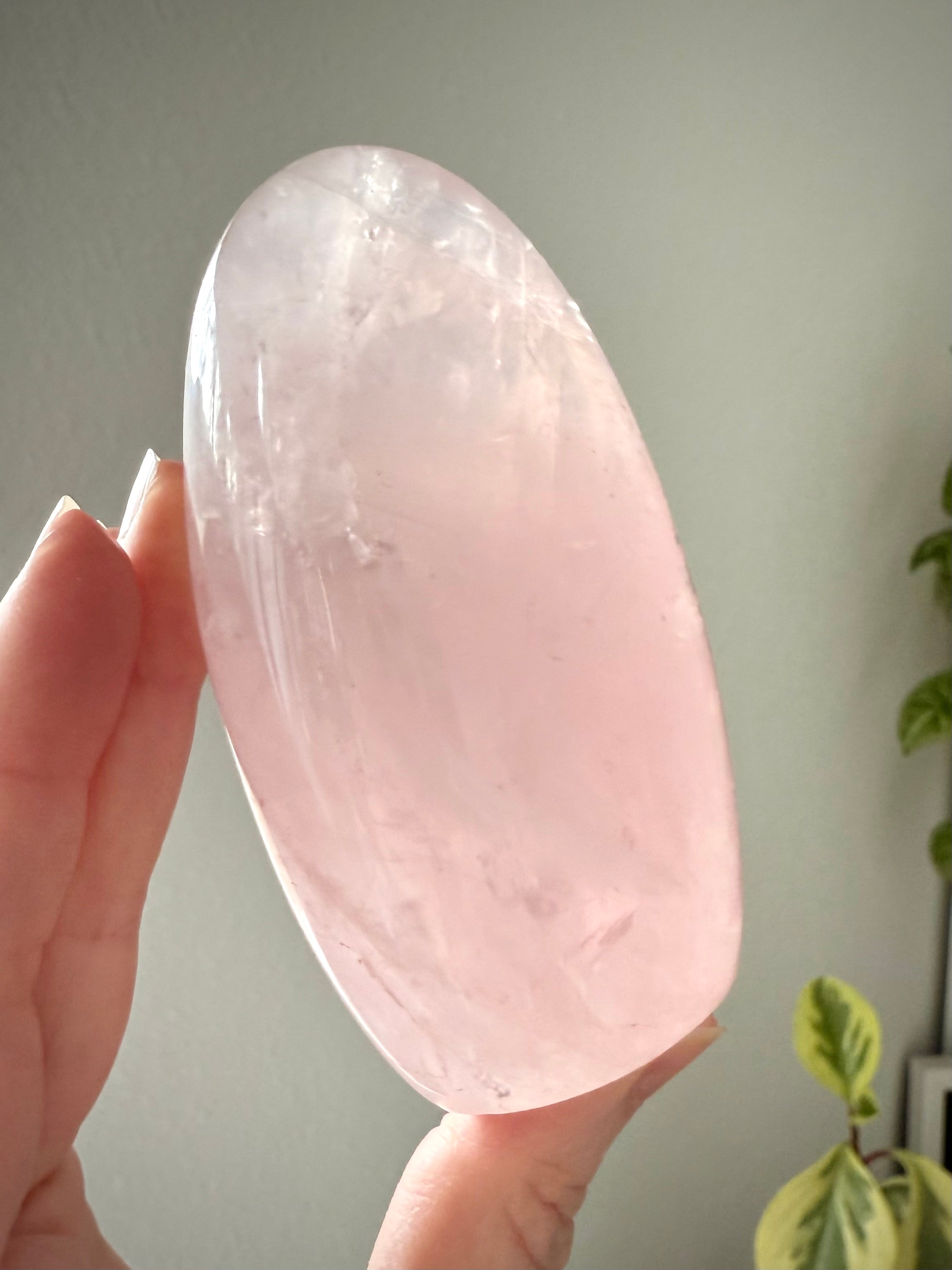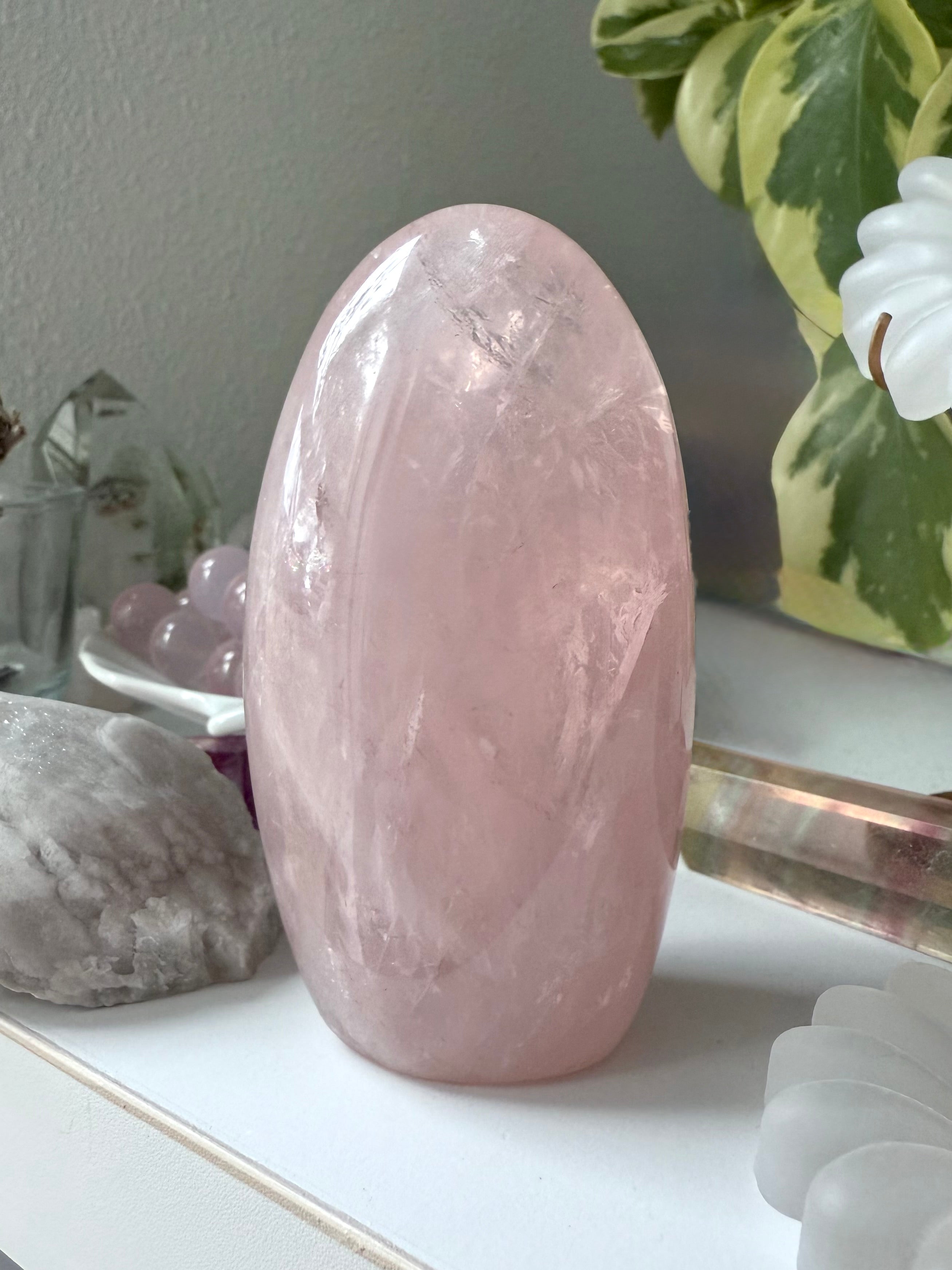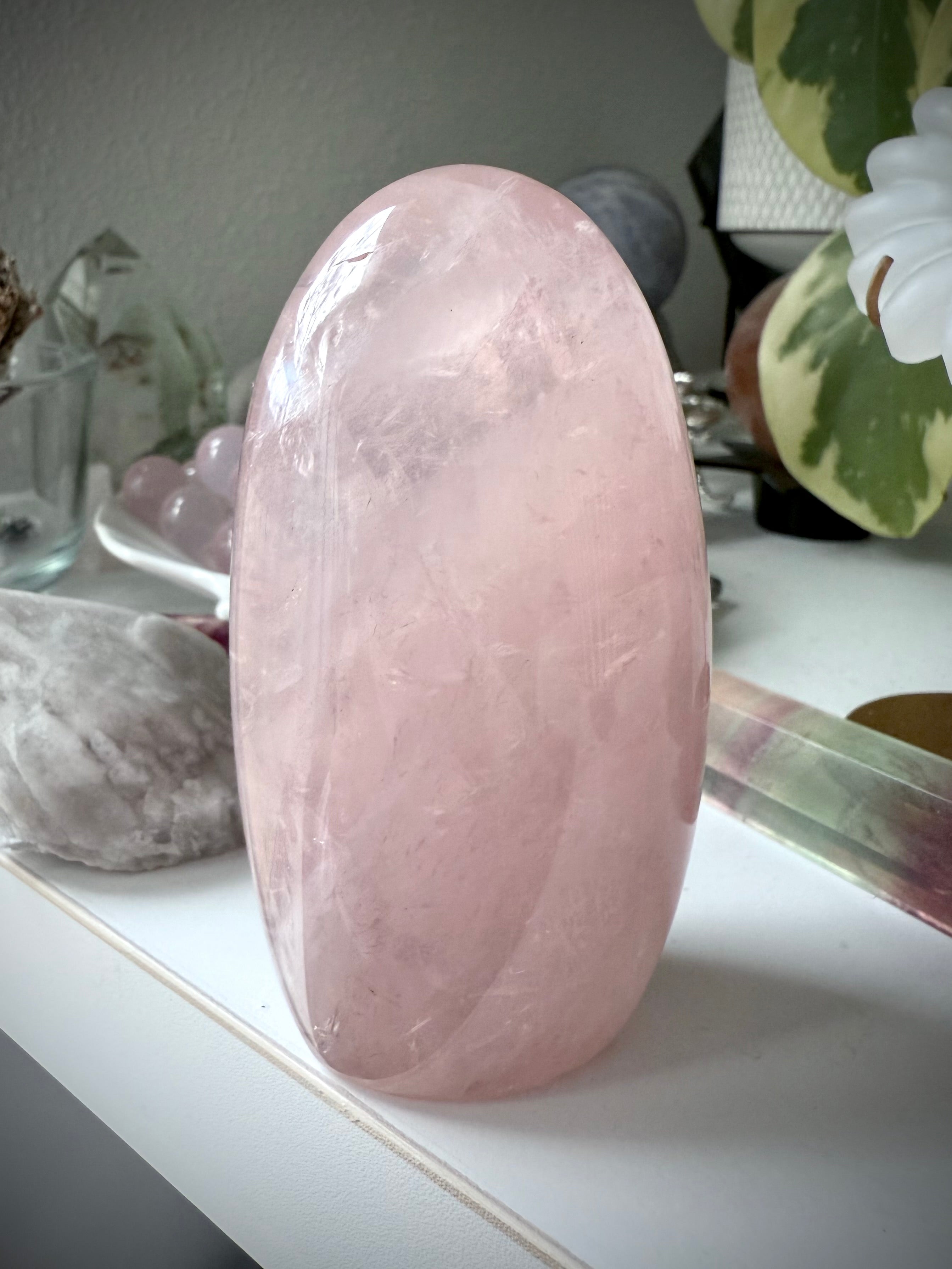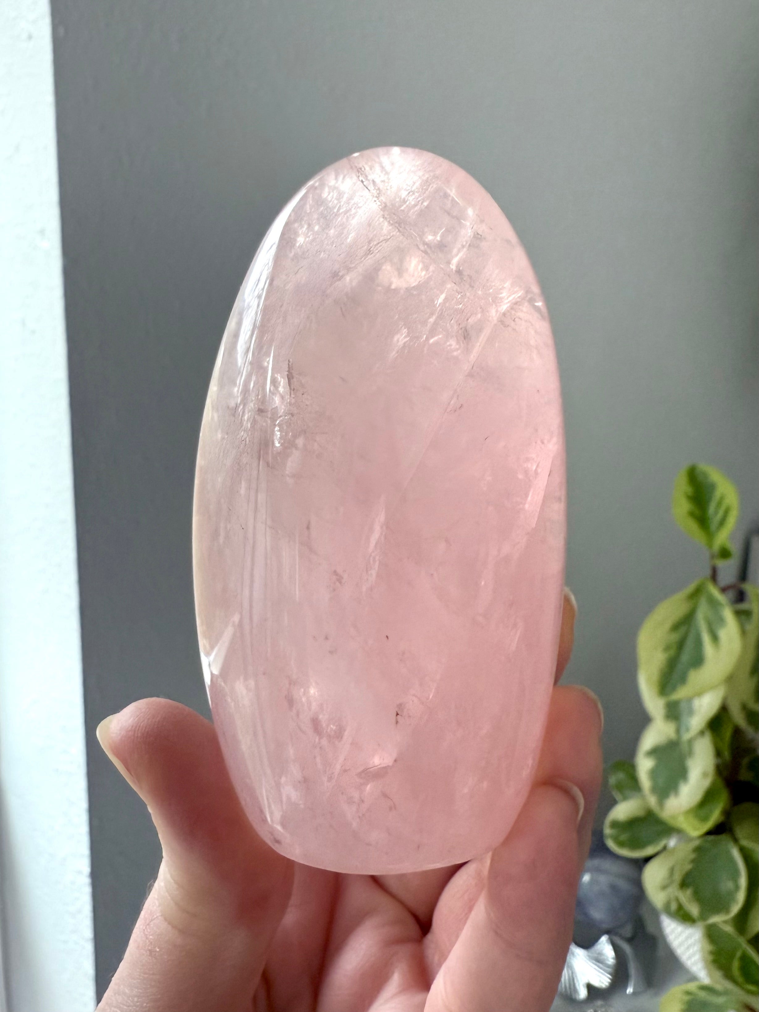 This is a beautiful luminous polished Rose Quartz Crystal with lots of flash + a couple of rainbows too. This soft pink crystal has a calming presence that will bring a steady, soothing energy to your sacred space.